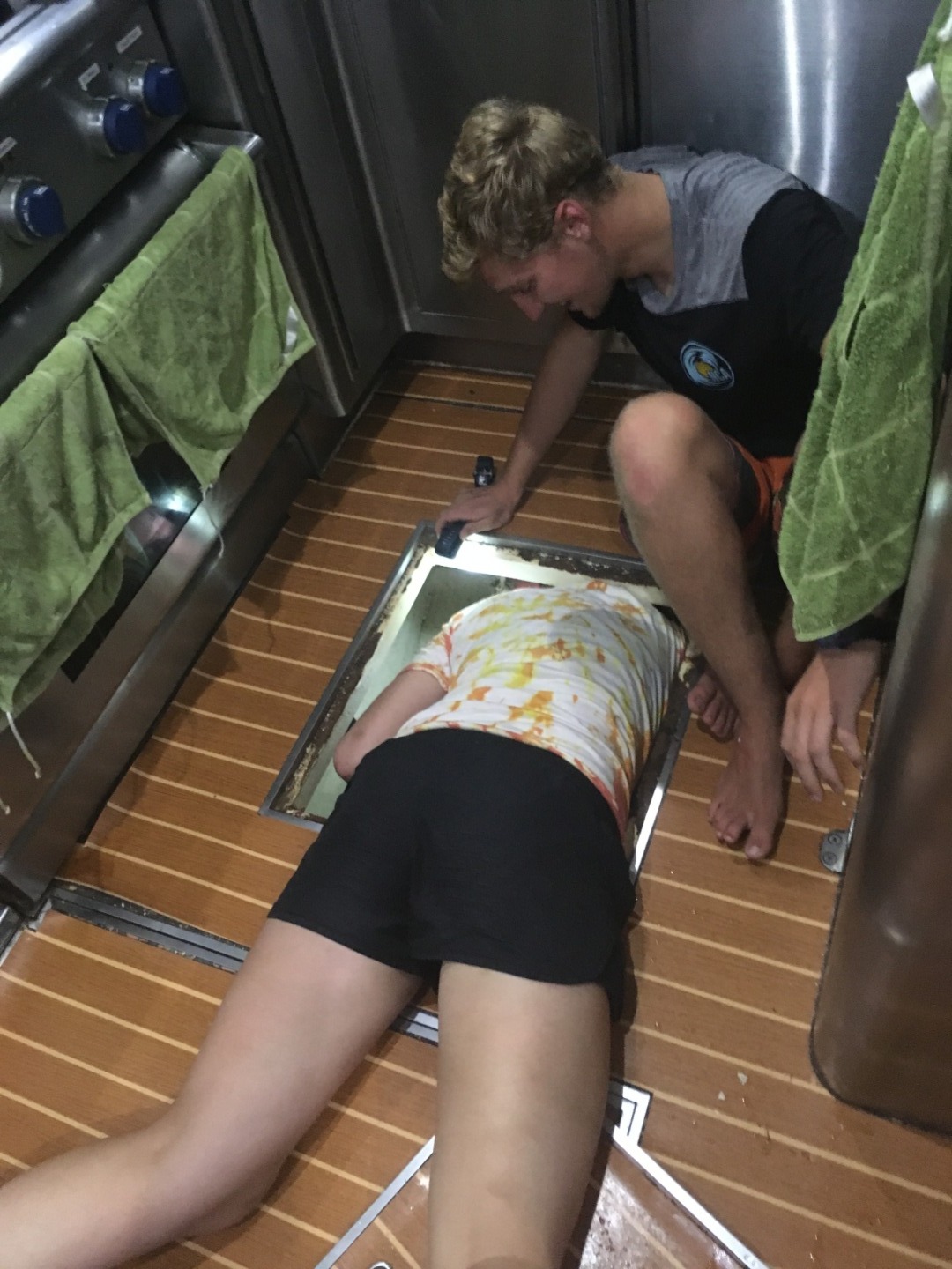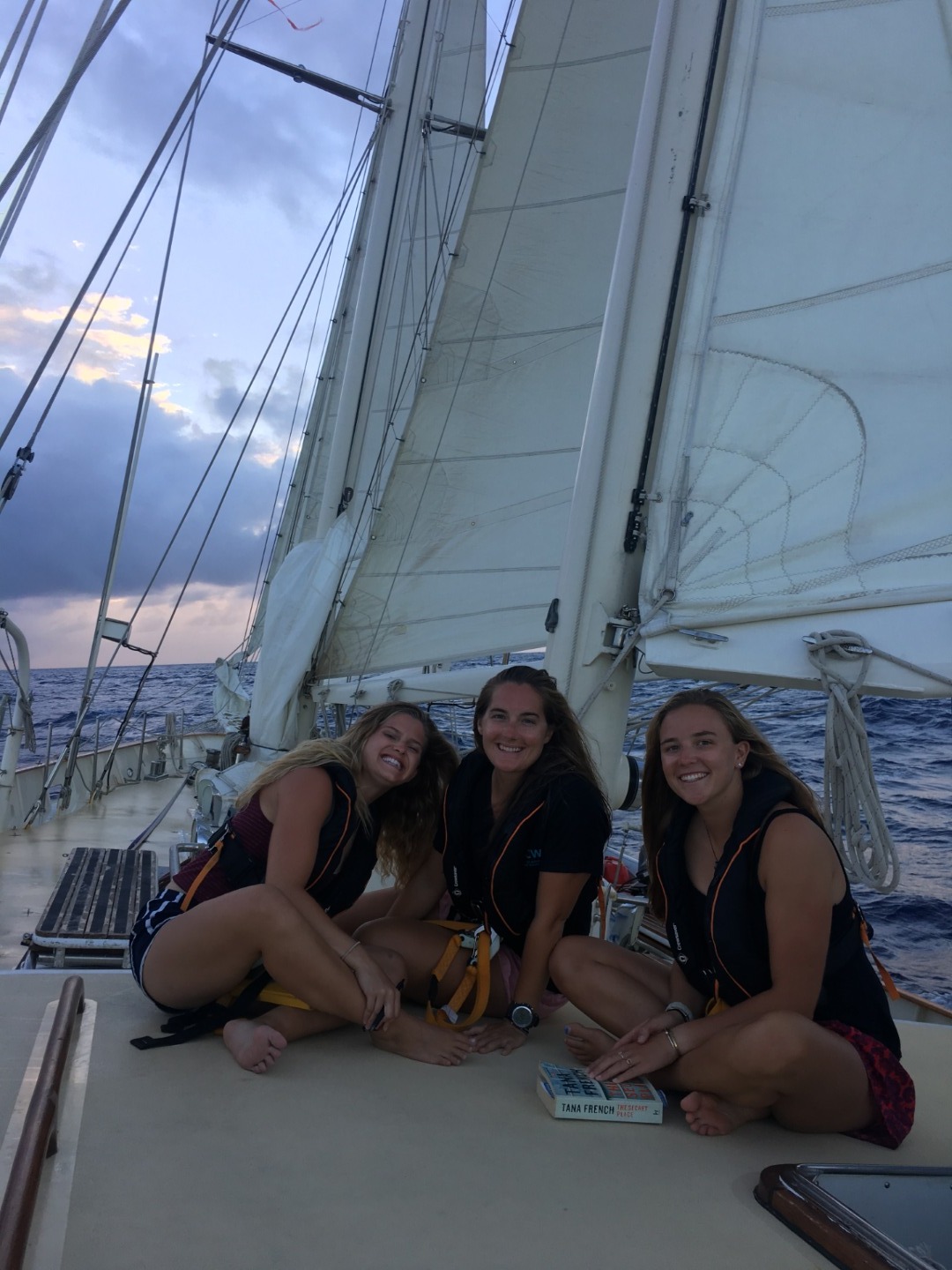 Pictured: Glowy evening sky after the sunset; Dana and James rescuing Dan’s runaway phone after it fell in the bilge; Emmalee, Amanda, and Jackie relaxing on the deck.