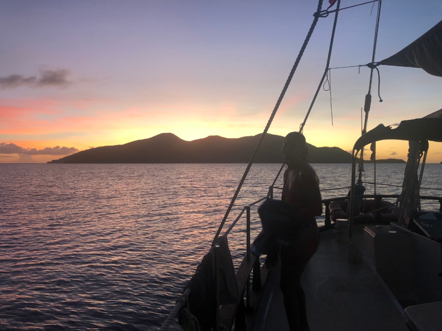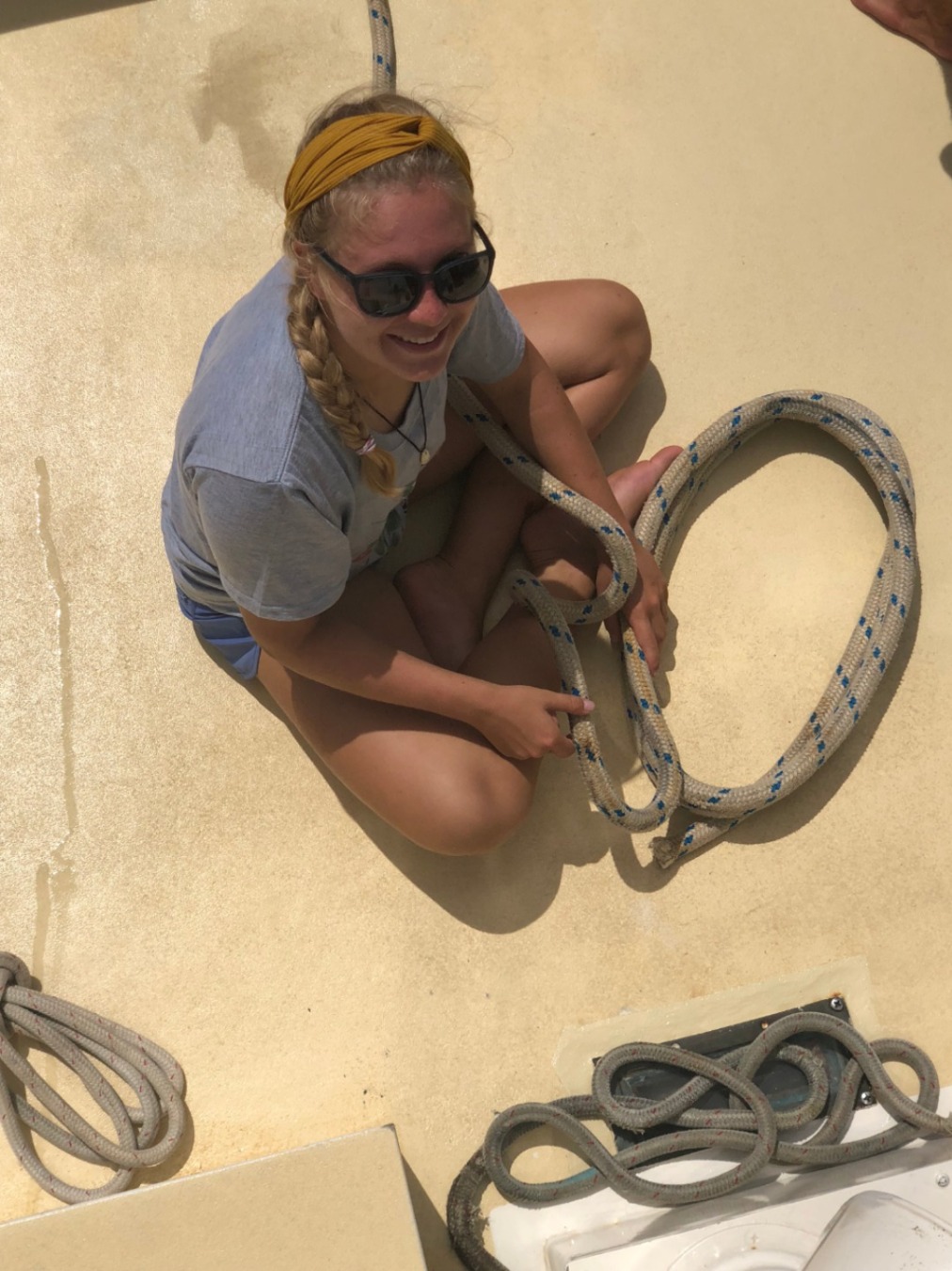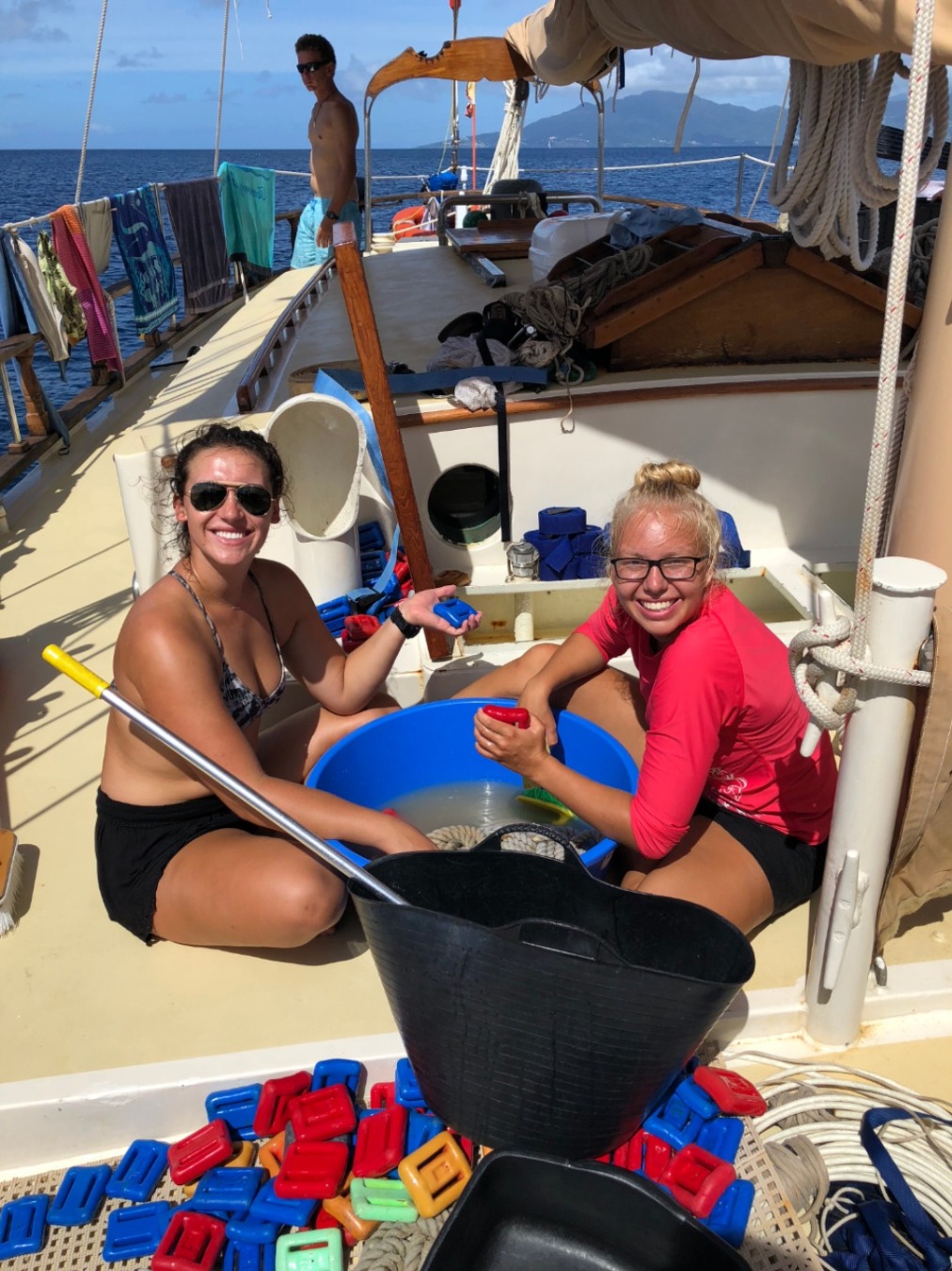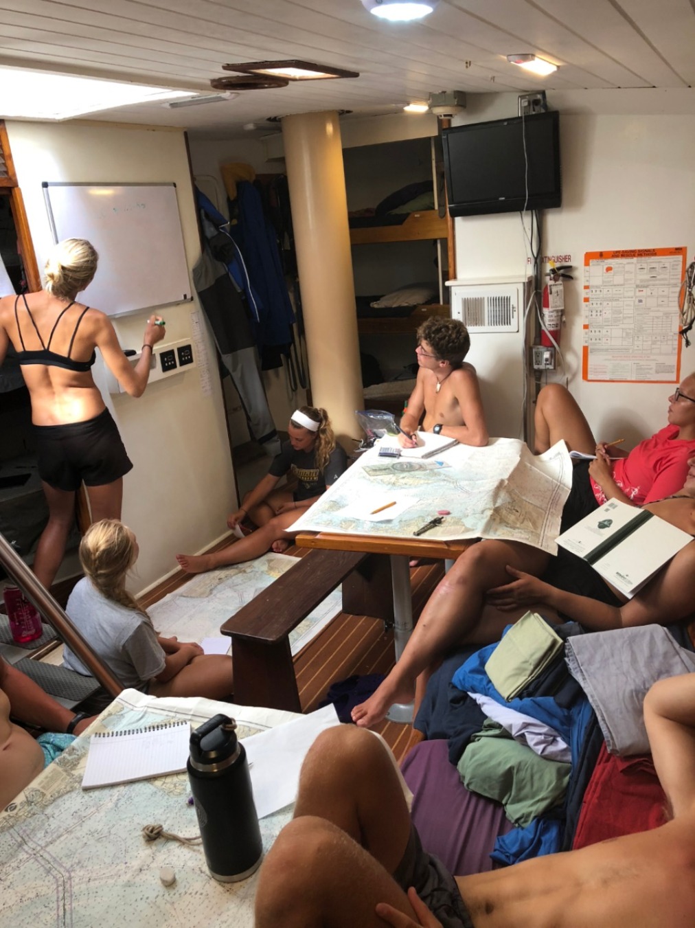 Hello, hello. Hello! Today we woke up in Les Saintes to our first purely sunny day in a little while. We had cereal and fresh bananas from our fruit tour for breakfast before beginning a HUGE boat appreciation. We spent all morning giving Ocean Star some much-needed TLC – organizing the bookshelf, scrubbing walls, floors, cubbies, and bunks, polishing hardware on deck, cleaning outline lockers, tidying sails, and much more. We all got fresh sheets, too, which always feels so amazing. We jammed to some awesome music while we worked – if you stood in a sweet spot under the hatch in the salon, you could hear both the down below and on-deck speakers at once! When we were done, we enjoyed a well-deserved lunch of quesadillas with corn and bean salad as well as starfruit on the side (also from the fruit tour! We snacked on tons of passion fruit throughout the day, too.) Next, we had a Seamanship class where we did some more navigation/chart work involving time, speed, and distance. We were all feeling a little tired-silly, which made the class all the more fun. Afterward, we had free time to rest, chill, and study for tonight’s oceanography quiz. For dinner, we had Asian-style veggies with rice and chicken or tofu – it was so so delicious, thanks to chefs Zach and Syd! For our squeeze question, we talked about our proudest moment from the past year. After clean up, we’ll have Oceanography class, and then it’s off to bed to prepare for a sunrise hike bright and early tomorrow morning!