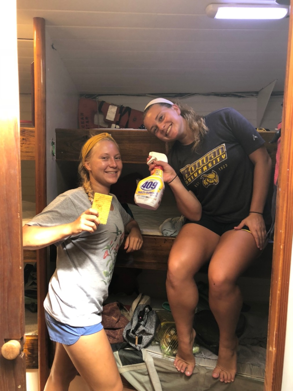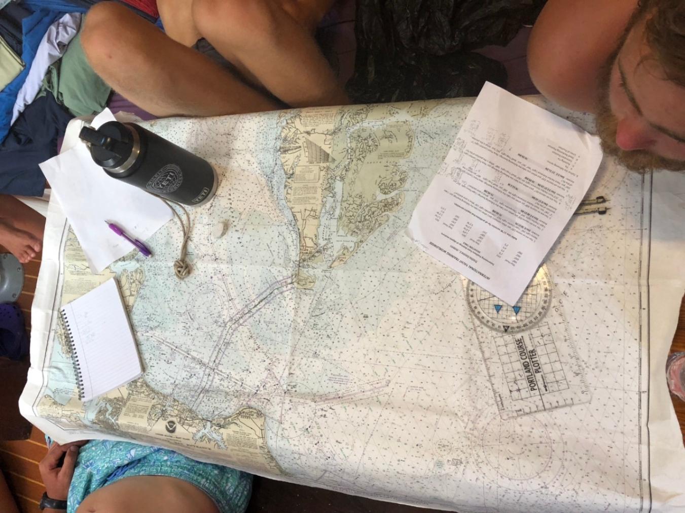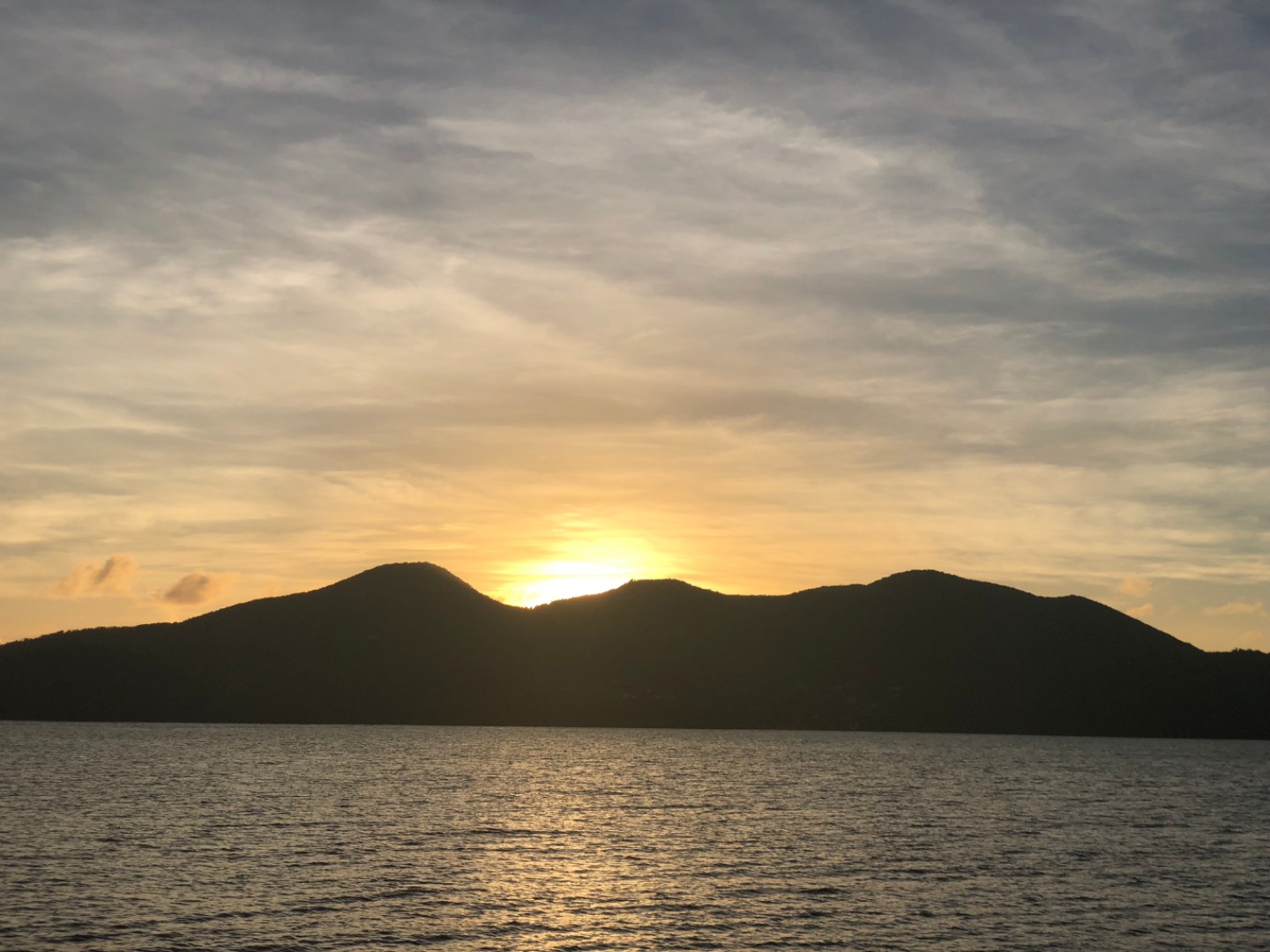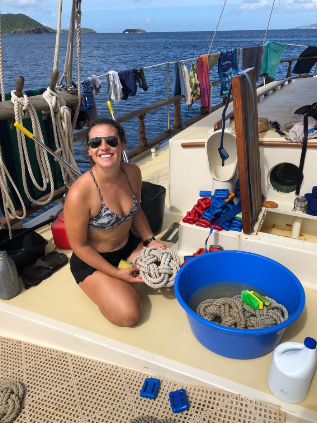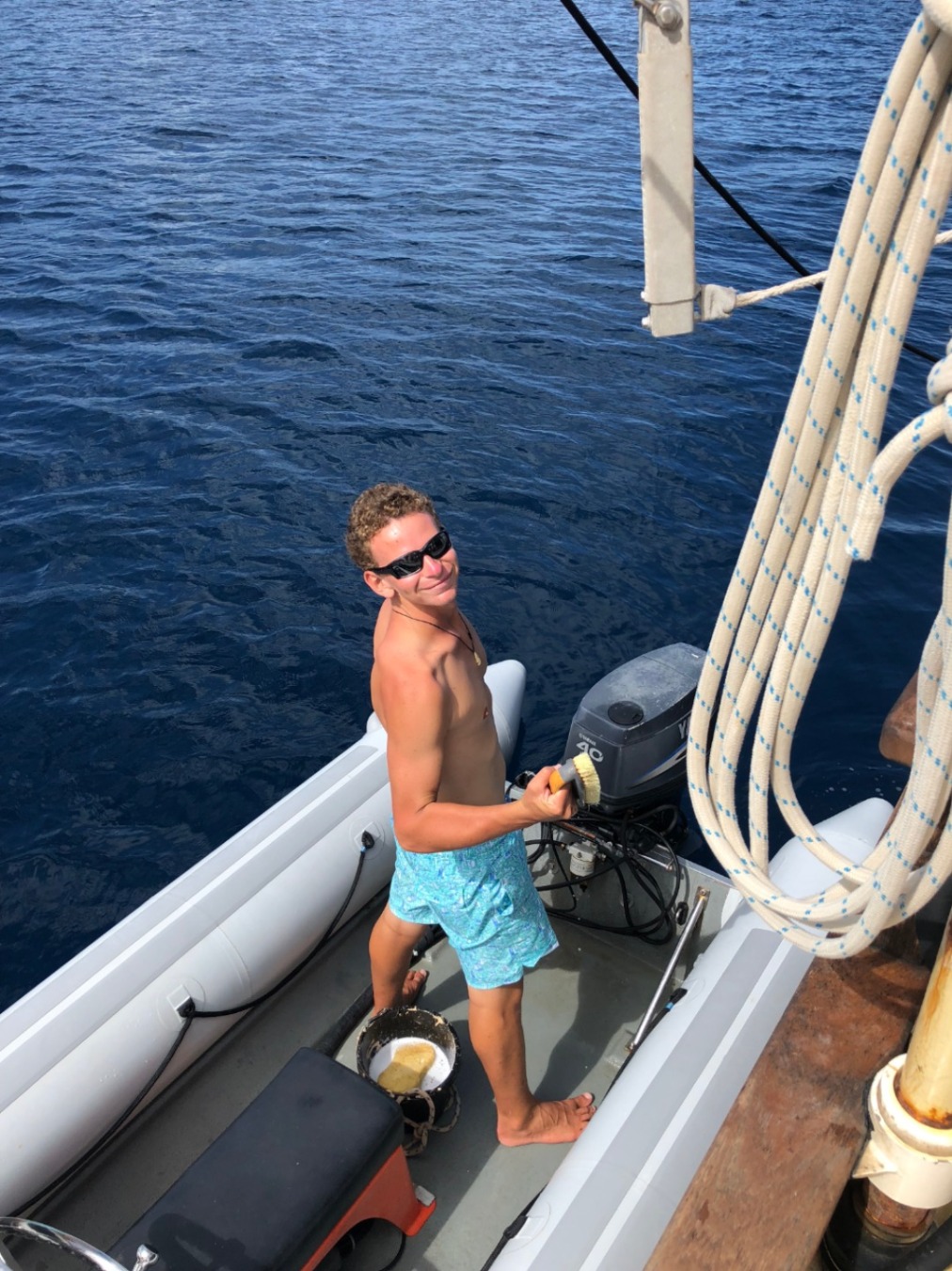 Hello, hello. Hello! Today we woke up in Les Saintes to our first purely sunny day in a little while. We had cereal and fresh bananas from our fruit tour for breakfast before beginning a HUGE boat appreciation. We spent all morning giving Ocean Star some much-needed TLC – organizing the bookshelf, scrubbing walls, floors, cubbies, and bunks, polishing hardware on deck, cleaning outline lockers, tidying sails, and much more. We all got fresh sheets, too, which always feels so amazing. We jammed to some awesome music while we worked – if you stood in a sweet spot under the hatch in the salon, you could hear both the down below and on-deck speakers at once! When we were done, we enjoyed a well-deserved lunch of quesadillas with corn and bean salad as well as starfruit on the side (also from the fruit tour! We snacked on tons of passion fruit throughout the day, too.) Next, we had a Seamanship class where we did some more navigation/chart work involving time, speed, and distance. We were all feeling a little tired-silly, which made the class all the more fun. Afterward, we had free time to rest, chill, and study for tonight’s oceanography quiz. For dinner, we had Asian-style veggies with rice and chicken or tofu – it was so so delicious, thanks to chefs Zach and Syd! For our squeeze question, we talked about our proudest moment from the past year. After clean up, we’ll have Oceanography class, and then it’s off to bed to prepare for a sunrise hike bright and early tomorrow morning!