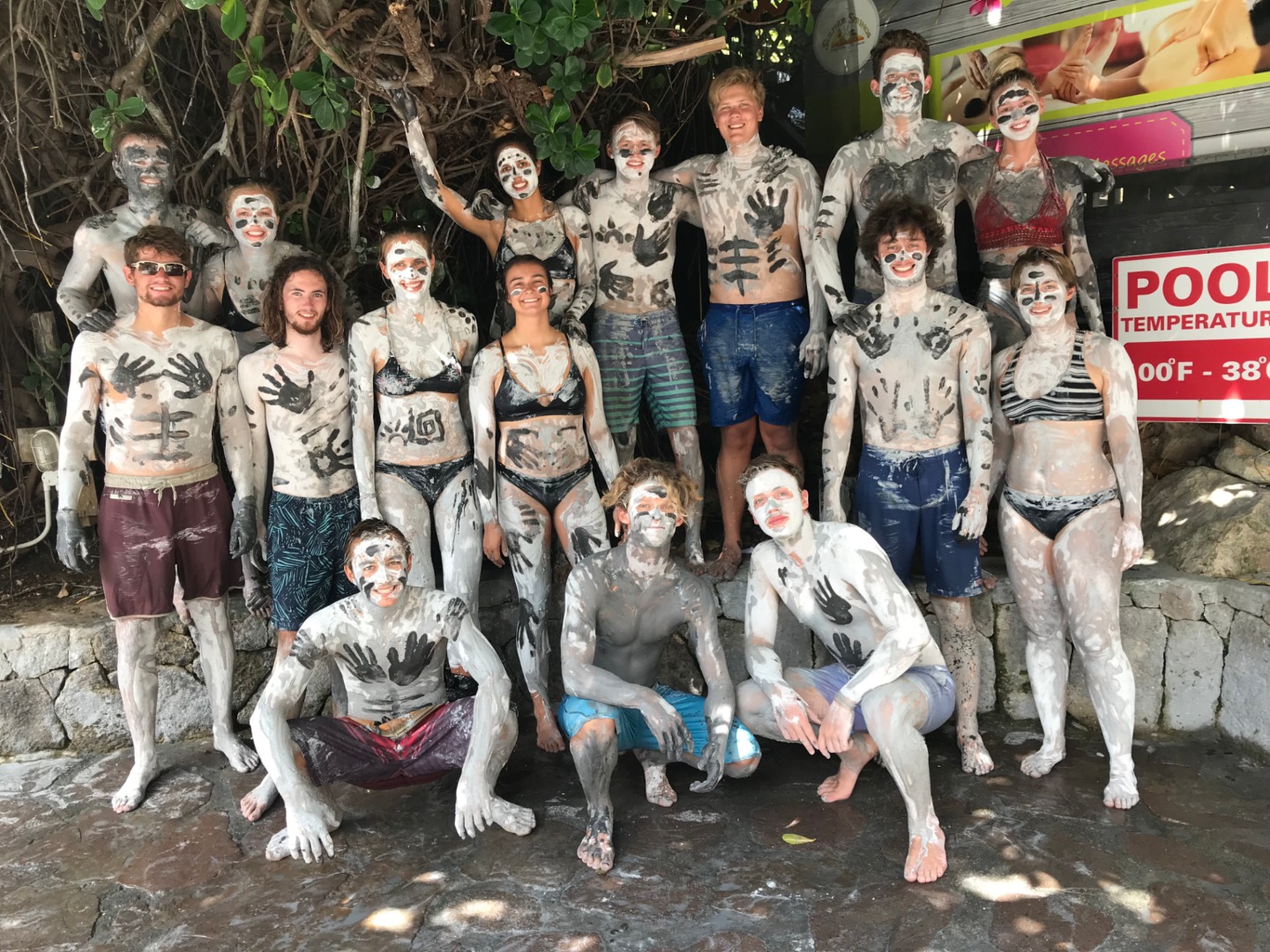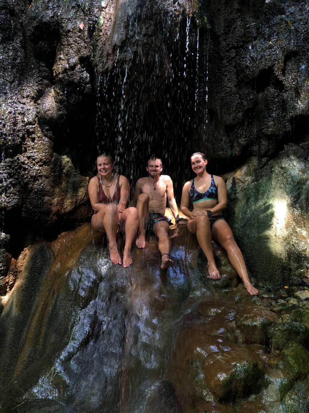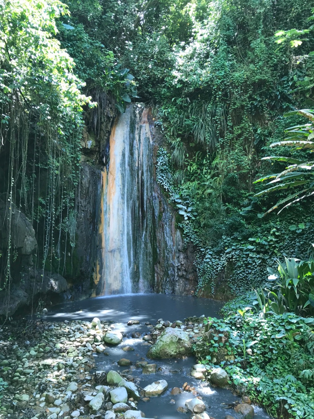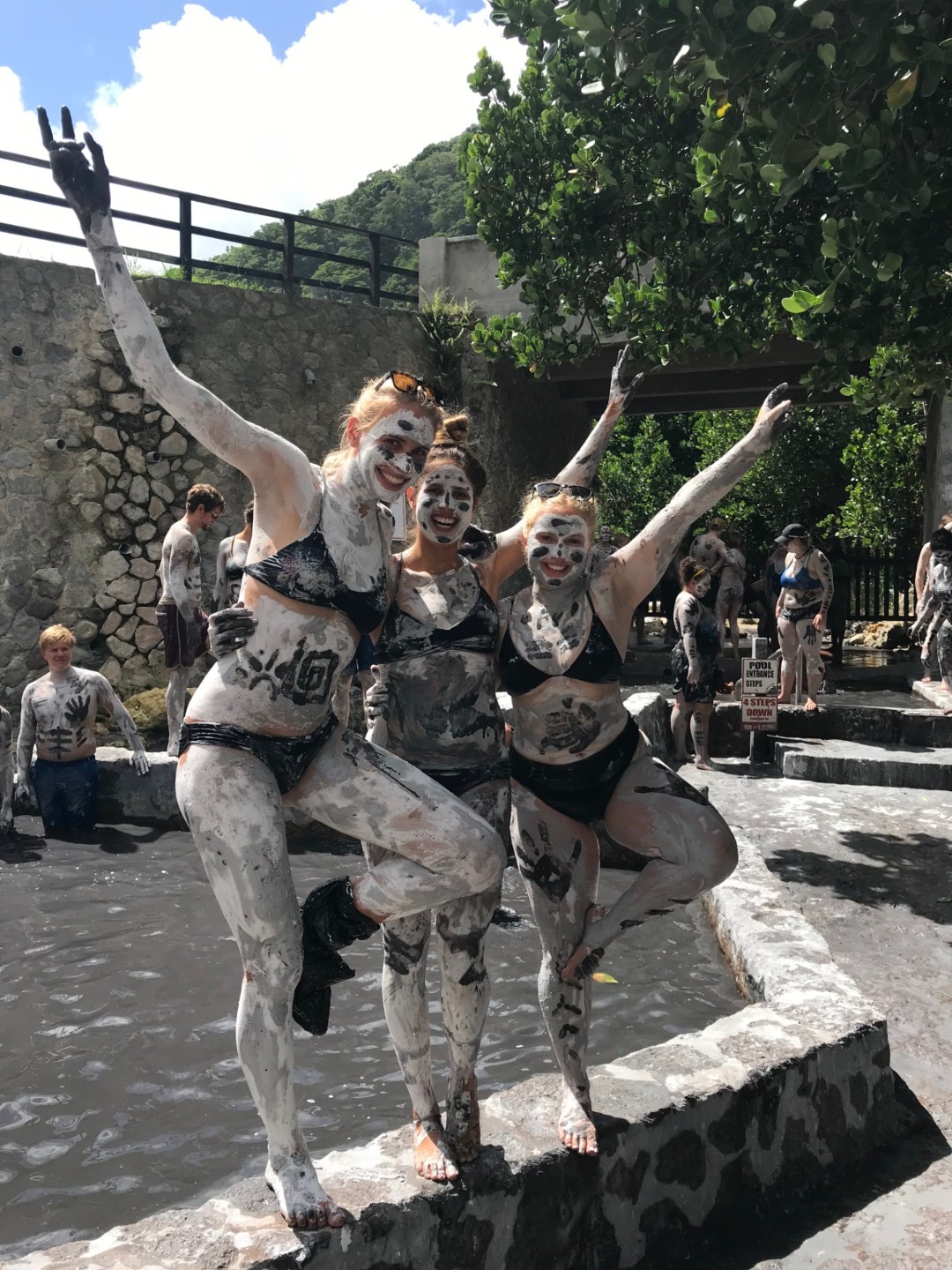Amy and I stayed onboard to do vessel watch and routine maintenance. At the same time, the rest of the group was dropped on shore and met a local tour guide who took them to the visitor center to view informational videos and models that explained how the stunning islands Pitons and the caldera were formed, then went on a guided tour of the caldera before relaxing into a volcanic mud bath. The mud baths consisted of several very warm (read HOT) pools of springs water full of minerals, which we soaked in to open up our pores and relax our bodies. Then we rubbed the gray and black mineral mud all over ourselves to cleanse and purify our skin. After washing off, it was back in the taxi for a short drive to the Diamond Botanical Gardens. The tour guide here referred to himself as the “human Internet.” He showed us around the gardens and the beautiful Diamond waterfall while reciting a wealth of information on the local flora. As if one waterfall wasn’t enough, we then headed to the Mineral Springs waterfall to finish off our spa treatment day. The water here is rumored to be good for rheumatism, eczema, and other aches and pains. Jade made it her personal mission to relax everyone as much as possible and went around putting leaves over our eyes.