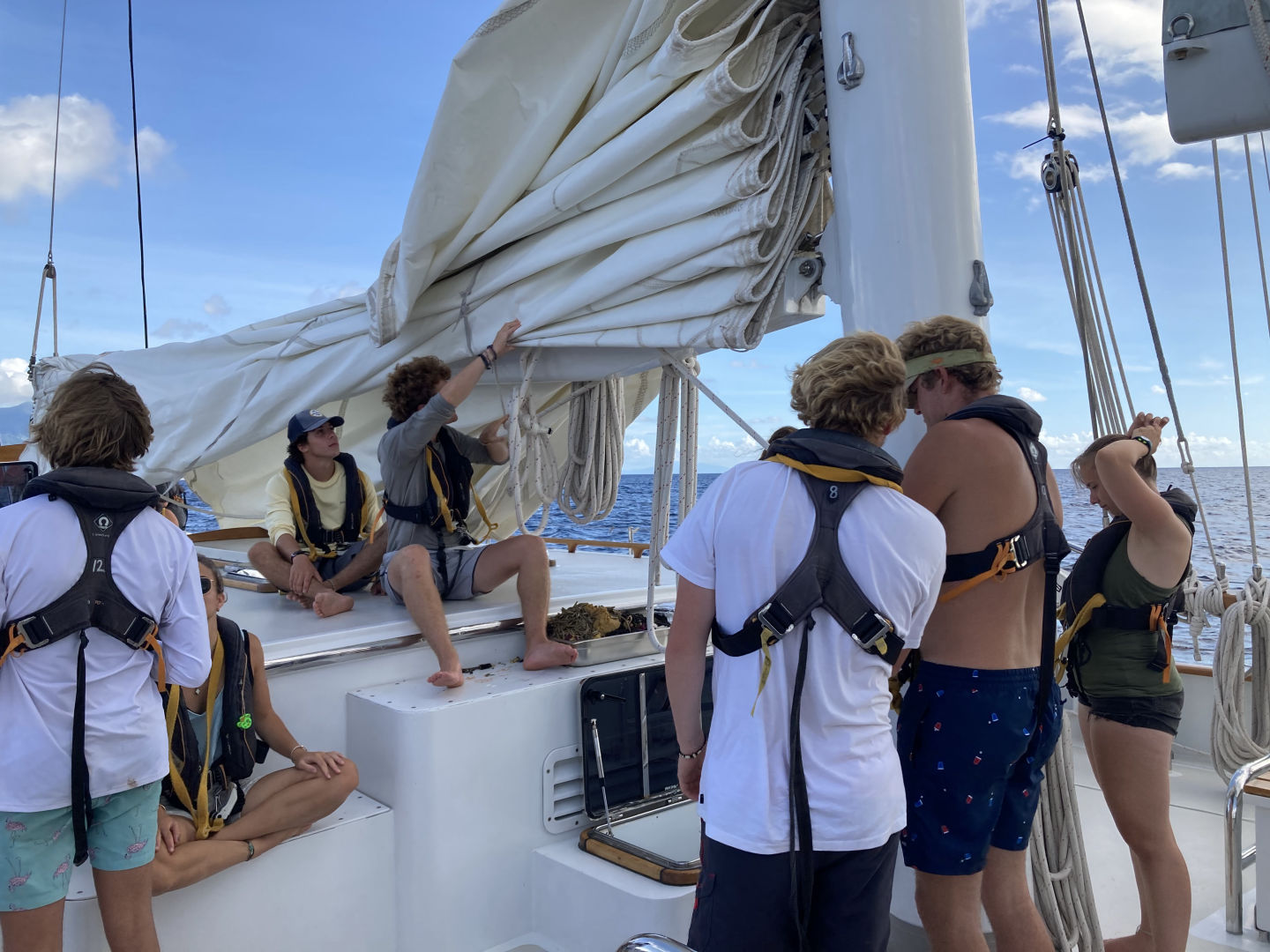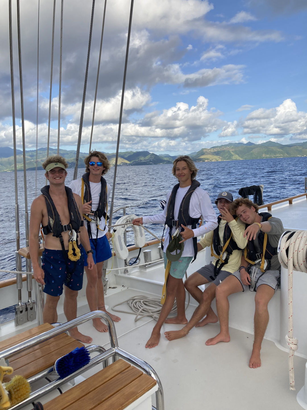After waking up to an amazing breakfast of chia seed and plantain pudding, we cleaned up and took our last Oceanography Exam. We had voted in our student-led passage leaders just the night before, and we got ready to go for our last passage led by us students. The roles were as follows: Amelia as Captain, Emy as First Mate, Skylar, Julia, and Isabelle B as Navigators, Rachel as Engineer, and Hendo, Maya, and Jac as Watch Team Leaders. We put the boat into shape for passage, and all our leaders ensured we did what we needed to get off the dock. With a little help from our staff, our student leaders coordinated when we took off, how best to get to Antigua, how to turn on and work with the engine, generators, and water-maker, when and where to organize our crew to take up anchor and raise the forward staysail, main staysail, and the FULL MAIN SAIL! (So freakin’ cool!), and finally, how to make our way to our final destination. We presented our Oceanography project presentations after Jimmy swam back to our Vela after taking off our dock lines. We presented on topics such as how salinity is affected by various weather and climate phenomenon and what types of fish we saw based on location and distance from land. We rolled into watch teams, the staff giving entire vessel operations over to the leaders. While this was terrifying and a bit stressful, it was at the same time one of the most invigorating and beautiful feelings we had experienced because having that much responsibility and power showed all of us how far we had come as a family.