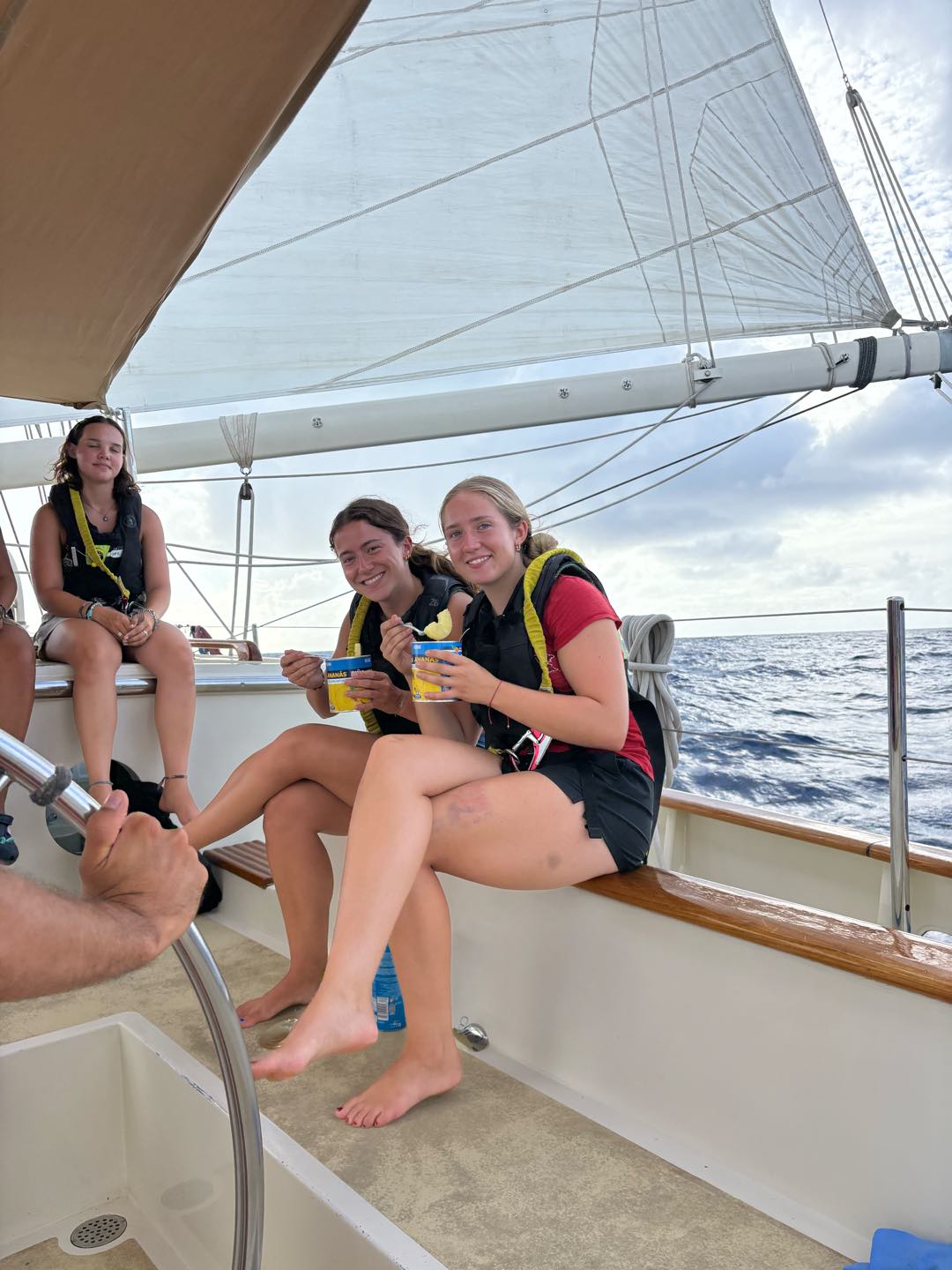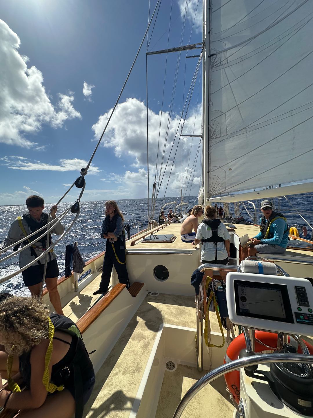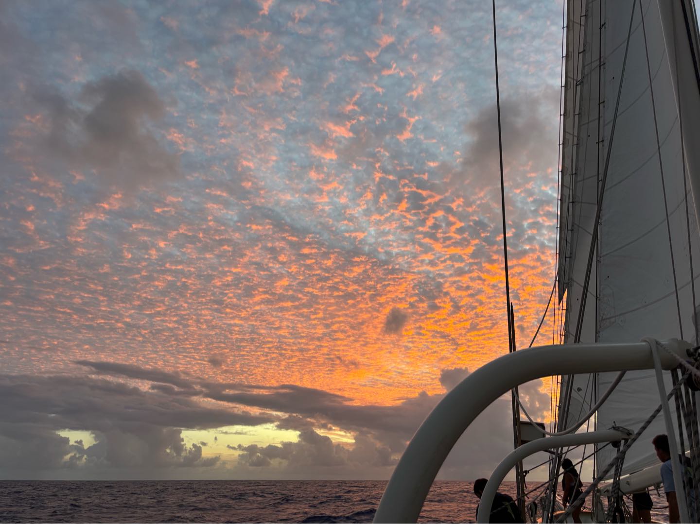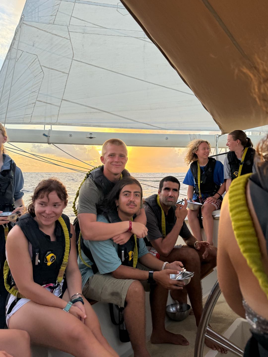 It was the last time I was skipper. Watch team 4 was woken up bright and early at 3:30 am for their 4:00 watch. A tiring and long watch, but greeted with a pretty sunrise and a rainbow on a fat, fluffy cloud. Maria won the first time in the Forb competition with the sunrise time of 7:34. As watch team 5 took over the watch at 8, some of us went back to bed while others crammed for our marine bio final exam. I attempted to study for it, but unfortunately, my motivation had other plans. My fearful watch team leader, Shane, aka goatie wannabe one and only, was our head chef today and whipped out some surprisingly scrumptious black bean burritos. Who would have thought dried black beans would taste so good? Then, it was time to take our final exam. I cant say it was my best test, but certainly not the worst (sorry Megatron). As everyone gradually turned in their exam, some of us celebrated our last test with some canned fruits and Pringles, while others were called to gybe the sails. Everyone gathered in the cockpit after some efficient sail handling to hide from the sun and jam to some music. Right as we started having fun, Charlie Blake (my fearful og watch team leader) called us down for our first and last VHF class. The watch team 4 went straight back to watch as soon as class ended, where we snacked on more Pringles and canned pineapples. Soon enough, dinner came along with chicken curry (definitely top 3 curries so far), and we ended with the squeeze question, What was one of your fondest high school memories? Everyone shared a beautiful, insightful memory as we ended he day with cleanup and a magnificent sunset.
