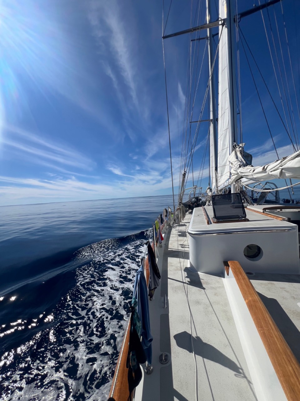 After lunch, if today were just a regular passage day, we would have gone straight into class, BUT today wasn’t like just any other day remember how I said the ocean was flat as a lake? You know what that means. OCEAN SWIM!!!!!! After cleaning up from lunch, everyone ran down below and switched out their PFDs for bathing suits, and the fun began! Speakers blasting music, flip off the bow spirit, lemon drops, dives, ocean showers, some pushup workout by Jesse, Luke, Theo, and Boston basically, we had a mega pool party in the middle of the ocean with 2000m of deep blue under us.