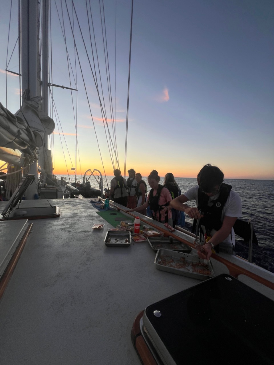 At 1800, dinner was served! BUT WAIT! A pod of Bottlenose Whales was spotted just about 100m off our starboard side! It was epic! We all watched them in awe for a few minutes before they dove down into the deep blue. The sun set ahead of us as we all devoured our plates, leaving no scrapes behind. Just as we gathered everyone for squeeze, a pod of dolphins decided to go nuts off our port side. Leaping over 2 meters in the air, putting on a show for all of us.
