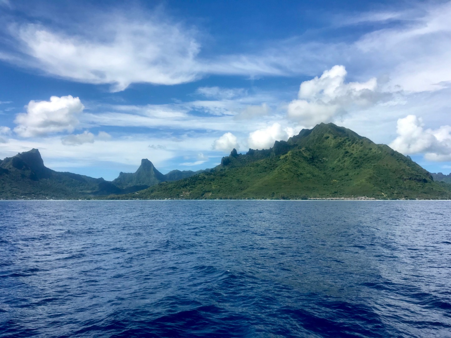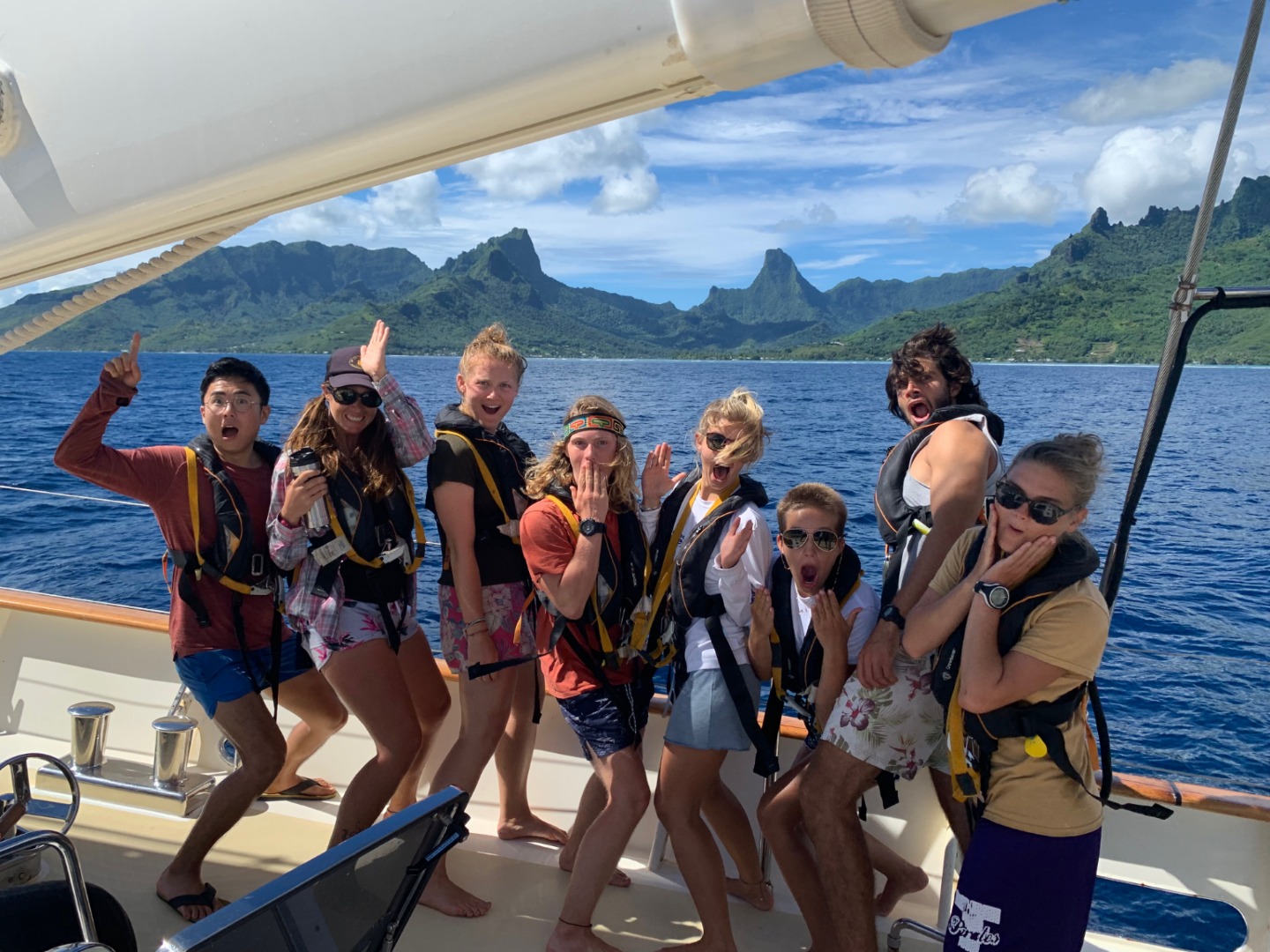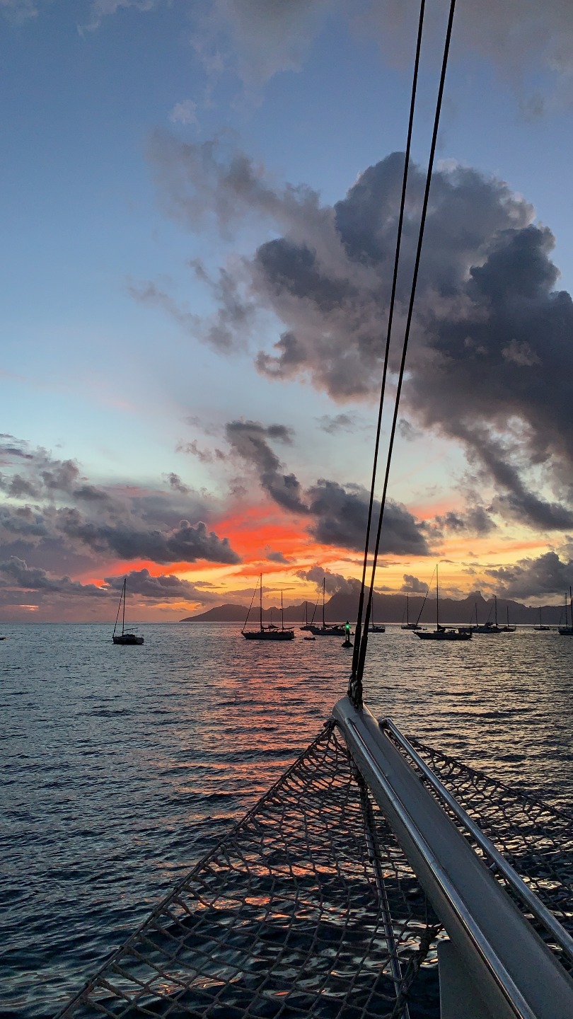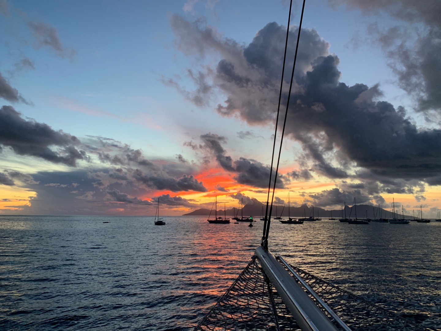 Waking up to a beautiful and lush green island around us has been my favorite part of our time in Moorea, and this morning’s sunrise is coming over the hills and lighting up Opunohu Bay was the cherry on top to our last few hours before heading to Tahiti. We were treated to a delicious crumb cake, and yogurt for breakfast, after which everyone worked double-time to complete passage prep so we could get anchors up as soon as possible. Sails were raised as we brought up the anchor, and the crew gathered in the cockpit to start our last passage. During our usual count off to make sure we didn’t forget anyone, we made sure to work in a surprise singing of happy birthday to Jenna!
