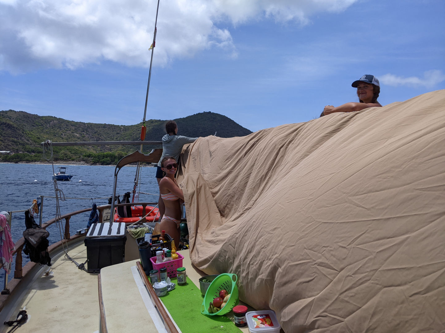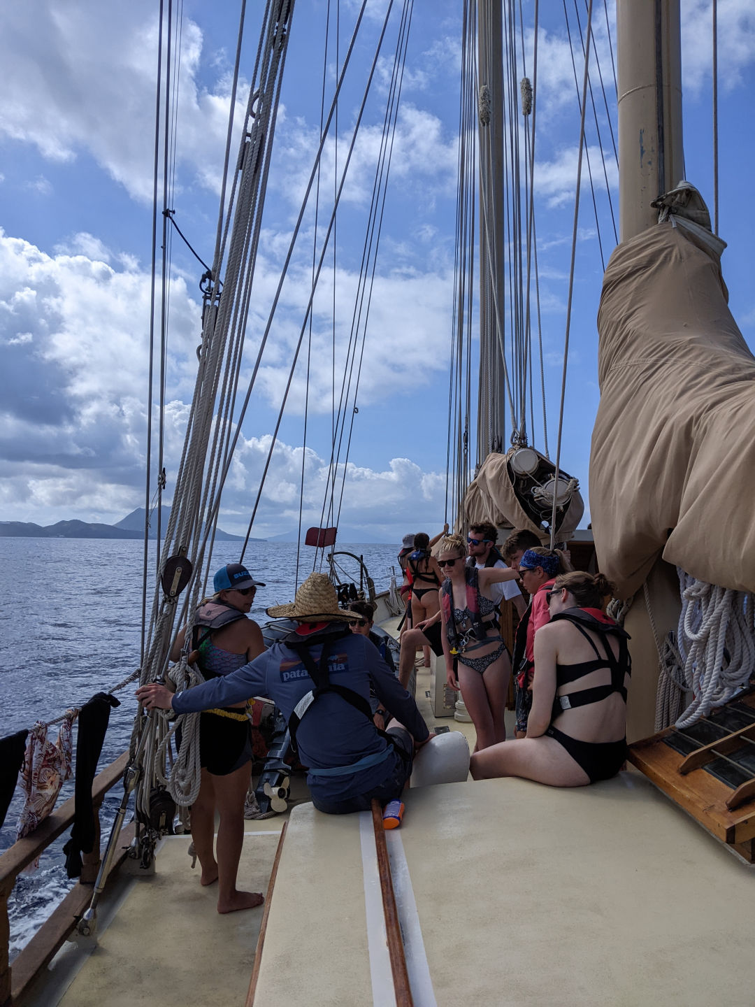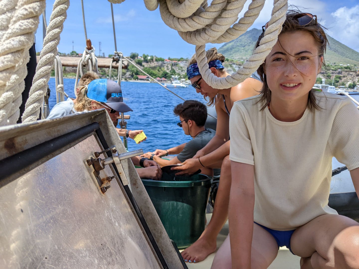 Once everyone had finished a leisurely breakfast and clean up, it was time for a knots class on deck with Nick. I’m knot sure how much was actually learned about knots but heard talk of a “Bunny coming out a hole, going round a tree and back in its hole,” lassoing a horse, and the infamous Dragon Bowline. Everyone also practiced coiling lines on pins, storing lines as gasket coils, and making off pins and cleats. This all happened as we made our way towards our next destination of, Statia, an island that is also in the Dutch Caribbean along with Saba and Sint Maarten. Towards the end of class, we arrived at the anchorage, so a team prepped for the anchor drop. This involves raising the port anchor from its cradle (Aubrey, Beau, and Sydney) and hanging off the side with someone standing by with a line in hand, ready to drop (Joelle) when the helmsman says so. Another person is ready on the brake to control how much chain we let out (Maddie).