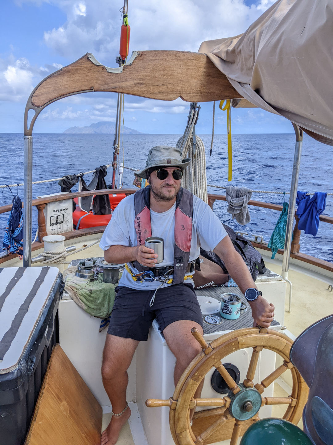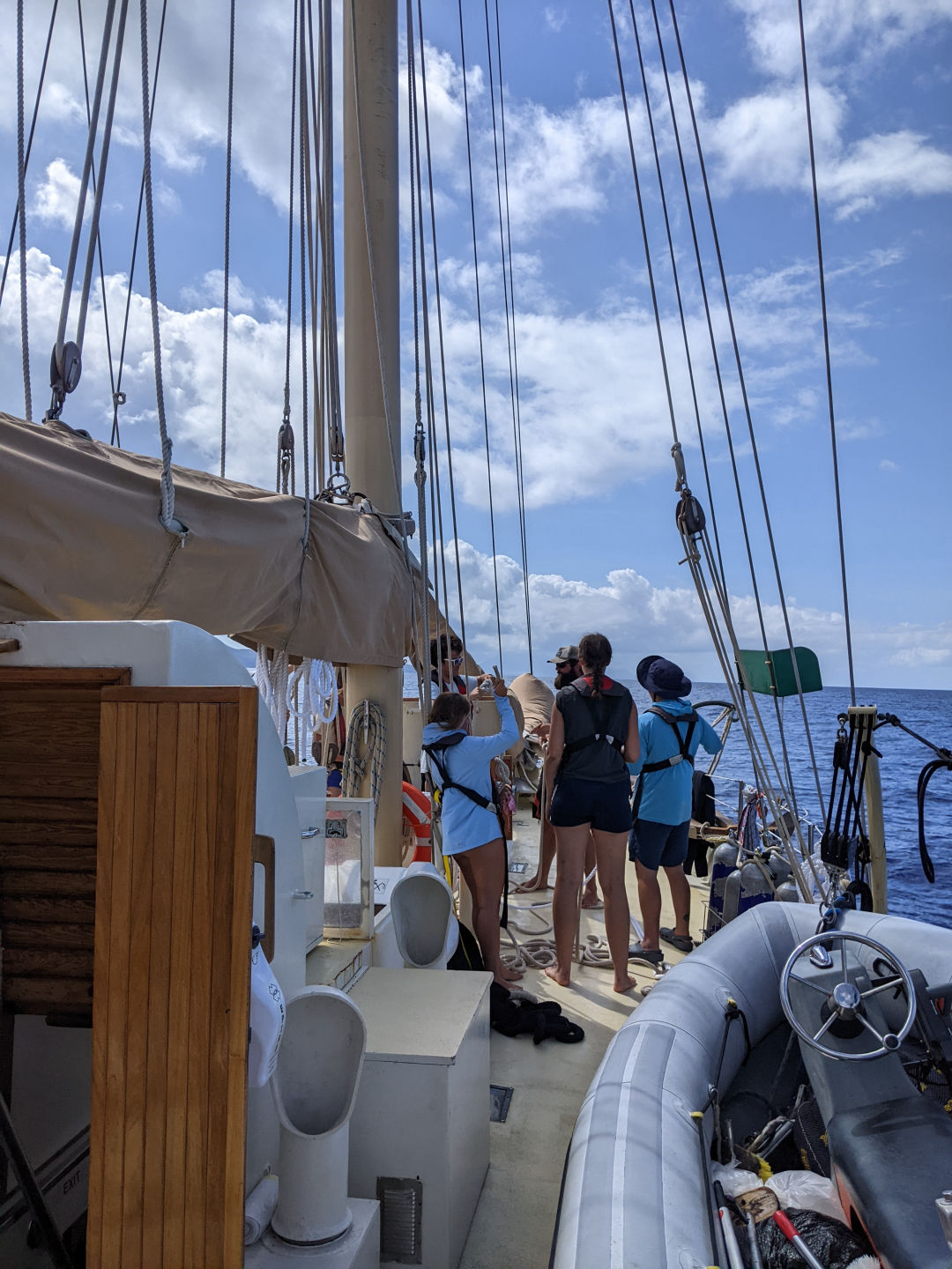 As always with my days as skipper, I woke up just before 7:00 am to prepare the speaker and pick the right song to wake everyone up to. I headed down to the saloon to find a few people already awake, making coffee, sun screening up for the day, braiding hair, and the chefs busy in the galley making everyone blueberry muffins for breakfast. I played my usual song of choice (The Waitress Song, by Seth Sentry) to wake everyone else up and get those already awake, pumped for the day. While breakfast was being brought up on deck, a few of us went up to the bow of Ocean Star to slip our mooring so that we could get underway from Saba to Sint Eustatius (Locally known as Statia).