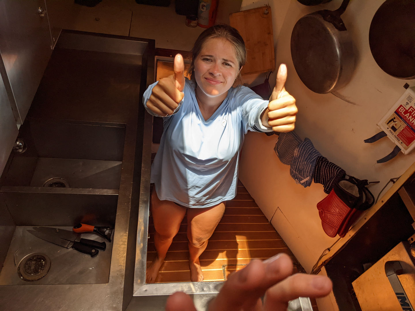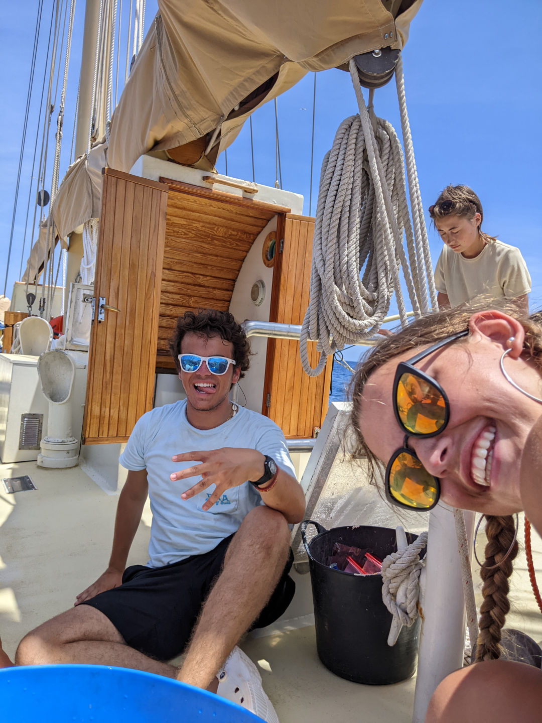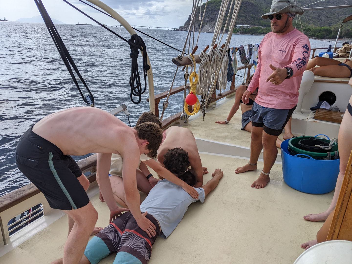 After our bagel sandwiches and Cool Ranch Doritos for lunch, a few people went in for a quick swim before meeting up for some EFR (Emergency First Response) training. This included covering the theory behind CPR First Aid and then completing some practical skills on deck with myself and Meg. We covered how to do a scene assessment, the use of barriers (with lots of comments on the ketchup I was using for simulation blood), CPR solo and with another person helping, AED use and placement, choking, placing someone in the recover position, serious bleeding, shock, and Spinal injuries, with a mini scenario where the team had to remove an ‘unconscious’ Ava from a particularly difficult position to a clear section of deck for ‘extraction’.