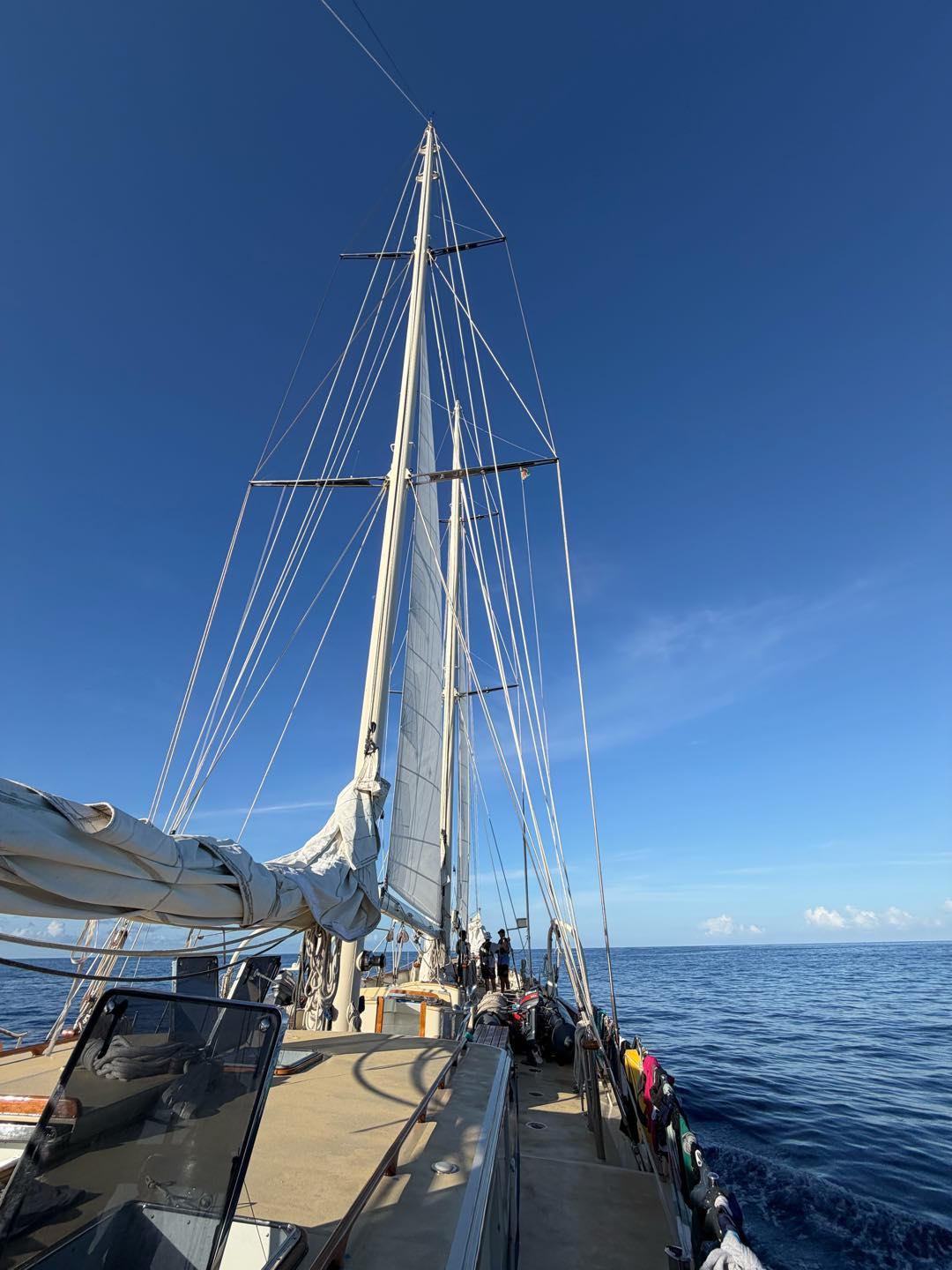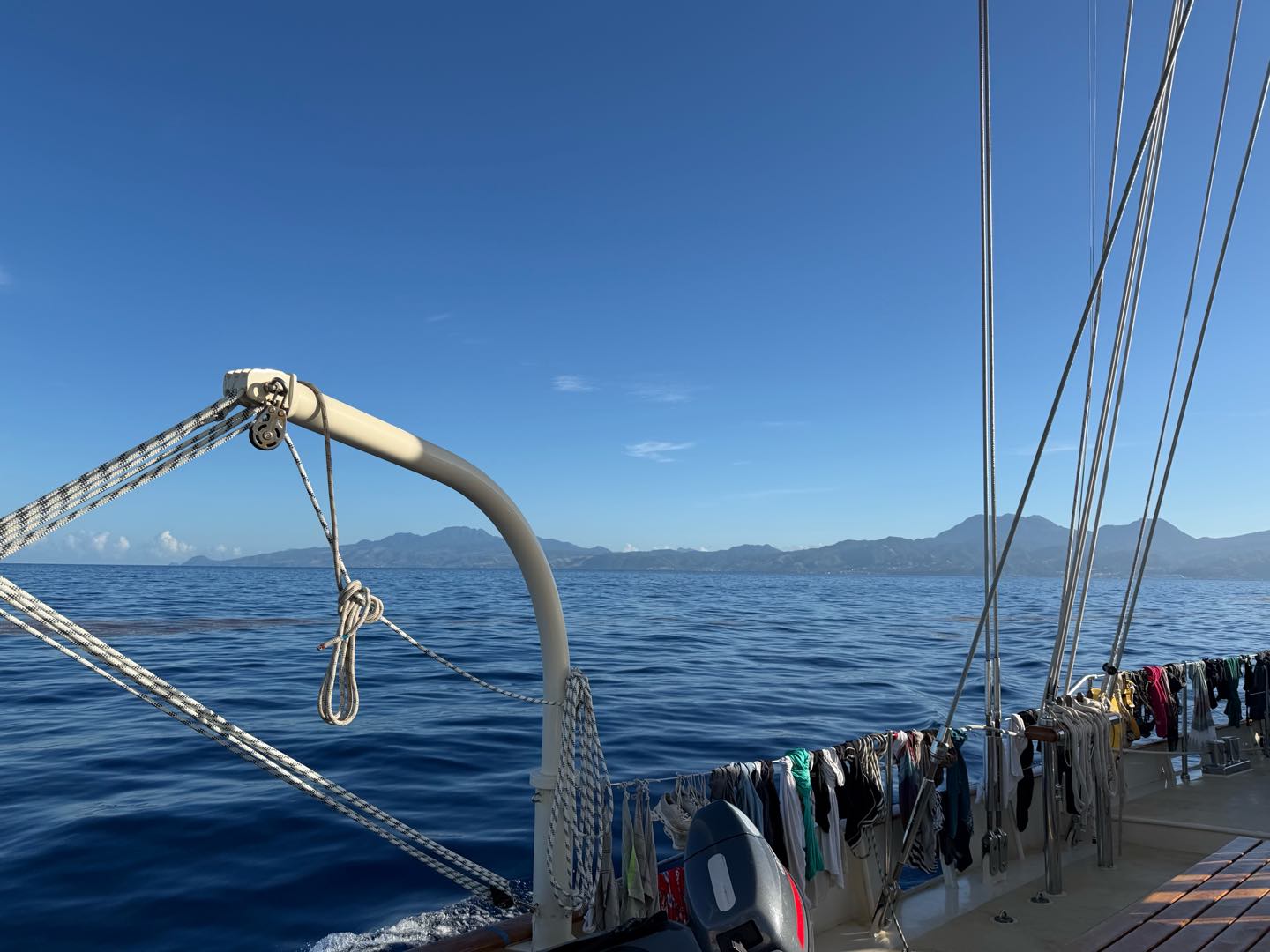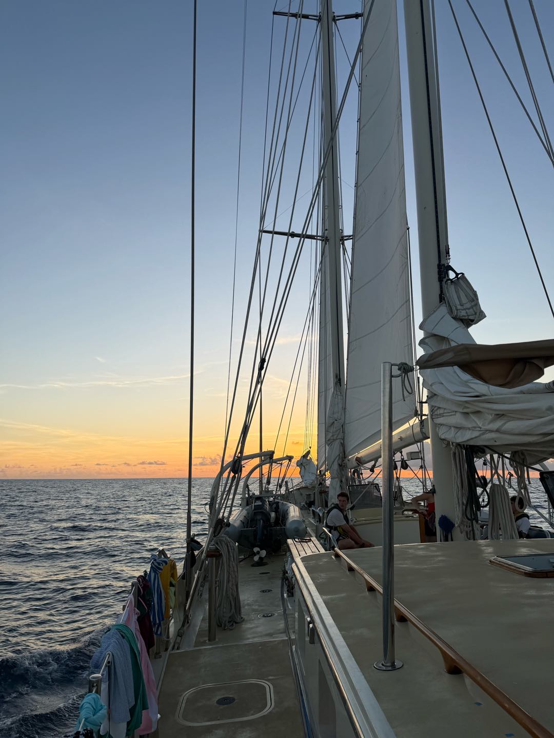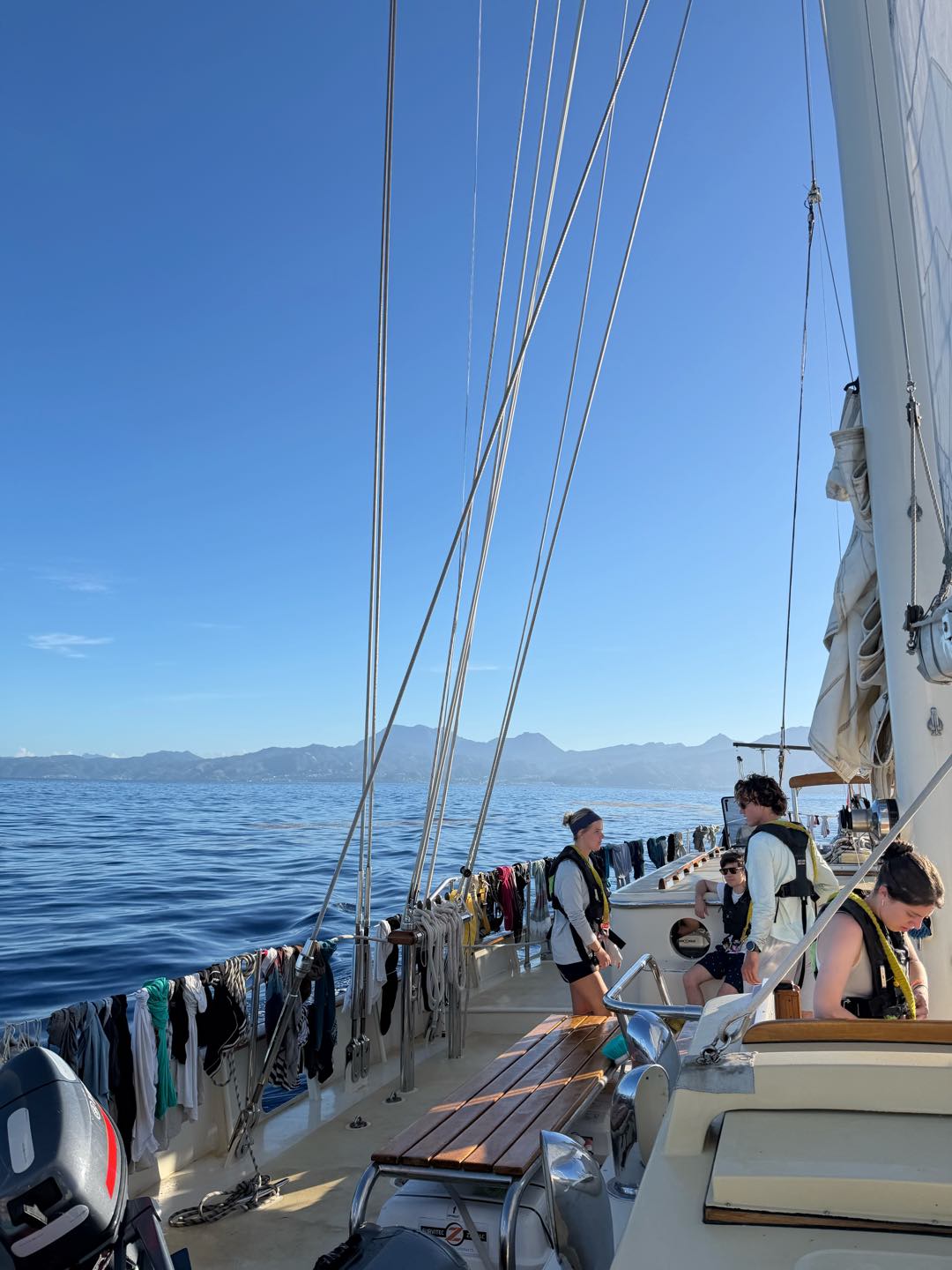 What’s up, guys? Jonas Jarecki here, back with another YouTube Challenge Video! Nah, just playing, no YouTube on Argo because we’re underway to Bonaire. We left Dominica this morning at some time. I don’t know when because the Watch Team One got us underway. That meant that everyone else got to sleep in, so that’s exactly what I did. I slept till drum roll please 7 am. How is it that when I finally have the opportunity to sleep in, I can’t sleep? That is so messed up. I digress (I will be saying “I digress” a lot in this, despite not being entirely sure how it is meant to be used). So, I digress, when I came up on deck, I got to watch Shane and Watch Team One put up the Main Stay Sail, and the Forward Stay Sail. It was kinda goated (another term I will be using a lot) because I got a sort of sneak preview for what we learned in Shane’s class later. As everyone started to wake up, Shane and Aiden informed us that we were allowed to fish, so Cason and I dropped our lines off the Stern. We sat out there for a good chunk of the day, for two different Watch Team rotations. It was goated. Honestly, I probably shouldn’t be writing this blog cause most of what I was focused on today was my line catching a whole lot of nothing. Yet, I digress, for lunch, Will made a divine Teriyaki Chicken with Rice meal, I even heard some describing it as “goated.” After lunch we had Shanes class, we have a quizz coming up in which we will need to know every line and standing rigging on the boat, and what it does. So we did a walk-through to help try to get it down, and I took more notes in that one hour class than I have in my five semesters of college. But, I digress, after Shane’s class, we had Meg’s class down in the Galley. It was really hot, so Meg didn’t keep us super long. I would try to tell you what we learned, but I am still a little confused, so I will have to consult my notes. After that, I went back to the cockpit for my watch. It was only a two-hour watch for us, however, because Rachel and Charlie had done the first two while we were in class. I dropped my line again. About an hour in, we saw a massive Tuna jumping out of the water on the Starboard side, so I got ready for the catch of my lifetime (I didnt even get a bite). We had watch up until dinner, when Will made another absolute banger of a meal, Coconut Curry with Rice. I think that would be my one piece of advice to anyone debating doing a Seamester voyage: “If you don’t like rice, it’s not for you.” Otherwise, Seamester, just like today, is Goated.