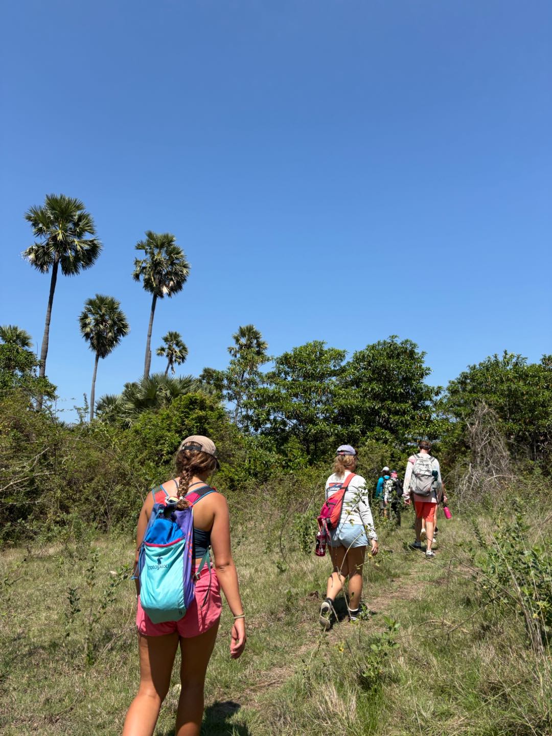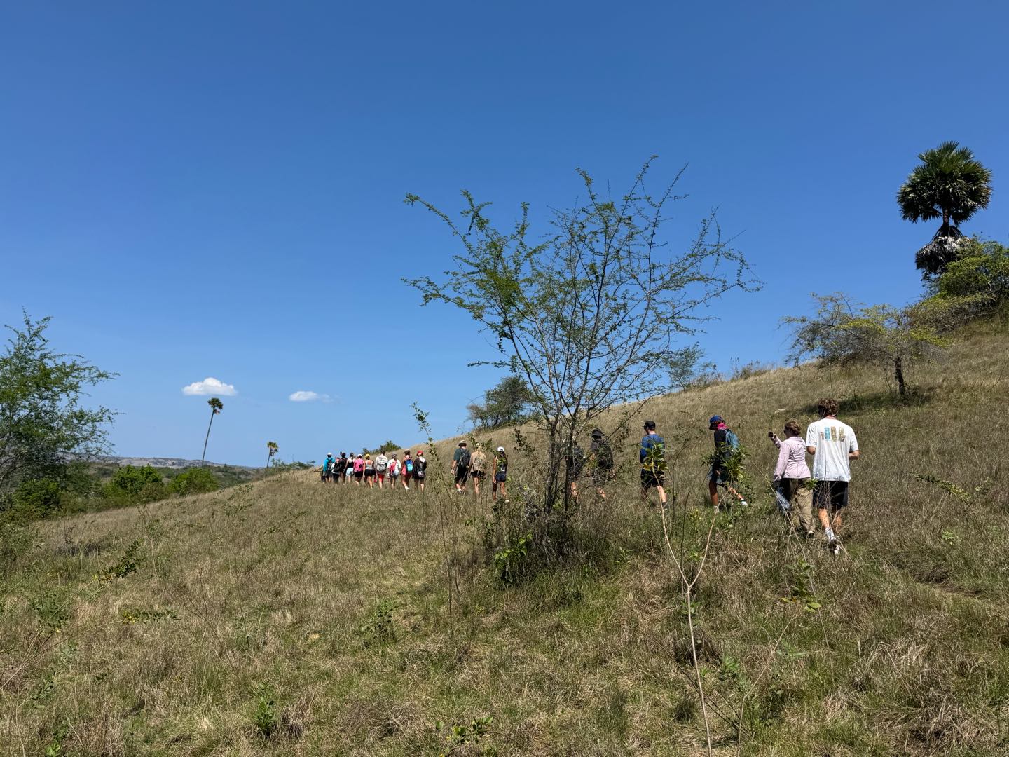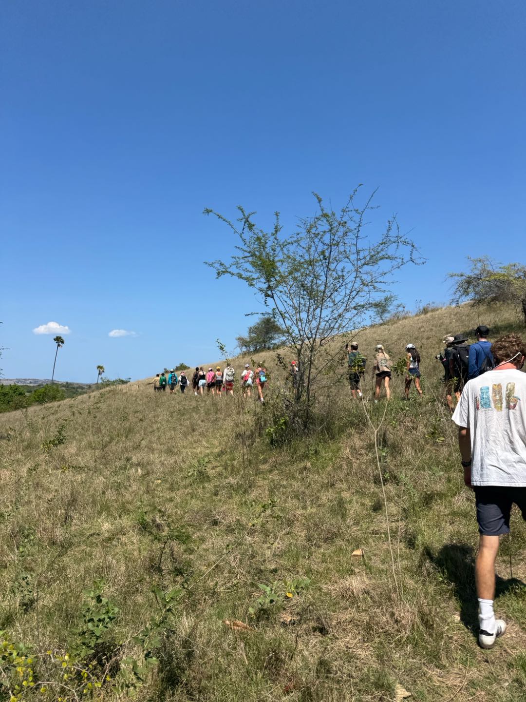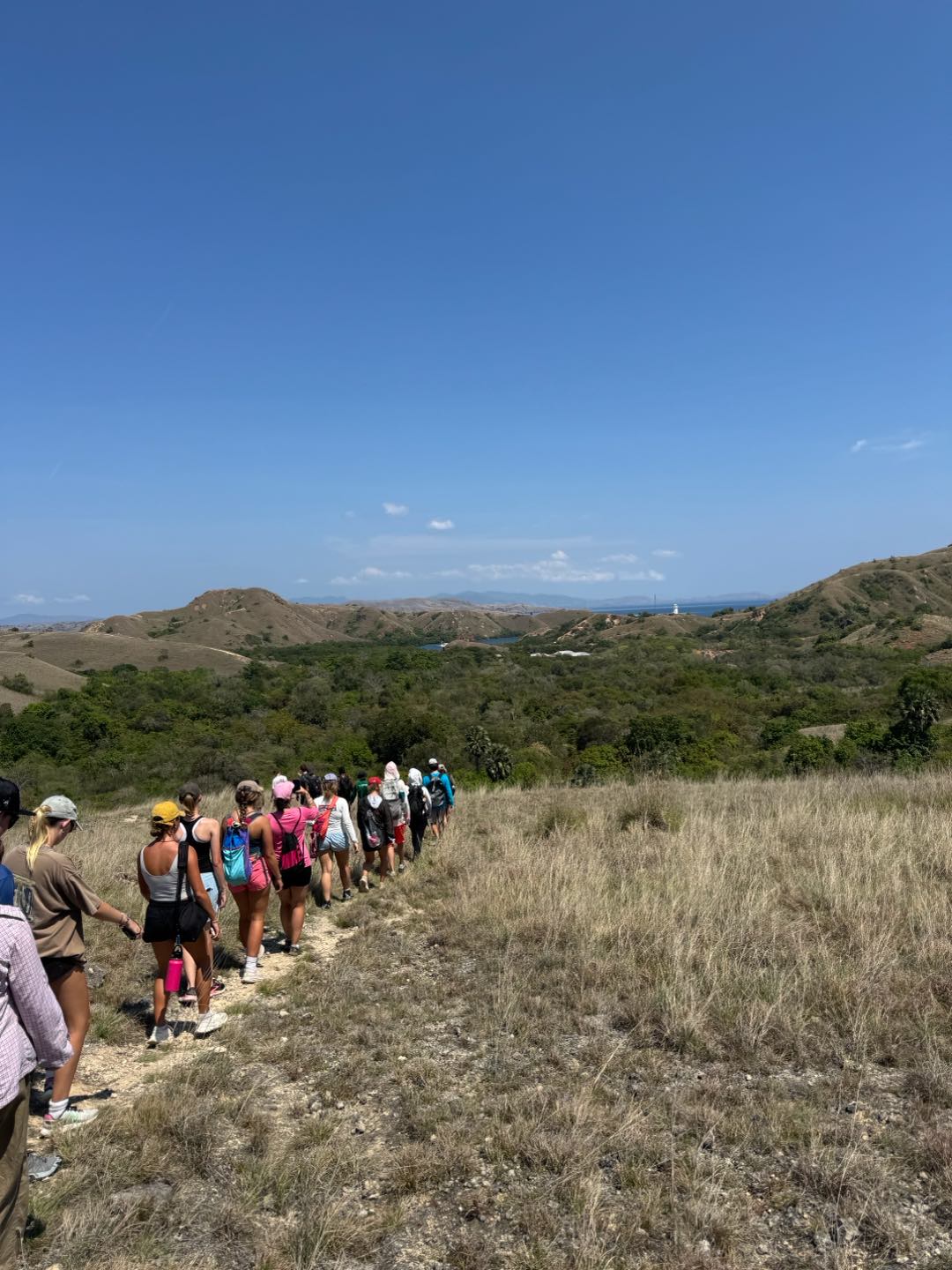 We then began a hike through the park, only protected by our park guides wielding large sticks. We hiked through a forest for about 1.5 miles or so and then looped around and headed back through grassy hills. On our trek, we saw many Komodo dragons wandering around, a water buffalo, a little dragon chasing a monkey, and some insane views. At the end of our hike, many of us bought a well-deserved cold drink at the gift shop and headed back to the dock. We got to Vela around lunch time and left our anchorage to embark on a short passage while we ate delicious nachos with beans and corn. After we had eaten and cleaned up lunch, we went down below and locked in through an Oceanography lecture despite being a bit overheated and low on energy from the long morning hike. We ended class with about 45 minutes left till our next destination, and many of us took a lovely power nap. Maia woke me up to tell me we made it to a pink sand beach! We all packed up our beach bags and went ashore to enjoy a laid-back and beautiful afternoon at the beach. We swam, tossed a football around, and wandered the remote paradise that was the pink sand beach. Never before have I been lying on the beach to see pigs trot by, but theres a first time for everything! I thought it was so cool, but we definitely had to hide our snacks from them! It was such a great beach day, and Thaxton had fun snorkeling, Destiny got some drone footage, and Rai-Ching built a sand castle. As the sun began to set, and our amazing chefs reported that dinner was nearly ready, Riley retrieved us from the beach and brought us back to Vela. We took some cold and speedy ocean showers and had a dinner of chicken, pasta, and bread rolls, which was definitely one of my favorites so far. We chatted at dinner about our favorite childhood movies and then cleaned up for the day and went downstairs. Im now sitting in my bunk listening to Jewel, Maia, Destiny, and many others parade down the hall laughing and singing about cinnamon rolls, I think. What a great way to end a great day. Im so grateful for our wild adventures today, and Im sure we all cant wait to see what tomorrow brings!