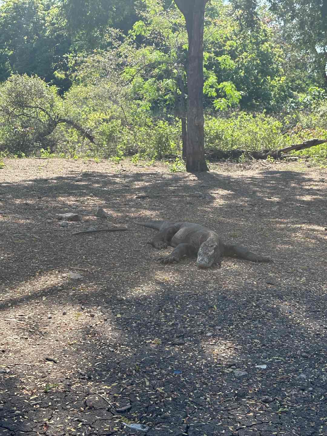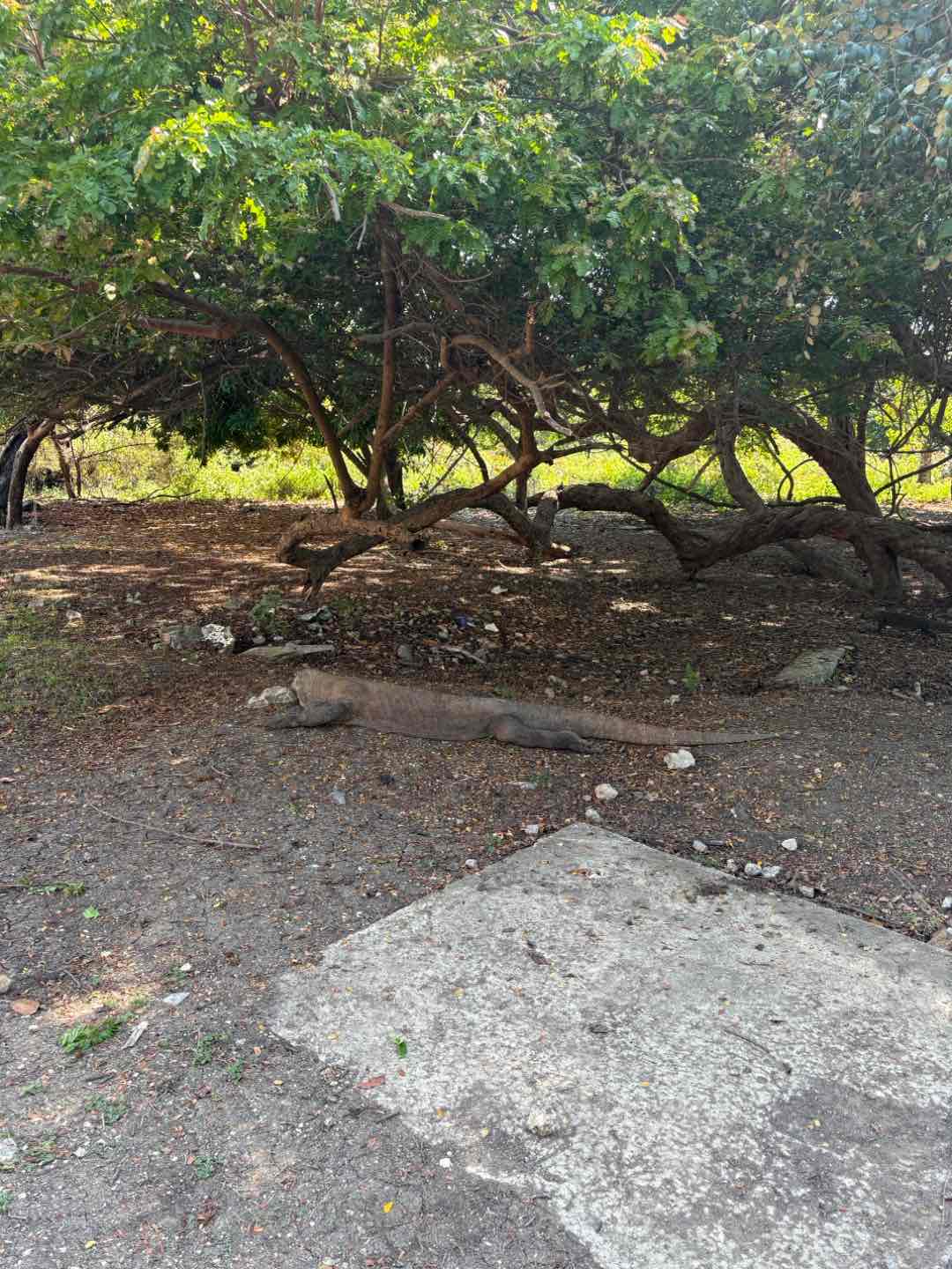 Imagine youre in a peaceful sleep, dreaming about the beautiful sights weve all got to see these past days, and then the How to Train Your Dragon theme song begins to play in the background. I like to think thats how it was going for everyone asleep aboard Vela right before they woke up this morning, because that was the song I got to wake everyone up with! And it got everyone up and ready for an insane day full of dragons! After I woke up at 5, went on anchor watch and made some coffee, finally woke up the other students at 6:30, and ate an amazing breakfast of chocolate chip cookie oatmeal, we all excitedly got in the dinghies and took off towards Komodo National Park. We arrived, met our brave guides, and listened to a brief safety spiel before stepping through a gate and into the territory of the Komodo Dragons. Our park guides told us shocking facts about the Komodo Dragons as we stood among them, trying to take pictures but not bother the huge lizards. Apparently, the Komodo Dragons can grow up to 3 meters long and eat water buffalo. Unbelievable!