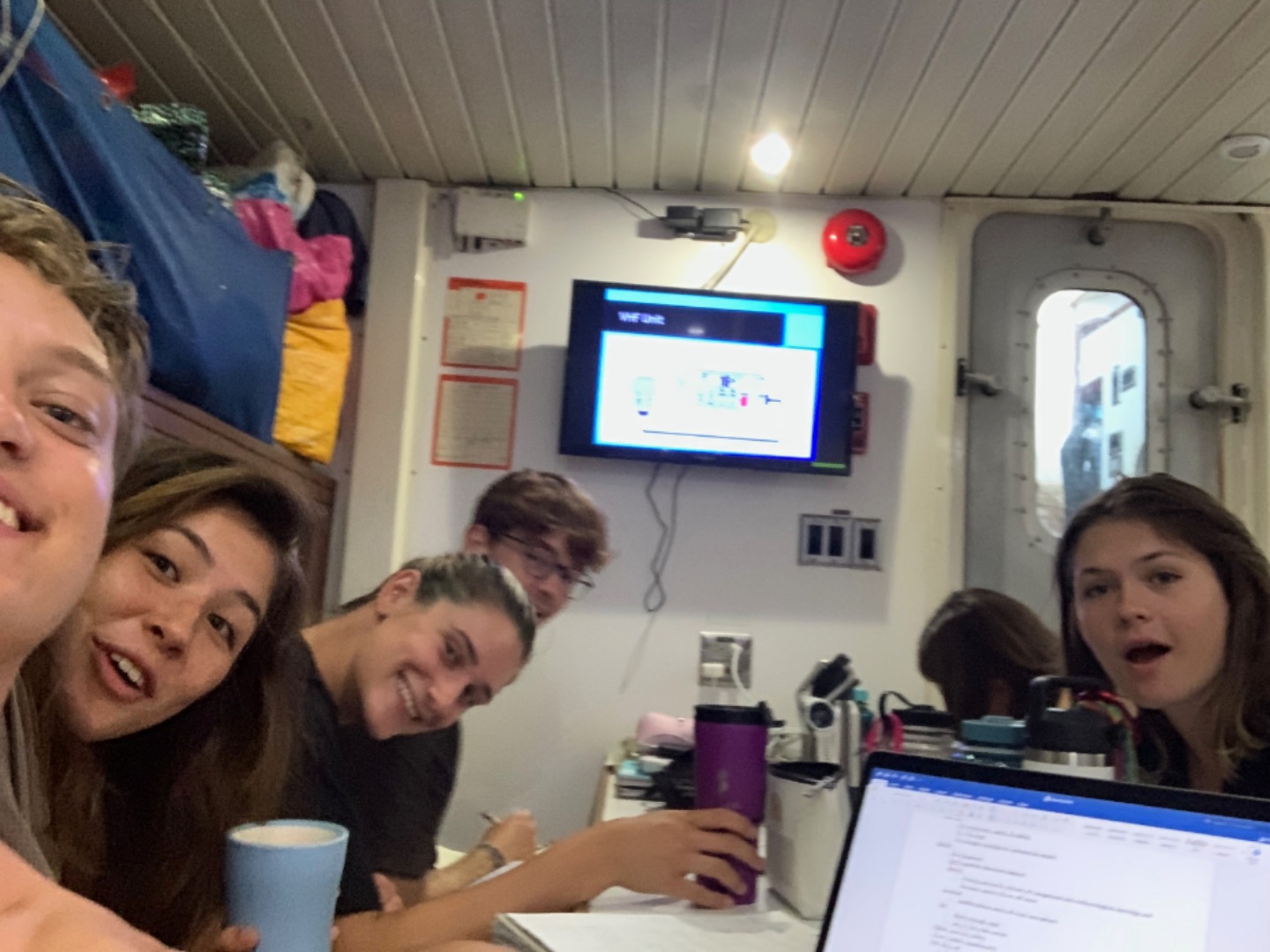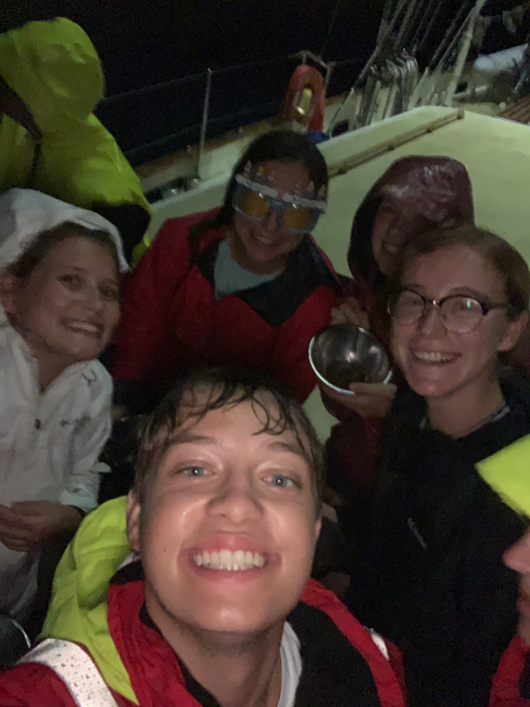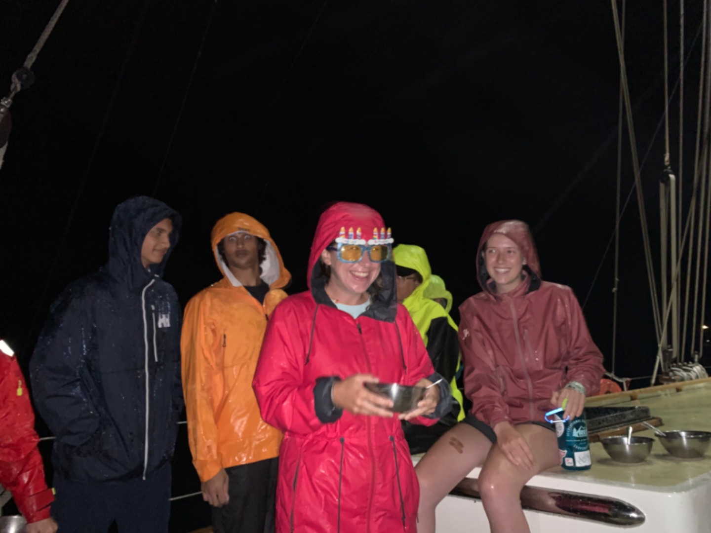 Today I woke everyone up with “The Lazy Song” by Bruno Mars. We then surprised Hu (Amanda S) by singing Happy Birthday to her before breakfast. We had pancakes for breakfast which Grace made as she was head chef for the day. It was raining very hard, and eating was a little bit of a challenge. I then had a dance party with all of the Salties, and we played a lot of the Beatles, and we vibed. I also rickrolled Sydnei. After clean-up, we started with a quiz on oceanography. It was about plate tectonics, continental drift, different ocean explorers, and more. Next, we had seamanship, where we learned about the VHF radio and the phonetic alphabet. After another lunch in the rain, we went back into the classroom and had Marine Biology and Leadership. In Marine Biology, we learned about evolution and natural selection, among other things. Leadership was next, where we had multiple conversations about the purpose of leadership. After a long day of school, I was so tired and took a quick nap before dinner. For dinner, we had beef teriyaki. We then surprised Hu with a cookie cake that was the best cookie cake ever! It was made by Chloe, Vivian, and Margo. As I write this, we are having a dance party in the saloon, which I plan on joining!