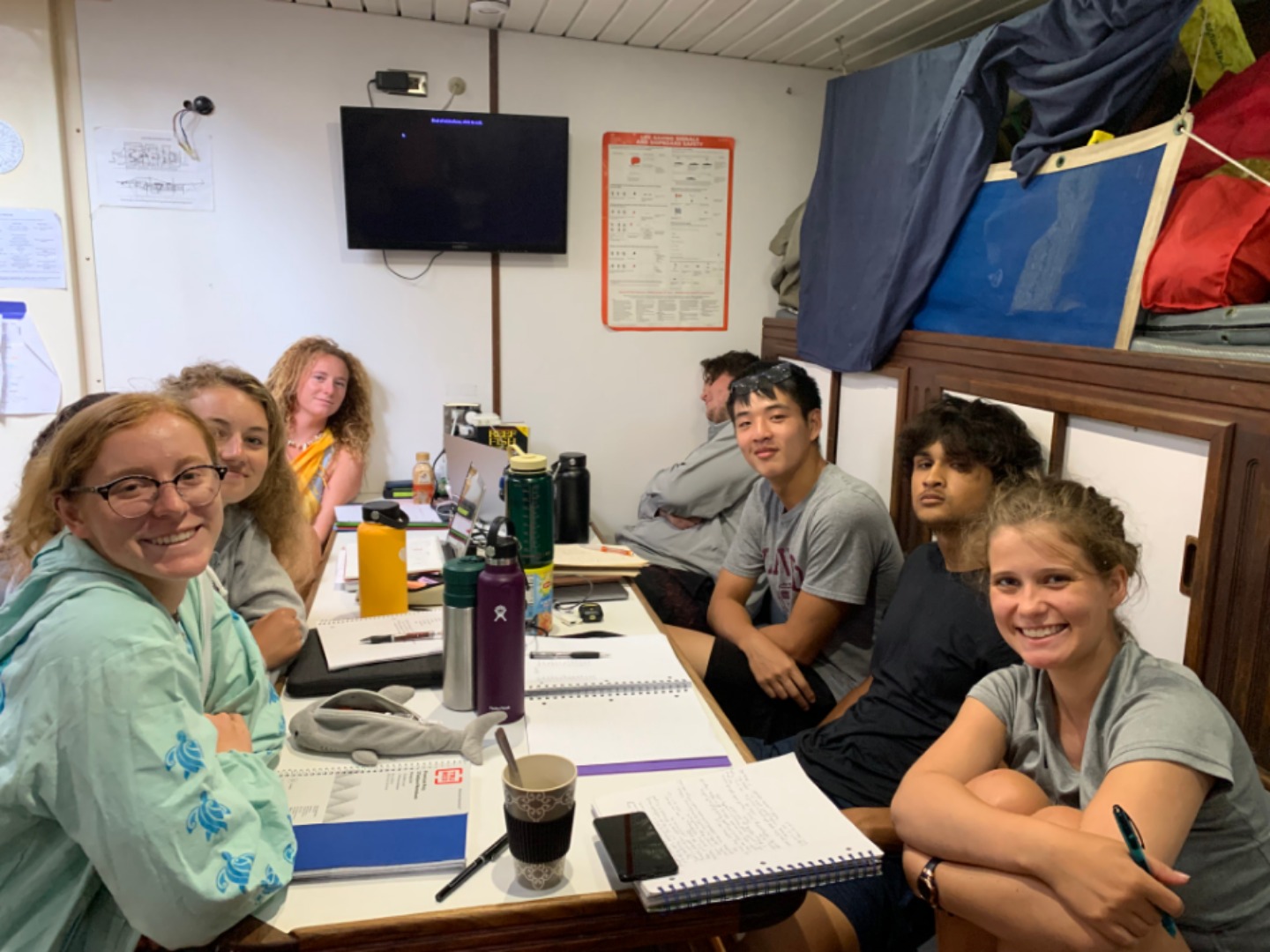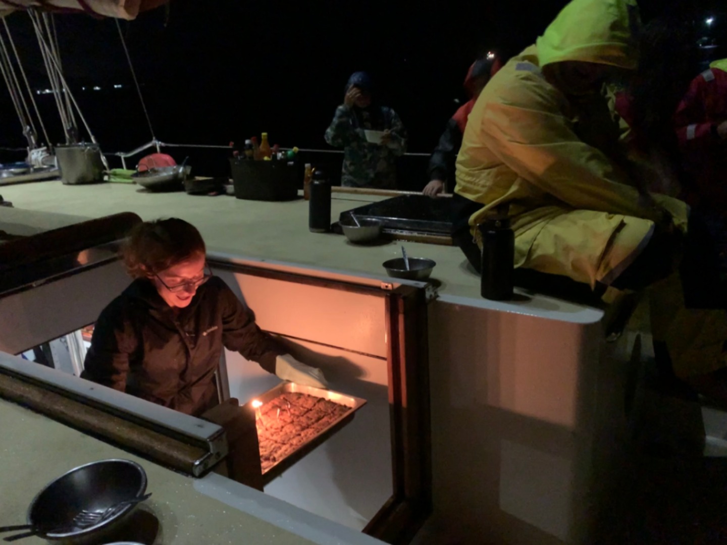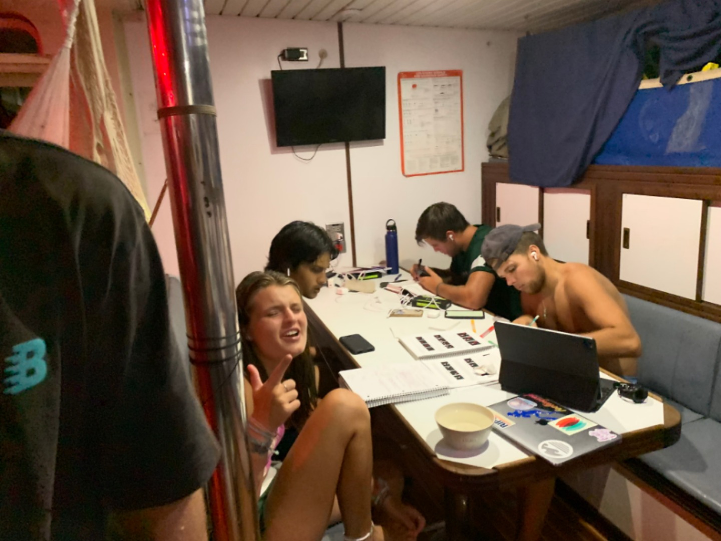 Today I woke everyone up with “The Lazy Song” by Bruno Mars. We then surprised Hu (Amanda S) by singing Happy Birthday to her before breakfast. We had pancakes for breakfast which Grace made as she was head chef for the day. It was raining very hard, and eating was a little bit of a challenge. I then had a dance party with all of the Salties, and we played a lot of the Beatles, and we vibed. I also rickrolled Sydnei. After clean-up, we started with a quiz on oceanography. It was about plate tectonics, continental drift, different ocean explorers, and more. Next, we had seamanship, where we learned about the VHF radio and the phonetic alphabet. After another lunch in the rain, we went back into the classroom and had Marine Biology and Leadership. In Marine Biology, we learned about evolution and natural selection, among other things. Leadership was next, where we had multiple conversations about the purpose of leadership. After a long day of school, I was so tired and took a quick nap before dinner. For dinner, we had beef teriyaki. We then surprised Hu with a cookie cake that was the best cookie cake ever! It was made by Chloe, Vivian, and Margo. As I write this, we are having a dance party in the saloon, which I plan on joining!
