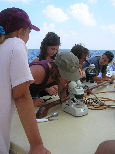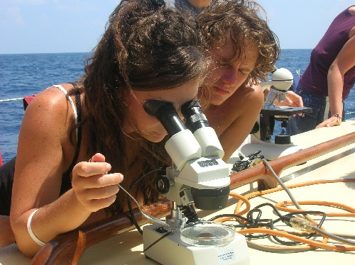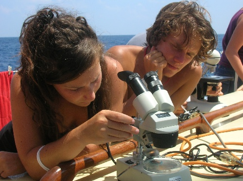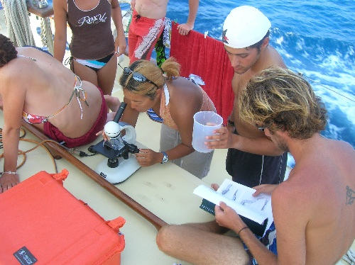 On passage, We’re all on it. It’s not a drug, but it changes the way the world looks and the way we see time and one another. The passage is a place where small things mark the movement of hours (sunburn, shade shifting from port to starboard, a boat on the horizon, catching a fish) but where time is also regulated, punctuality stressed. Three on, six off, lunch at noon, dinner at six, Class at one, after lunch cleanup. Today we did a plankton tow and looked at tiny current-bound organisms under the microscope. We saw snails that kept from sinking with snot bubbles. What’s time like for zooplankton, between nightly ascents, down in the dark and cold? What’s time like for a jellyfish? There’s a lot of time for thought on passage, silent helm time, and bow watch in the dark. Good wonderings. I think watch team two is like zooplankton. We come up from the depths each night to feed. My belly still hurts from last night’s snacky cake binge, but we scrubbed all the chocolate from the deck before Kevin could sit in it again.