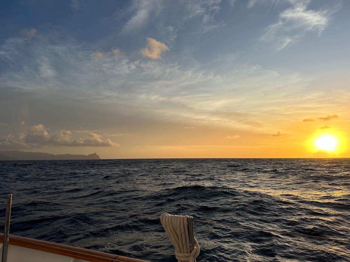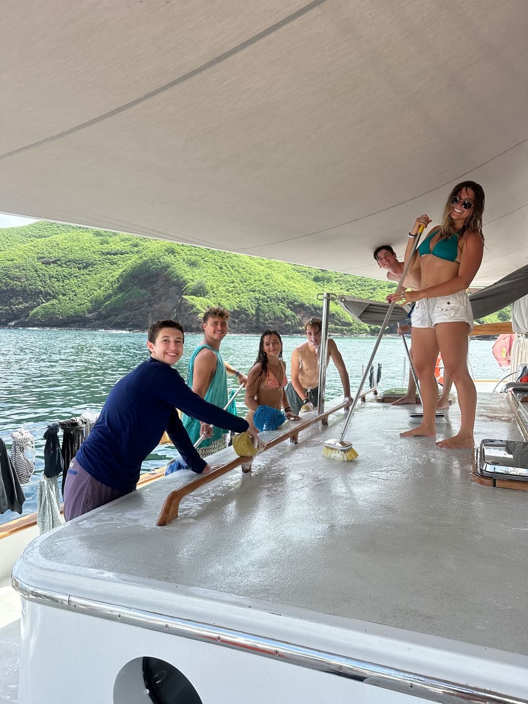 My day started at 3:30 this morning, and usually wed all be pretty low energy, but today the energy was super high because we were finally making it to Nuku Hiva after 18 days of passage. This was the big passage of the trip that everyone had been talking about since the start, so it was bittersweet that it was over. We were all so excited to finally get to land, but that also meant that the trip was wrapping up soon. We were a little ahead of schedule and didnt want to anchor in the dark, so our 4-8 watch consisted of some jibing to slow down and wait until first light. The sun started to come up, and we could see the island, which was such an incredible feeling. Everyone started coming up to watch the sunrise and see the mountains as we were pulling in, and it was so beautiful. Maya Ws birthday was also today, so we sang her a little happy birthday when she woke up. Cant really think of a better way to spend your birthday, honestly. The coastline was so insane I took so many photos, but as cheesy as it sounds, they really just dont do it justice. We anchored and got settled, making some calls back home before boat appreciation began. A deep clean was quite necessary after this long passage, so the morale for BA was very high. I was put on deck crew, which started with a deck wash, so we blasted the music and got to scrubbing. While we were on deck, there were people clearing out fridges/pantries, shop vaccing bilges, scrubbing floors, cleaning topsides, and basically everything else you could think of. This doesnt sound glamorous, but honestly, boat appreciation is so much fun when everyone is working together and making the most of it.