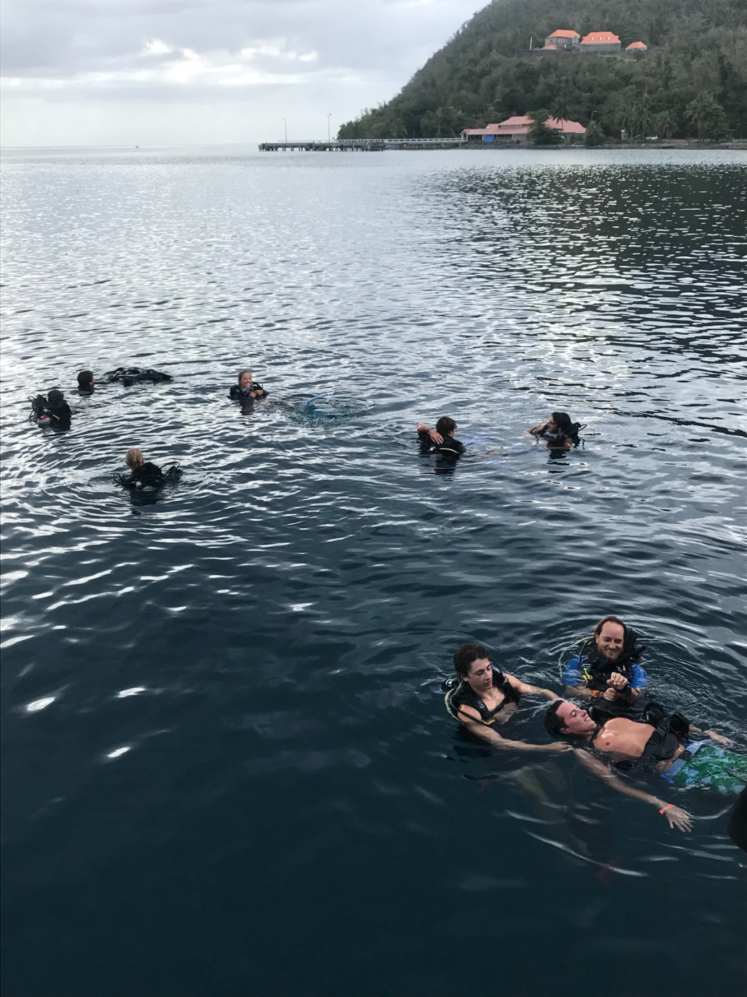 The group then began to get ready for more Rescue course practice. The main focus of this session was practicing rescue breaths and equipment removal on an unconscious diver at the surface. We had some hilarious rescue breathe attempts where I would say, “get close enough that the victim could lick your cheek,” and Grady decided to test this out on his rescuer, poor Celia. We almost had a few rescuers disappear to the depths during their rescue as they forgot to take off their weight belt until their BCD (Buoyancy Control Device) was already removed. When it was Topher’s turn to recuse Julian, and they were getting ready, Julian casually explained, “I will die for you,” and flopped forward in the water. Katie also added some drama by dying in a rather extravagant way. Fortunately, everyone lived.