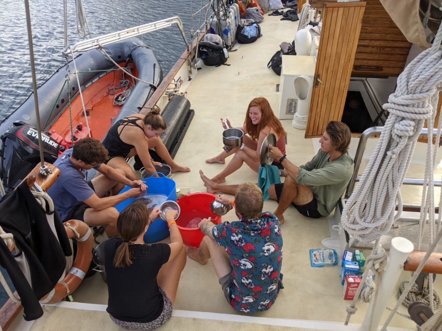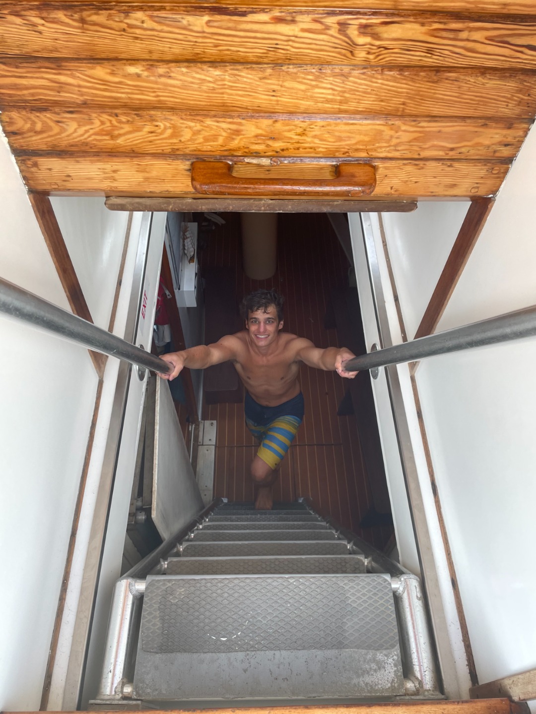 I had to jump out early to wake everyone up, so Addisen stayed in for a few more dives. As I’m in the process of drying off, I see Addisen emerge from the water like the lady of the lake holding Excalibur but with our missing bread knife that fell overboard the other day, yelling proudly, “I found it!” and exclaiming, “and I hit a new record, 13.3 meters!” What a legend.