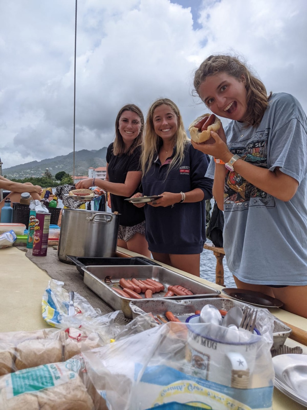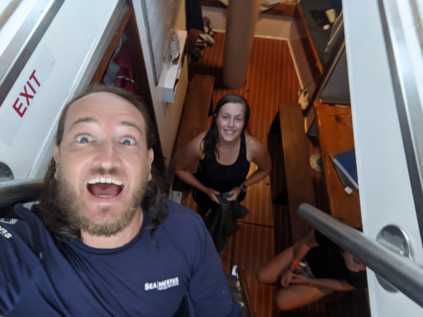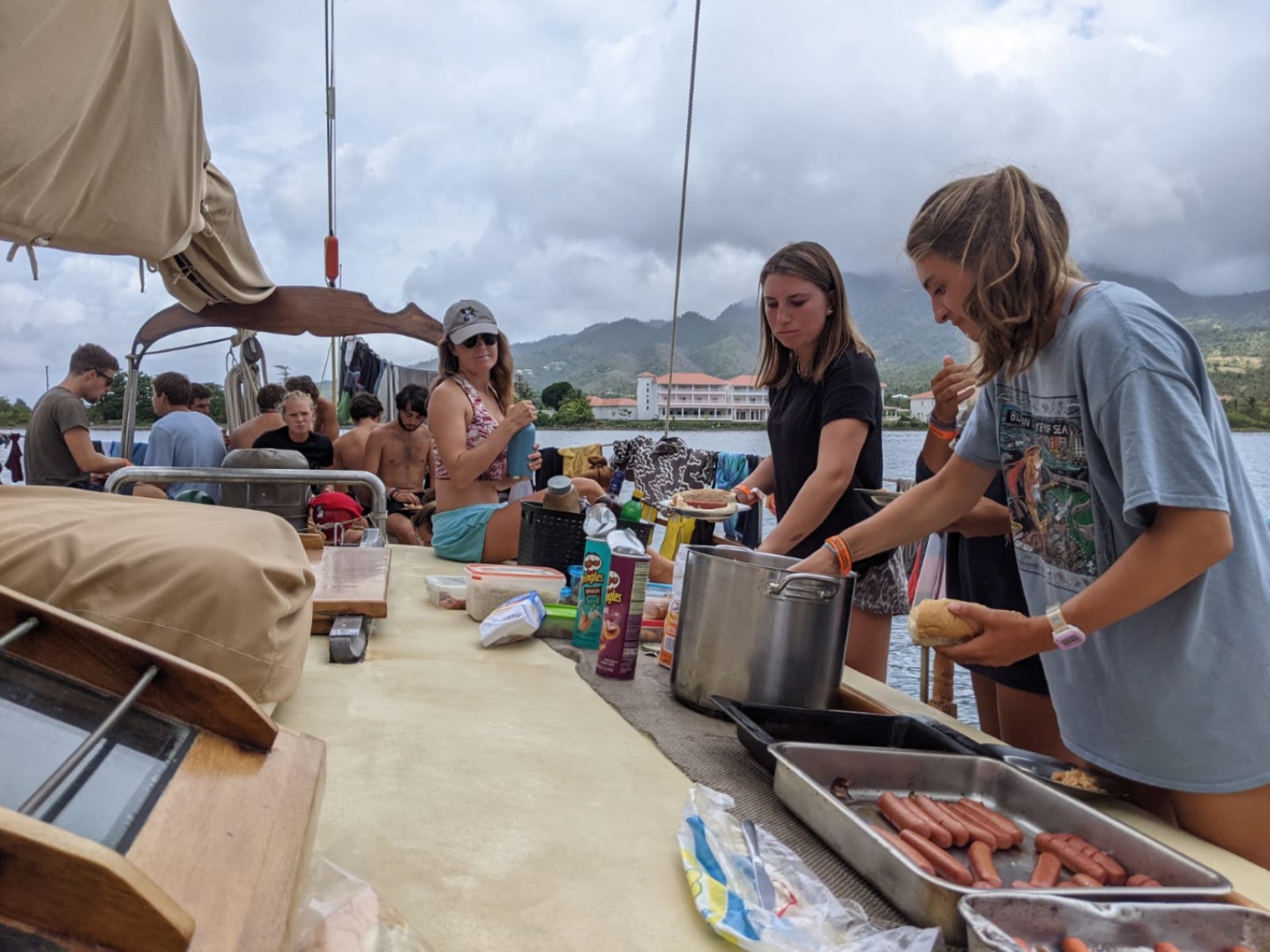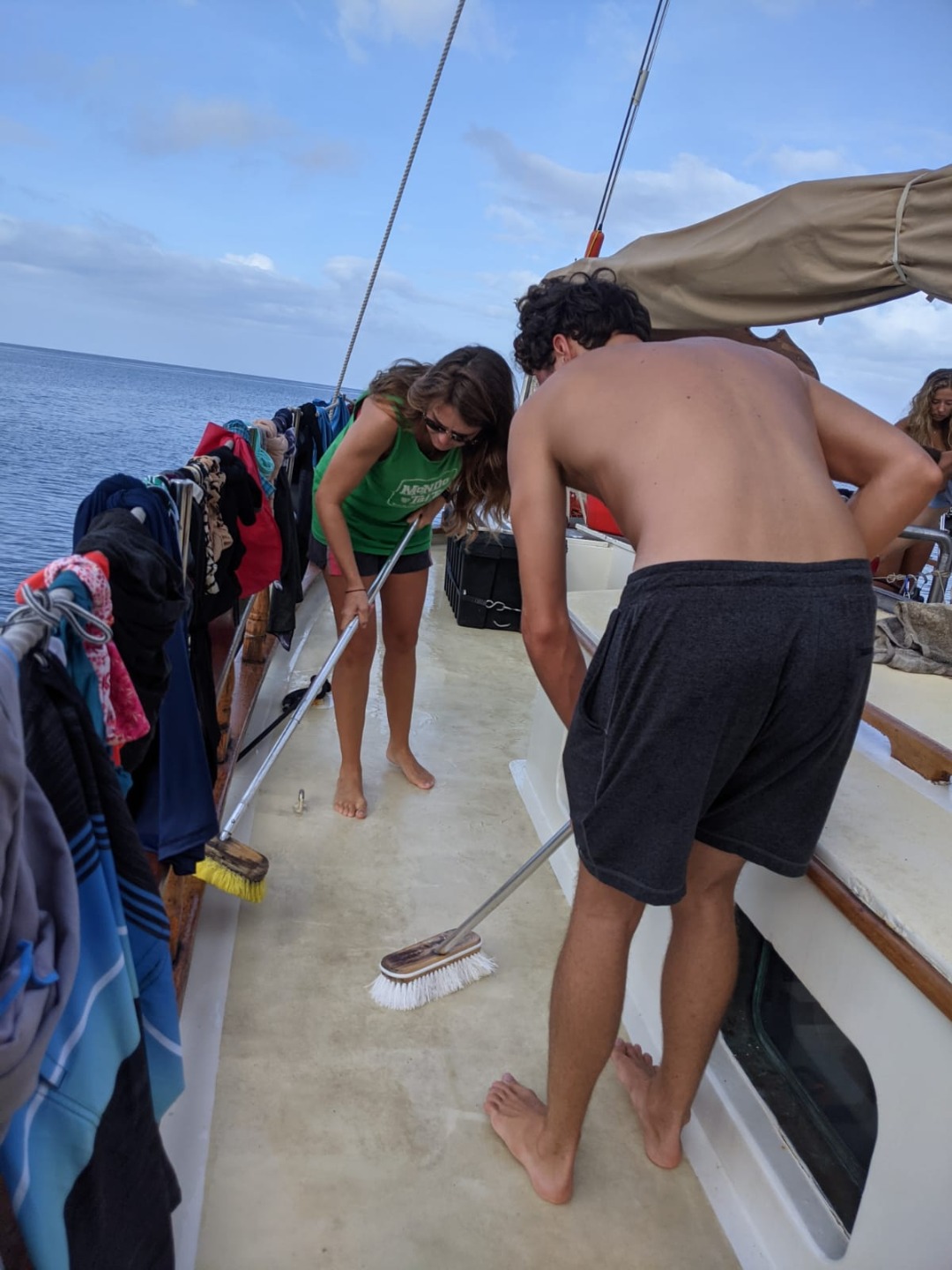 Meg and her trusty sous chefs dazzled us with hot dogs and corn dogs for lunch, which was, in all honesty, a breath of fresh air as it hasn’t been done yet on this trip. Once lunch was devoured, and the deck was clean, Liam and Max took over Oceanography and presented the topics they covered for their Lit Reviews. Max talked about the predatory fish decline, and Liam covered Fisheries.