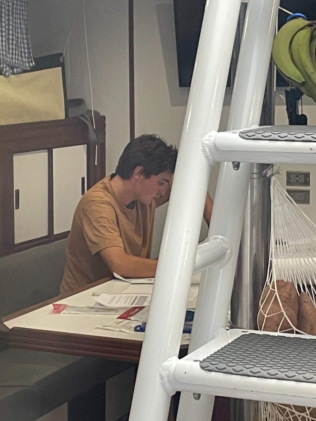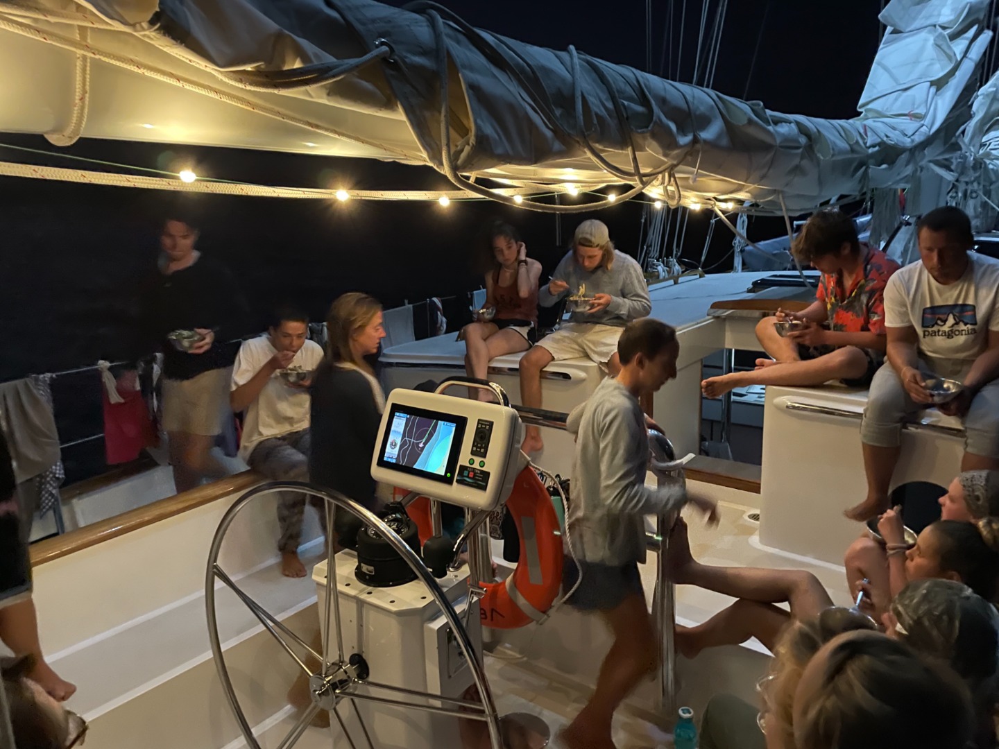For lunch, we had some delicious Tabouli, Hummus, and fresh carrots courtesy of Sonnet, Drej, and Leoni. The afternoon was spent finishing up our group research projects for Oceanography, which were due right before dinner. We did some passage prep as well as we prepare to leave Saba after a short but jam-packed visit and head south to St. Lucia, where the crew is excited to do some more diving and hiking in the rainforest. The squeeze question this evening was, “what is your favorite Ice Cream flavor, but say it in Batman’s voice?” We had some hesitant members of the circle but all in all, had some great laugh as people tried to do their best batman impression. As I’m writing this, the crew is finishing up their jobs, and then we are getting underway.