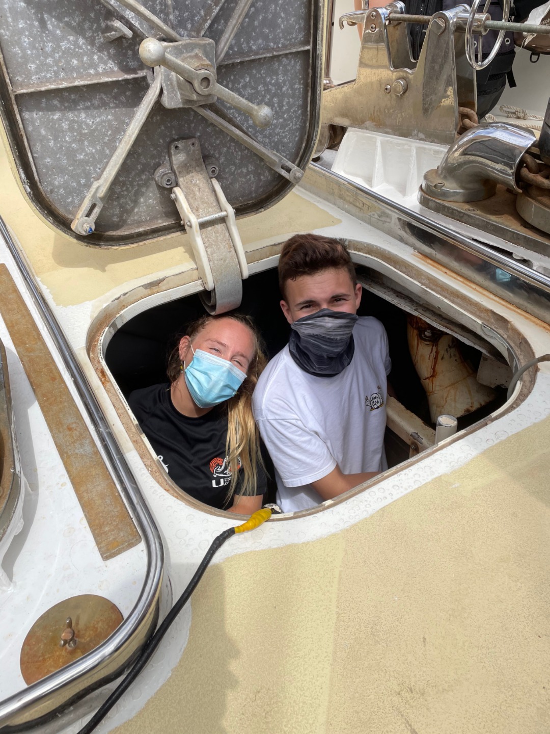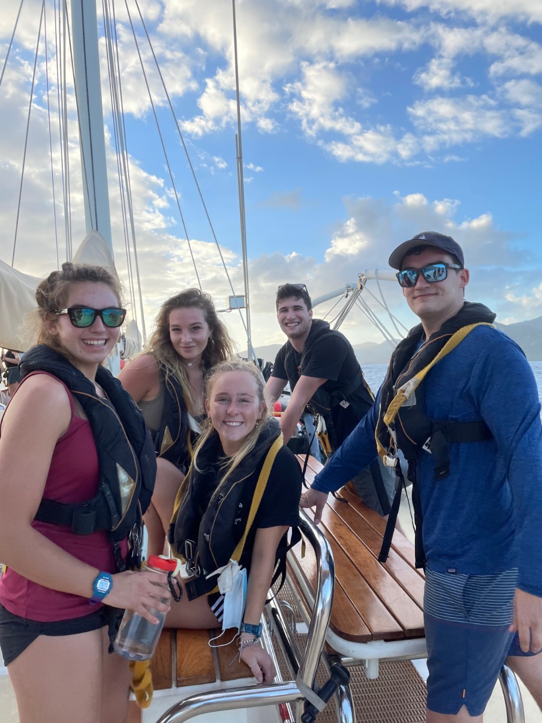 Once anchored, the other water divers finally got their first taste of the water for their swim test and were joined by the rest of our classmates for the first ocean shower of the trip. Refreshed and content, we savored the last of the day’s fantastic meals (thank you, head chef Amanda) before our night;y squeeze (“Who is/was your most influential teacher or mentor, and why?”) and brief Intro to Seamanship with Elle. We’re all going to bed earlier tonight as we continue to adjust for our changing anchor watch schedules, and look forward to the food, conversation, and adventure that await us tomorrow.