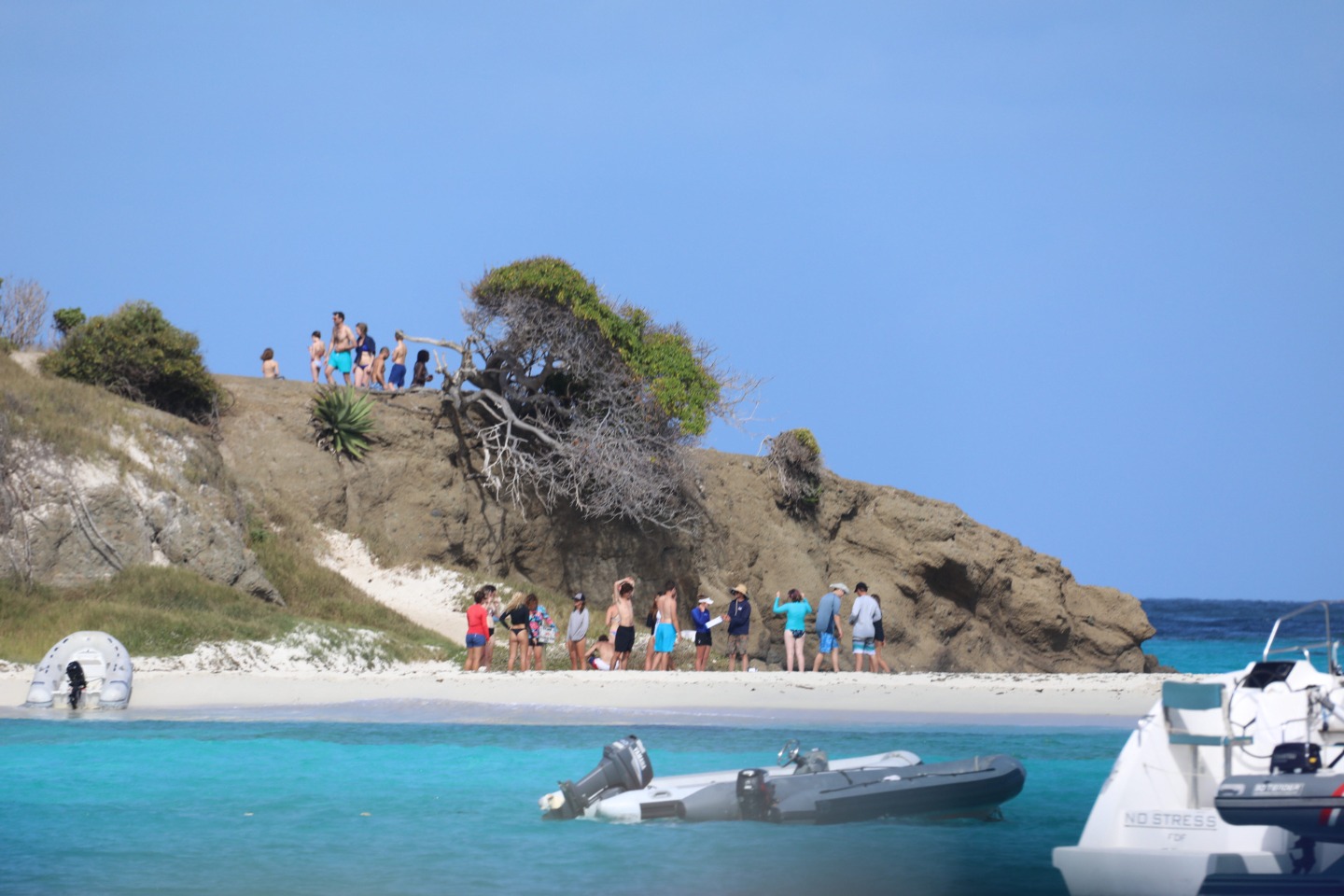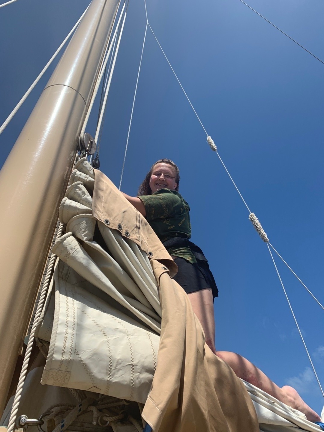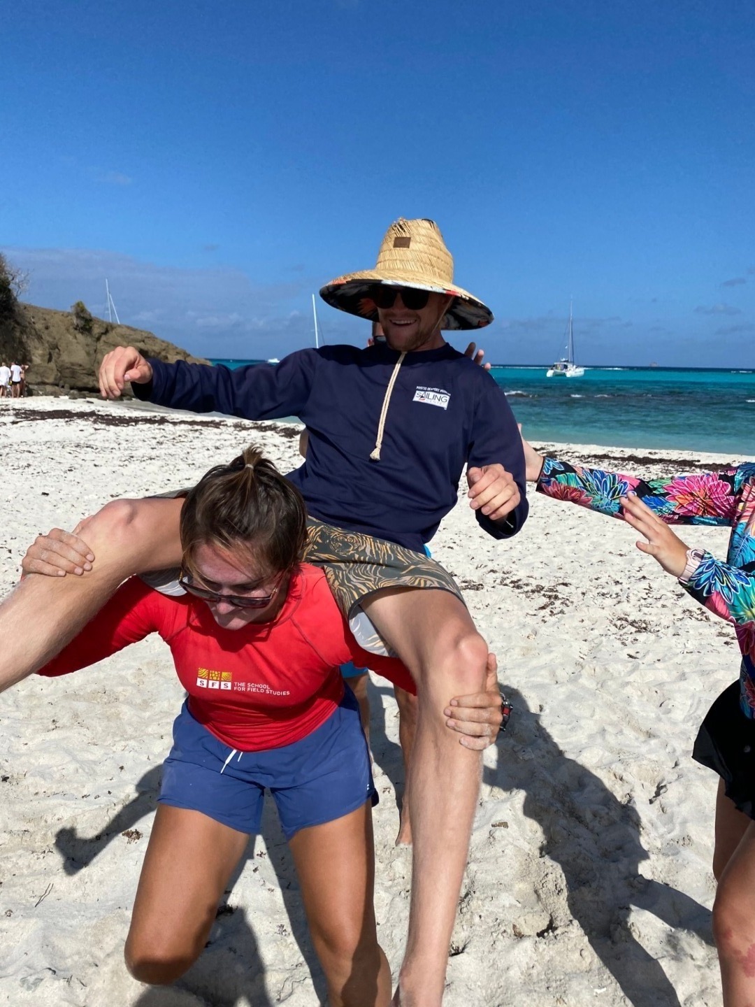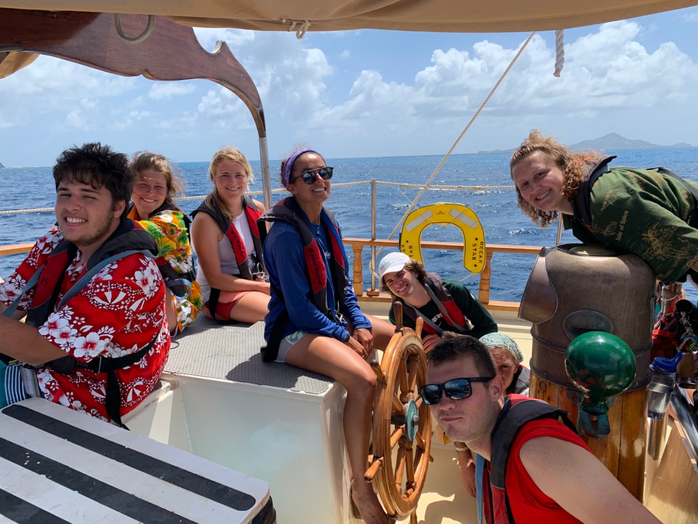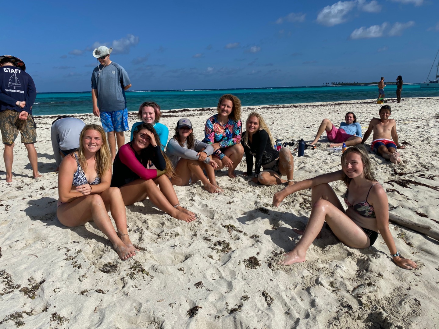 It’s safe to say we all slept well last night after a day of studying and seeing carnival in Carriacou. We woke up ready to set sail to Union Island and the Tobago Cays, with the help of delicious pancakes made by Tye, Gus, and Marin. It was then time to start our short passage. In preparation for the Antigua Classics, we timed how fast the 16 of us could get the sails up. With the goal of under 20 minutes, we did it in a whopping 14.5 minutes! We had a leadership class while underway, which is always a fun discussion. As we got closer to our destination, the water got bluer and bluer. But when we finally anchored between the tiny islands of the Tobago Cays, our faces lit up at the sight of the most beautiful water we’ve seen this trip. Several turtles greeted us, poking their faces up towards Ocean Star as we got settled. Next, we dinghied to a tiny island nearby to learn about taking scientific surveys while diving. This was the best part of the day because we got to snorkel at the beach, getting friendly with the turtles, sea stars, and other marine life. Our day ended with a scrumptious dinner of homemade black bean burgers and potatoes while watching the majestic sunset. Some even witnessed the “green flash”!