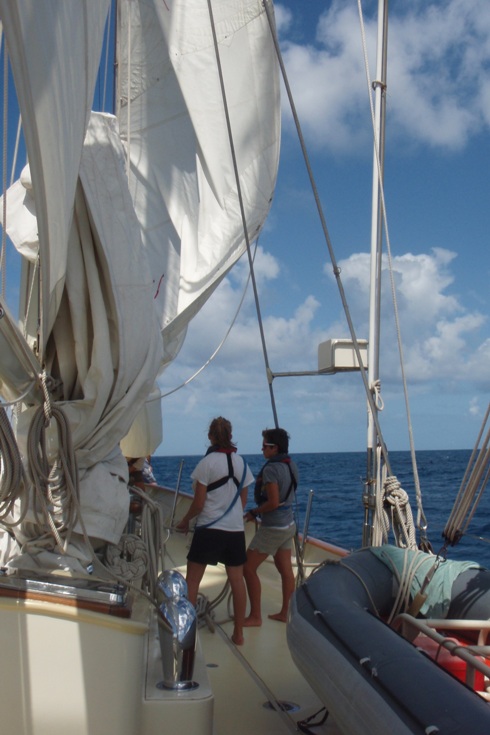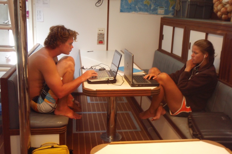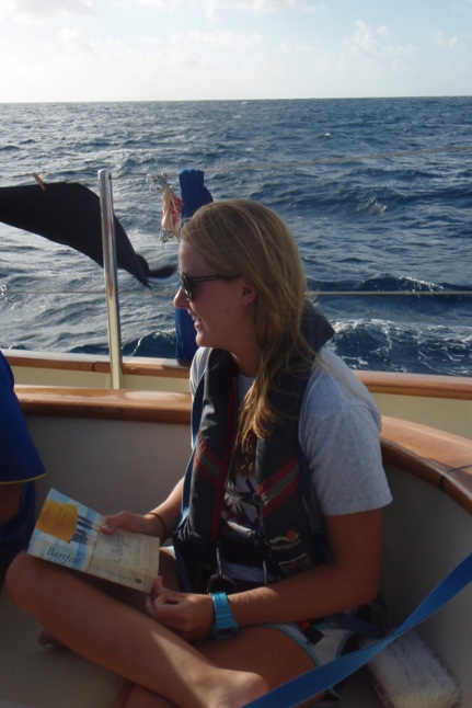 Today has been a fairly regular day of watches. I was on from 0300 until 0600, which included sunrise. The sunrise coincided with the moon’s fall this morning, which was one of the most amazing things I had ever seen. The unmatched break of the day makes me really think about my time out at sea and instills a sense of accomplishment and awe for where I am and what we, the entire crew and staff of Argo, are doing. We are undertaking a huge task, crossing the Indian Ocean, though sometimes it seems a bit less daunting because of how it is broken up. The day was filled with classes, such as PSCT, where we learned about planning a passage, which I have done before but will do again in much further detail. We also had a class in oceanography in plate tectonics, which I have always enjoyed. What is most amazing is that with every hour, we get closer to being in the middle of the Indian Ocean, and effectively the middle of nowhere. There has been a lot of studying for me the past few days, but nothing more than an average college day. Watch is back on tonight at 2100, which is my least favorite watch, but I am sure that everyone on my watch is looking forward to the story that I have prepared. Watch team two (Beaks, Kris, Joe, Louis, Louise, Grace, Nora, and I) start to tell stories that correspond to the letters of the alphabet. I have the letter P tonight. Maybe a story about Paris is in order. Good night, all.