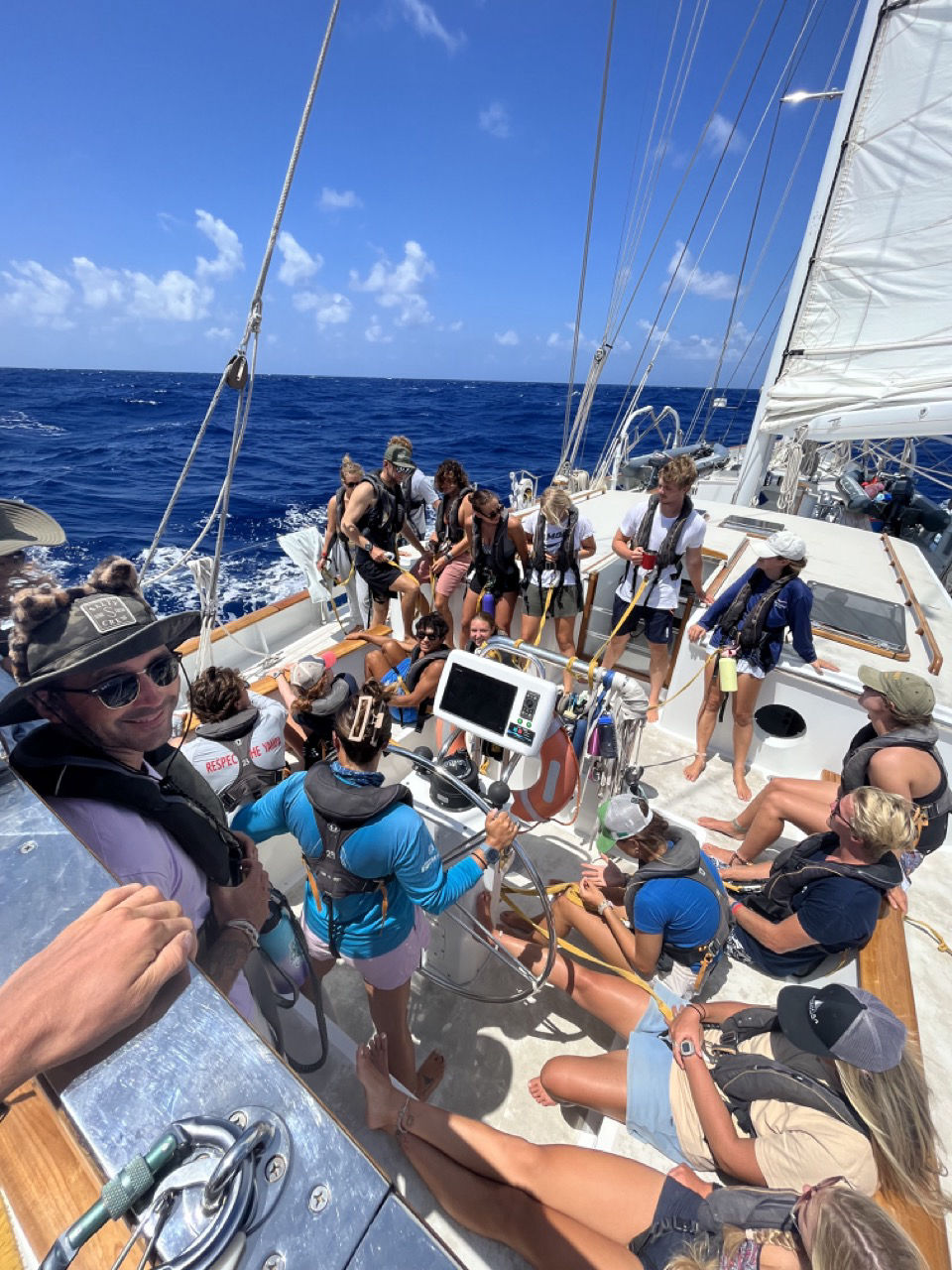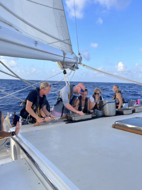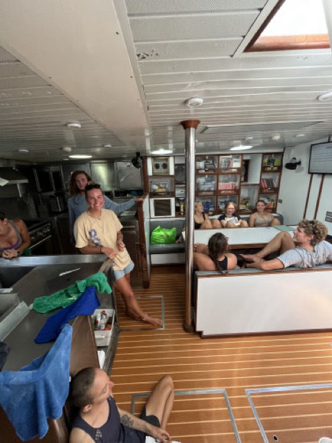 The early mornings began with many people breaking out their foulies for the first time, for during night watch, there were some wicked squalls out in the distance. By the grace of God, the foulies ended up only being a fashion staple as we narrowly missed the rain. There was a team of early risers who got dialed in and ground out the rest of their literature review essays and revised for the fish log exam. The wobbegong shark was a key question. We started the official day at lunch, and due to the very big waves, we remained clipped so we wouldn’t be launched out into the great abyss. Due to these tremendous waves, we planned to serve our food down below. This is the first time we’ve done this so far and also the beginning of the end for young Wes. After our delicious spicy chicken tacos cheffed up by staff Ali we began clean-up. During clean-up, as the gopher hatch was open and innocent, Wes was working hard for the team. A humongous wave hit the boat and crashed through the gopher hole and made Wes a victim. The great sport he is, he didn’t allow the fact he was soaked head to toe to deter his cheerful mood. As we cleaned up and finished, we had our highly anticipated leadership class, where the class voted for individuals to give a presentation on a topic not of their choice with no preparation.