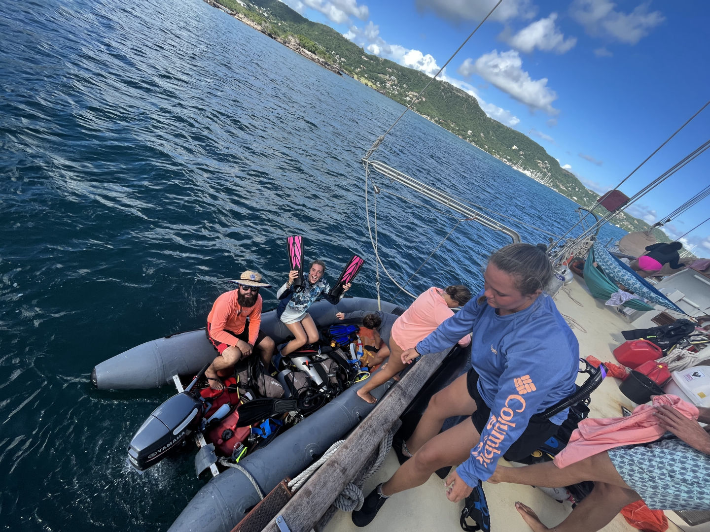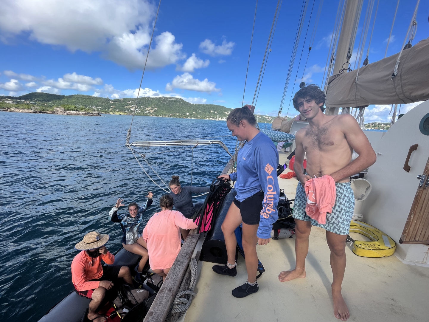 Rise and shine. Shockingly, I didn’t wake up the crew with my usual pots and pans. Instead, I decided to go for the classic wake-up music. The morning was slow moving, but we eventually made it to breakfast for Syd’s blueberry muffins with fruit and yogurt. After breakfast, we did our final research project presentations for oceanography. Crazy to think that was our last ever marine science class on Ocean Star. After the presentations, we had a seamanship class with Drew for our final VHF exams. We practiced our Mayday calls and learned the phonetic alphabet, then took our VHF exams. That was a wrap for all our exams for the semester. After, we ate couscous and veggies for lunch made by Sydney and the sous chefs. After clean-up, most of the crew went diving on their own!! A few of us stayed back, feeling a bit of the “finals flu.” While everyone dove, I spent time in the foc’sle, getting much-needed rest. When the others returned from their dive, we heard all about their amazing sights. Some saw a huge eagle ray, and others saw an octopus. It was awesome to see everyone diving on their own for the first time. After diving, we had some time to relax before dinner. Sydney outdid herself again with her famous pizza. Crazy enough, it didn’t rain this time when she made it. We enjoyed some pizza with salad and veggies; then we were off to bed. That’s all I got for you.