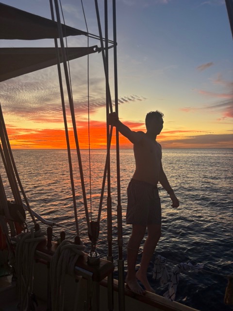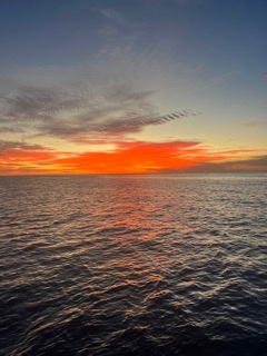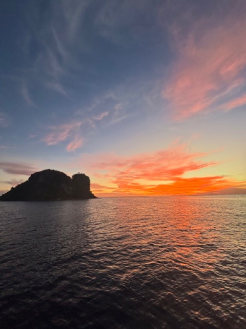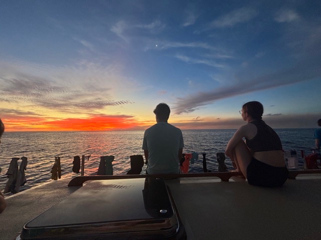 We made it back to the boat right before sunset; a few people saw the green flash! For dinner, we ate a Thai dish since Argo was built in Thailand. Every night, we do the squeeze, and you go around in a circle and answer the skipper’s question of the day. Today’s question was, “What is the trippiest thing that has ever happened to you?” We have some crazy stories, and it turns out a few of us have met before this trip without knowing :0 Open Water students will be taking their written test in order to get certified tonight. YAY… then we will go to sleep or have anchor watch…. ya never know!