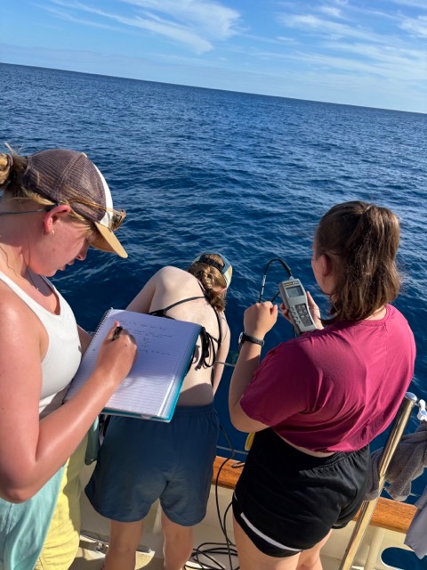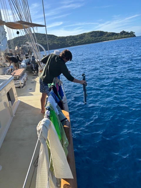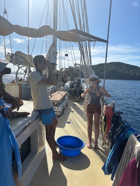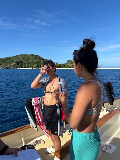 So, we woke up today with an amazing sunrise. The island we are anchored by is insanely beautiful! After eating turmeric coconut bread for breakfast, we cleaned up and had a science equipment lab. Anna and Steph pulled out tons of items for us to complete certain objectives. We had to find the salinity of the ocean’s surface as well as the temp, depth beneath Argo, and amount of visibility beneath Argo, and to find a species to examine under a microscope.