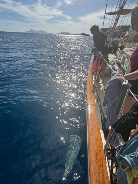 For lunch, we ate a delicious buffalo chicken and/or tofu salad. The open water students did a quick snorkel test while navigating with their compass to work towards the completion of their OW certification. Soon after, we all hopped in a dinghy with our dive kits and headed to our dive spot. The reef where we were diving had so much visibility you could see everything on the sea floor from 25 feet above the surface! After two dives led by the DMTs (Dive Masters in Training), we headed back to Argo.