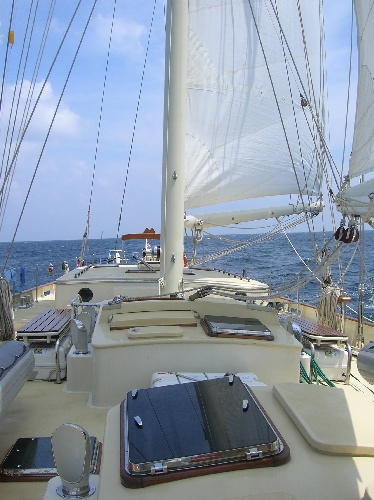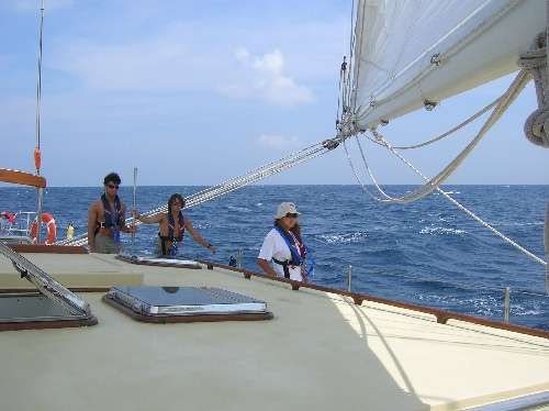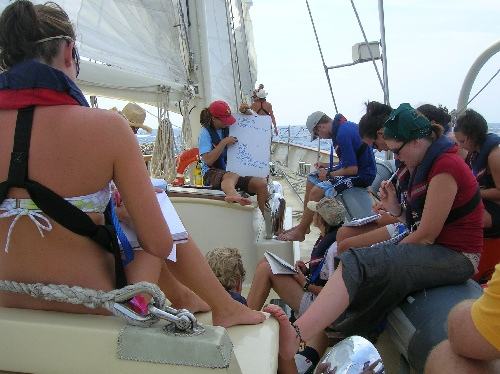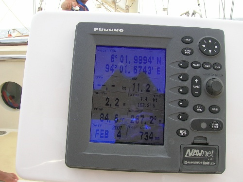 After a night dodging tankers at the northern end of the Malacca Straits, we made it out into the Indian Ocean through the Great Channel. The swells subsided a little bit, but the wind has been blowing steadily, and this afternoon we had all six sails up for the first time this trip. Will all that canvas and favorable winds and seas, we’ve been racing along at a steady ten knots and even set a new calm weather speed record for Argo with an impressive 11.2 knots. We had two classes after lunch, but mostly everyone was just settling into the comforting routine of watch. With another 170 miles under our belts as of this morning, it will be great to see how many we’ve raced through in the past twenty-four hours.