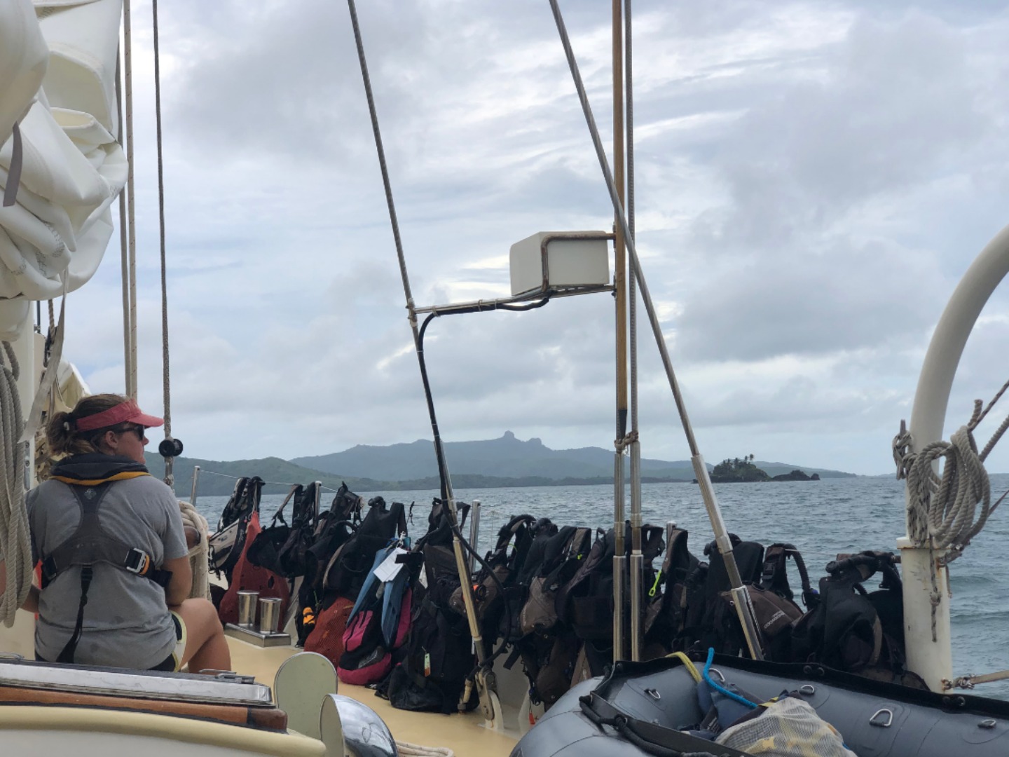 Today we got a small taste of passage again we brought up the anchor right as the sun was rising and started making our way over to Naviti, an island in the Yasawa Group known for its manta rays (!!!) The sunrise was absolutely beautiful, and as we started motoring over, we began to pass island after island, each one more green than the next. We marveled the whole time at how beautiful Fiji is I never knew I could see so many shades of green on one tiny island. We were heading pretty much straight towards the waves, so we got lots of sea spray today everyone from bow watch came back to the cockpit drenched, but with a huge smile on their face; looking out over the bowsprit as Argo dipped down into the waves was definitely another “Seamester moment” to add to our list. We had broken into two-hour watch rotations, so each watch team got a two-hour encore for our last week in Fiji, which was greatly appreciated.