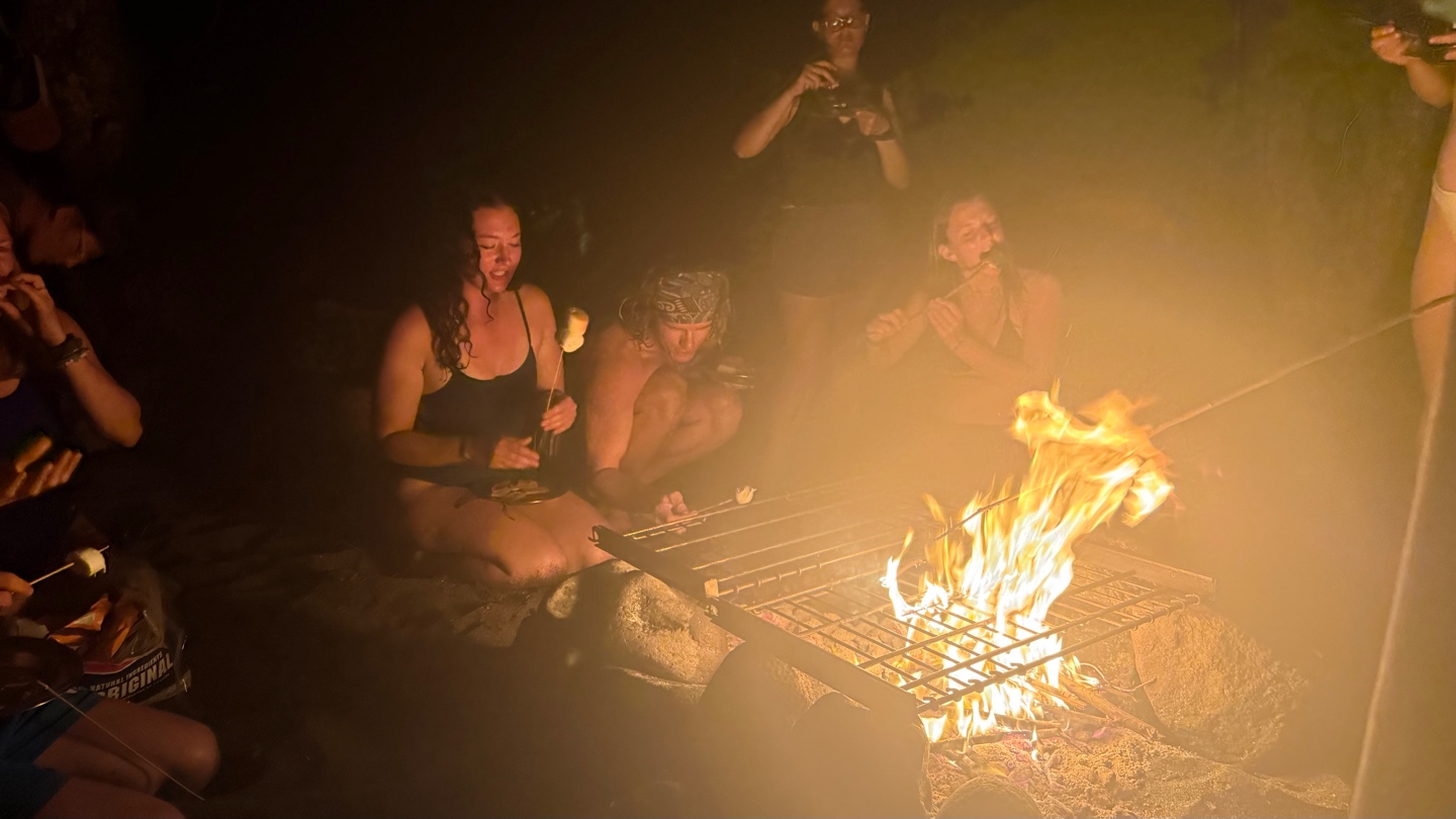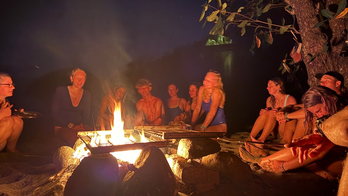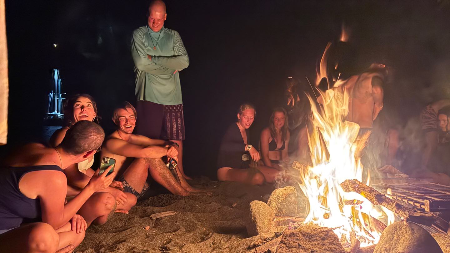 No time was wasted. Once we were all back on board a dingy filled with food, charcoal, Calum, Dave, Kiki and Olympus went ashore to light a fire! Tonight, in true South African spirit, head chef Calum whipped up a beach Braai, the South African version of a BBQ. While we waited for the food to cook, we played volleyball and frisbee and ran underwater holding a huge rock -Kackie’ss favorite game. Smores followed the hot dogs, along with yoga led by Shane and a capella song singing. A late night swim back to Argo and a late dishy pit finished the crew off for the evening.