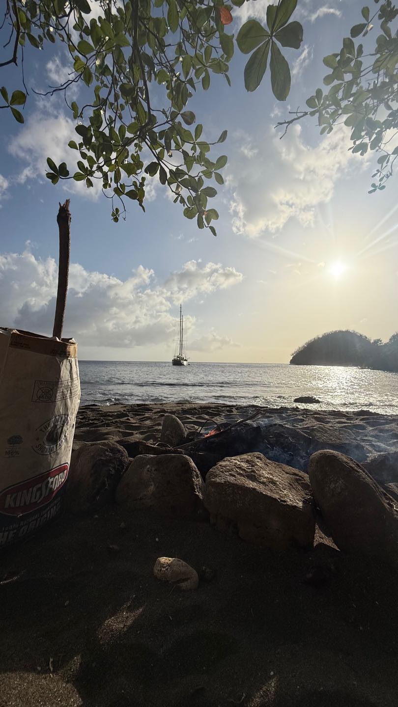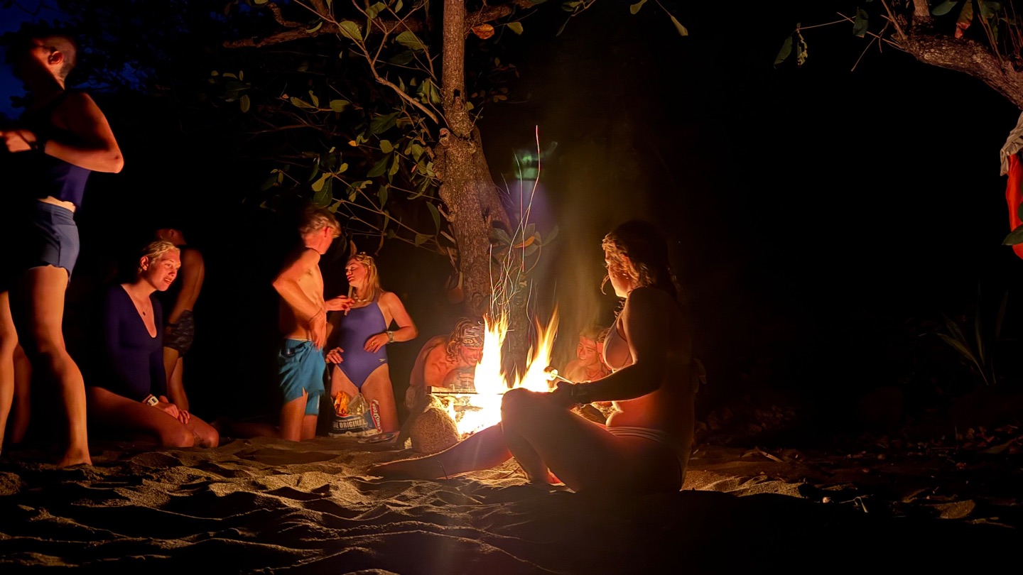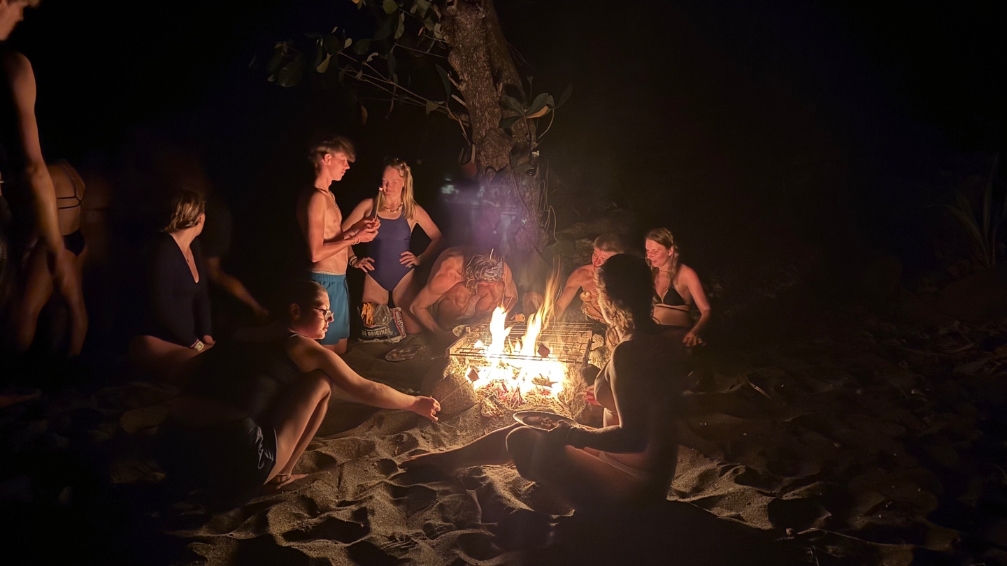 No time was wasted. Once we were all back on board a dingy filled with food, charcoal, Calum, Dave, Kiki and Olympus went ashore to light a fire! Tonight, in true South African spirit, head chef Calum whipped up a beach Braai, the South African version of a BBQ. While we waited for the food to cook, we played volleyball and frisbee and ran underwater holding a huge rock -Kackie’ss favorite game. Smores followed the hot dogs, along with yoga led by Shane and a capella song singing. A late night swim back to Argo and a late dishy pit finished the crew off for the evening.