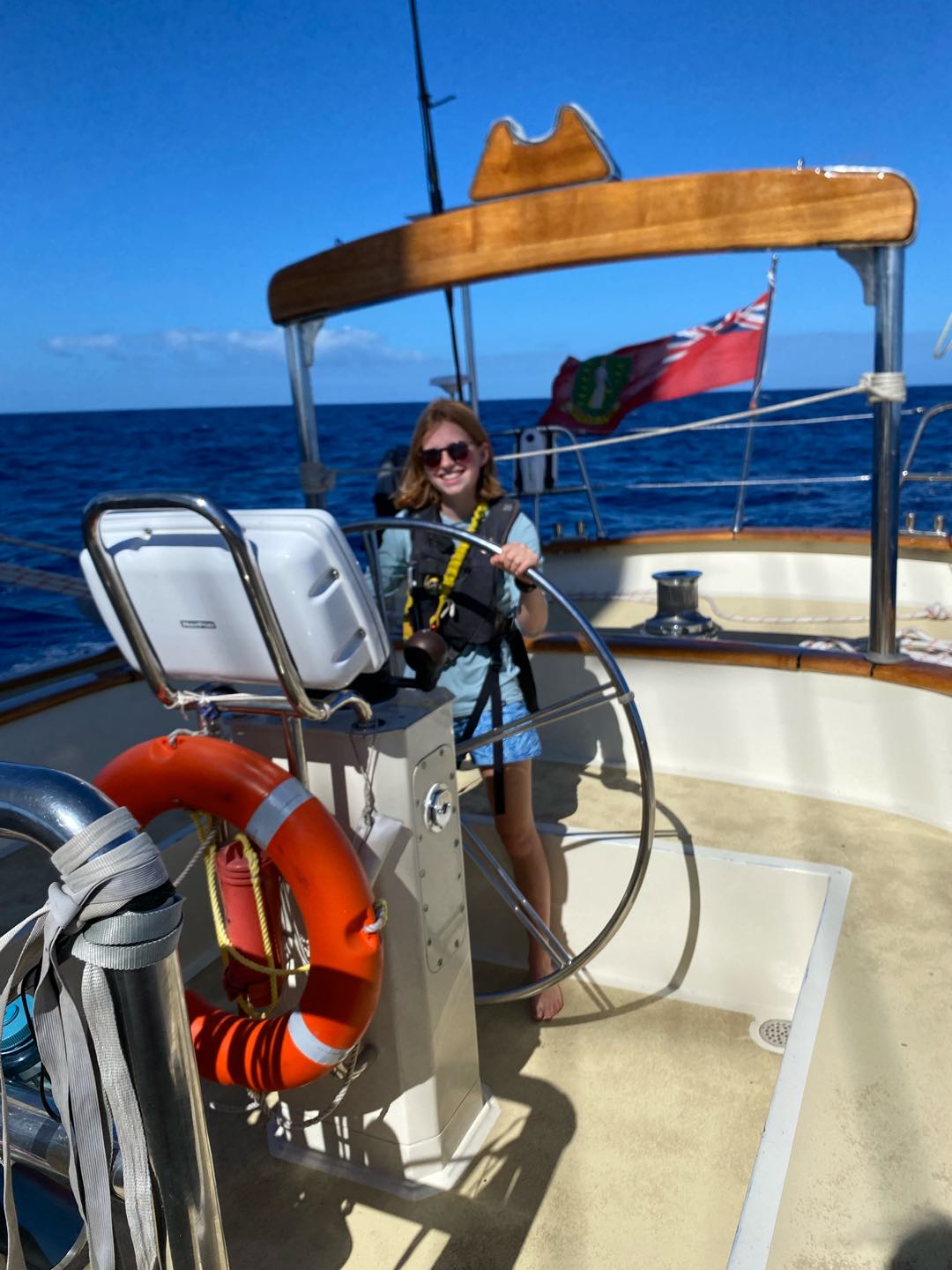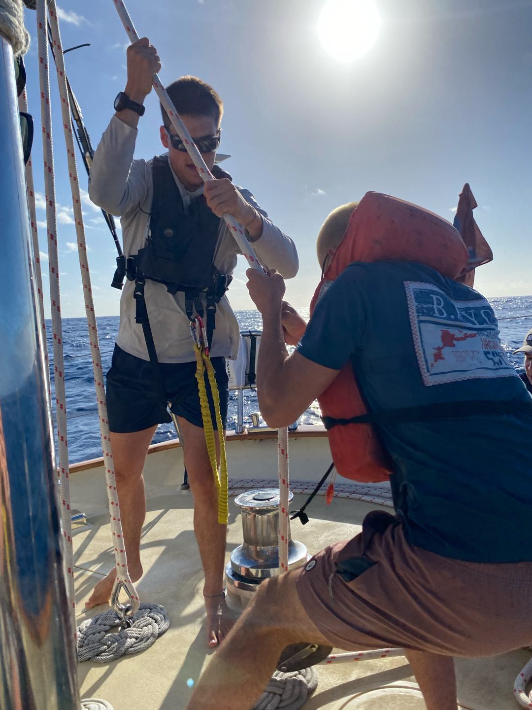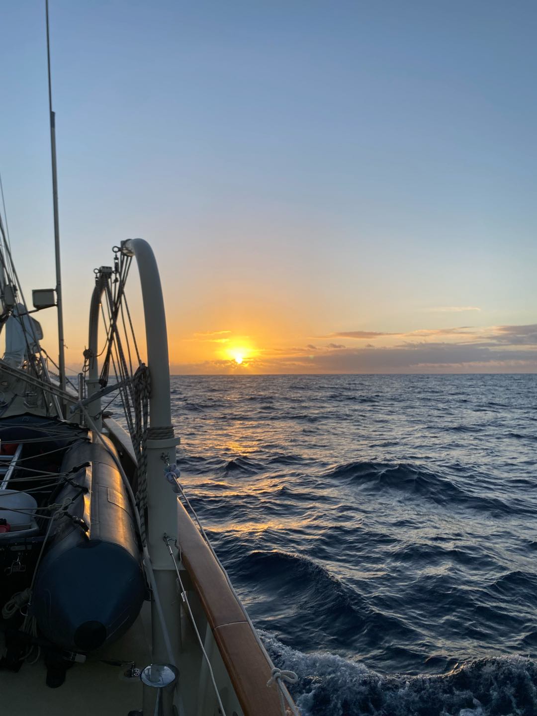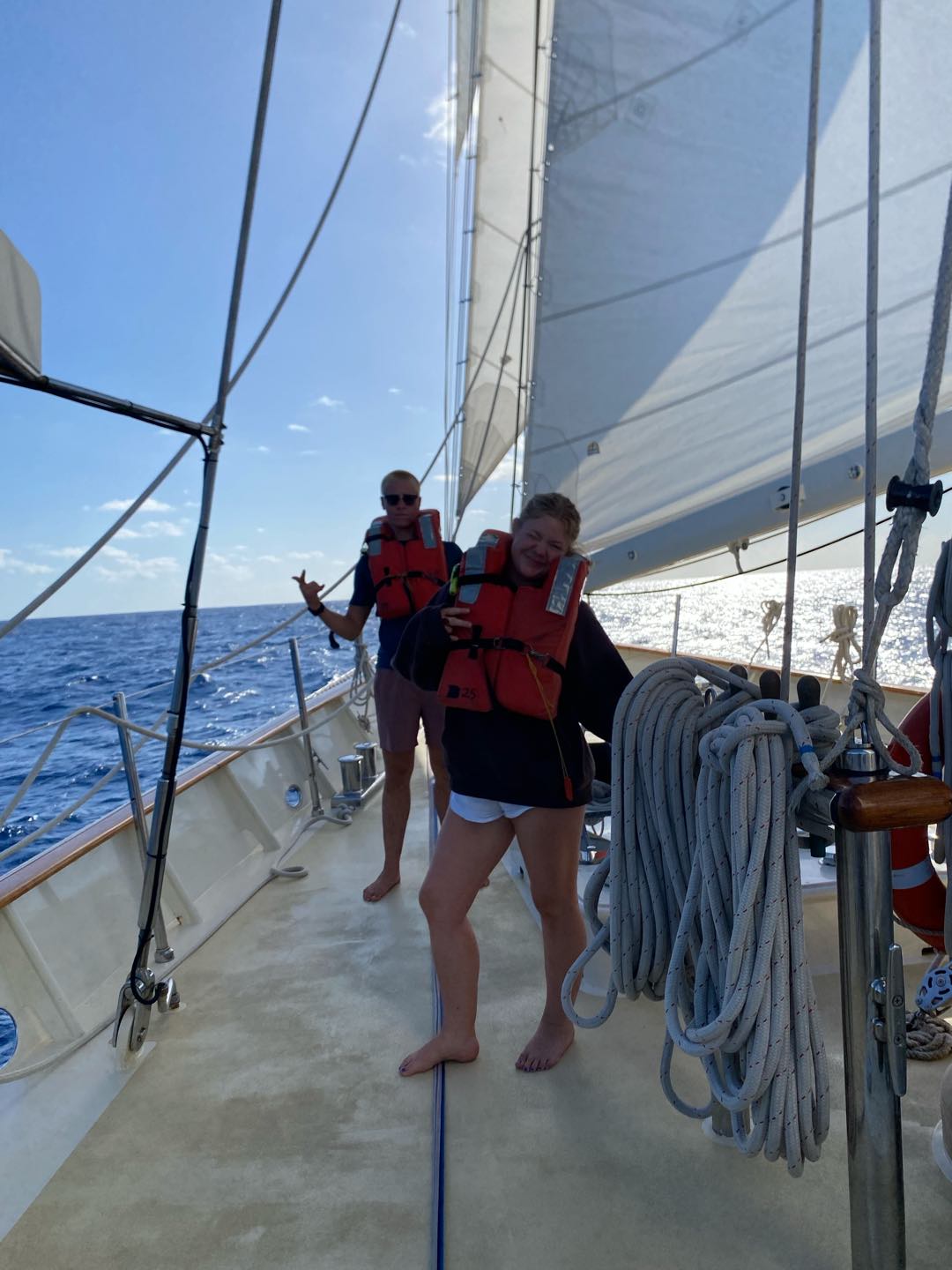 My morning started dark and early at 3:30 in the morning for my first full watch with my new watch team, watch team 6(3). I enjoyed having all new people, including Charlie and Rachel as leaders, and Chloe, Emily, Liv, Matt, Teo, and Sam on my watch. I loved watching Emily and Teo yell at everyone because no one was talking. It has definitely been a big change-up, but I think we are already starting to get into the groove of things. I finally got to helm with the sails up, which is a lot harder. I definitely need more practice. I went back to bed at eight and had a fantastic nap until lunch. Afterwards, we had marine bio and seamanship. I was on the 2-6 watch, so I got to hang out on the deck after classes. I did more sail handling than I have this whole trip, sorry Shane. I got to go out on the bow sprit with Charlie and flake the jibs for the first time. It was really fun.