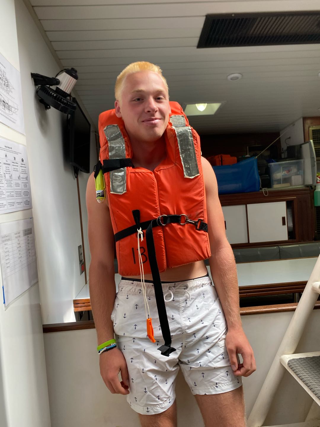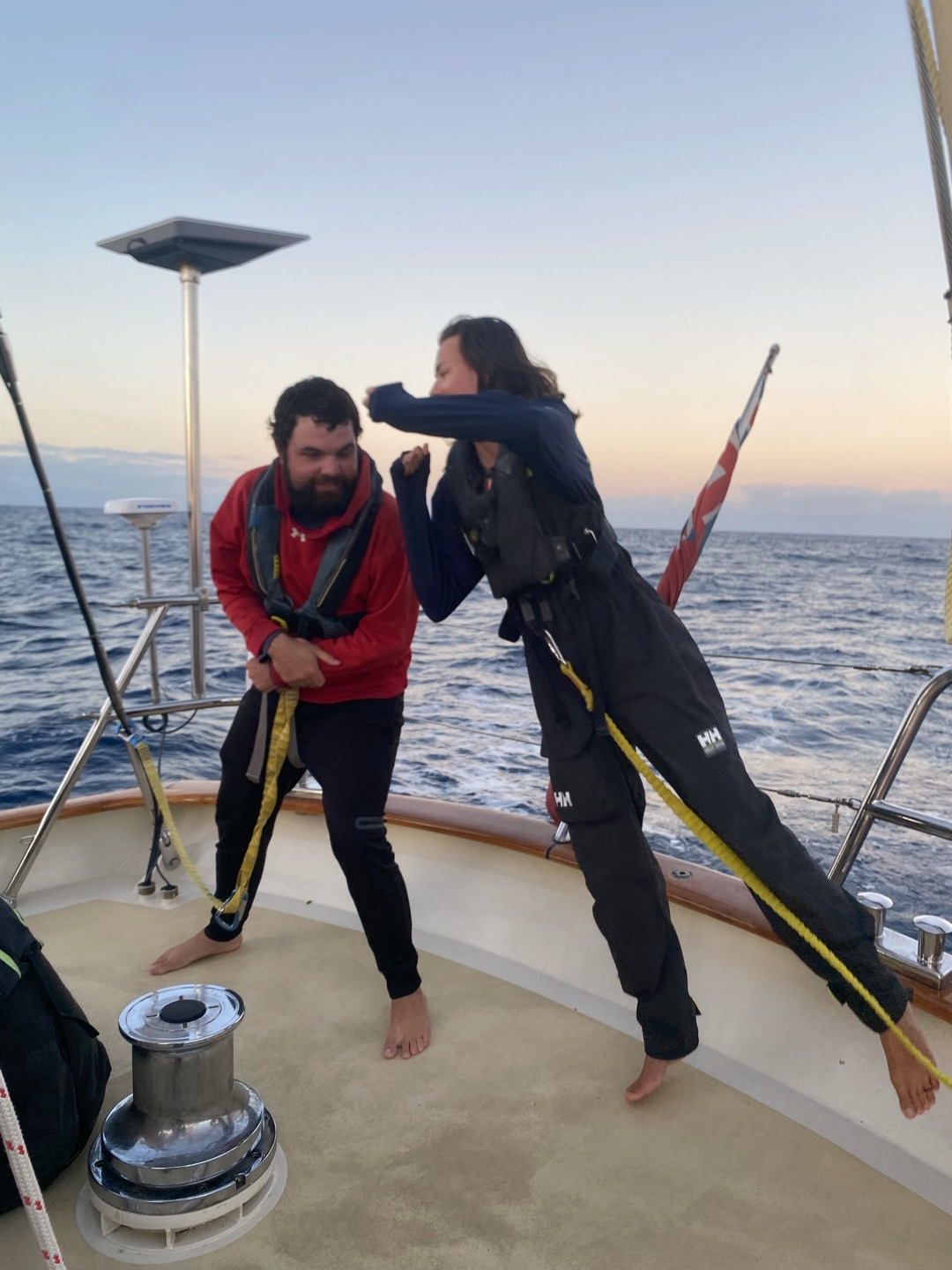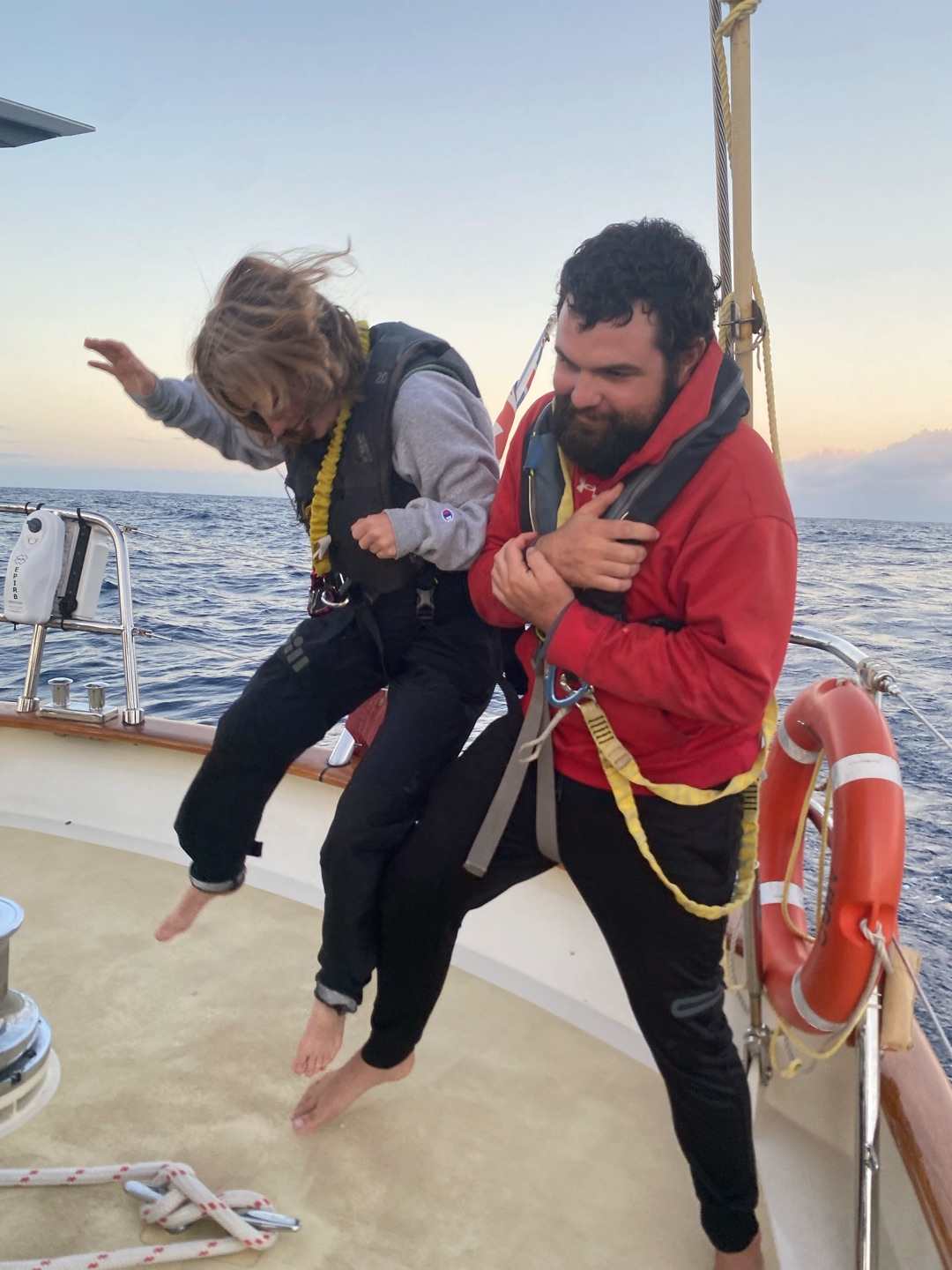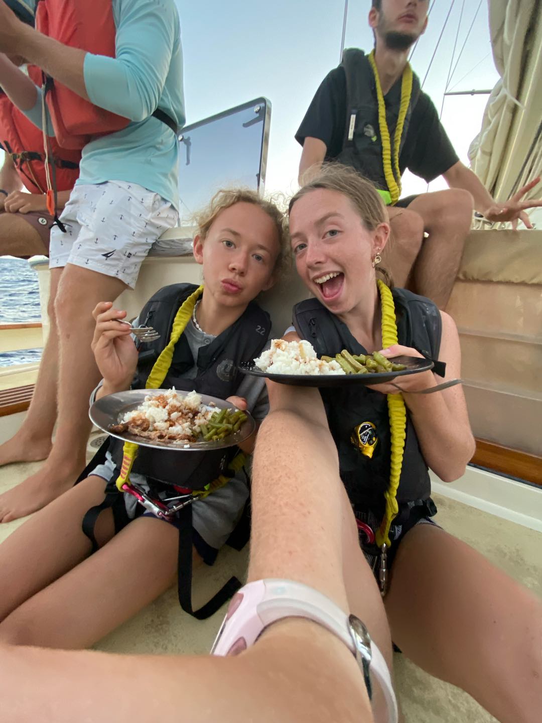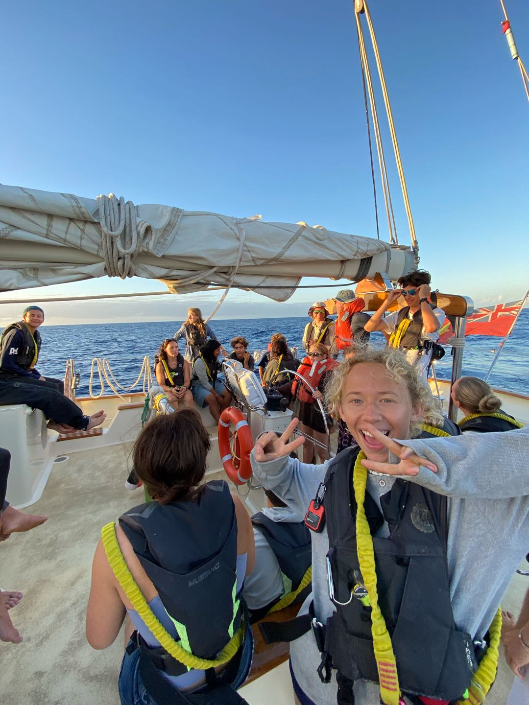 My morning started dark and early at 3:30 in the morning for my first full watch with my new watch team, watch team 6(3). I enjoyed having all new people, including Charlie and Rachel as leaders, and Chloe, Emily, Liv, Matt, Teo, and Sam on my watch. I loved watching Emily and Teo yell at everyone because no one was talking. It has definitely been a big change-up, but I think we are already starting to get into the groove of things. I finally got to helm with the sails up, which is a lot harder. I definitely need more practice. I went back to bed at eight and had a fantastic nap until lunch. Afterwards, we had marine bio and seamanship. I was on the 2-6 watch, so I got to hang out on the deck after classes. I did more sail handling than I have this whole trip, sorry Shane. I got to go out on the bow sprit with Charlie and flake the jibs for the first time. It was really fun.