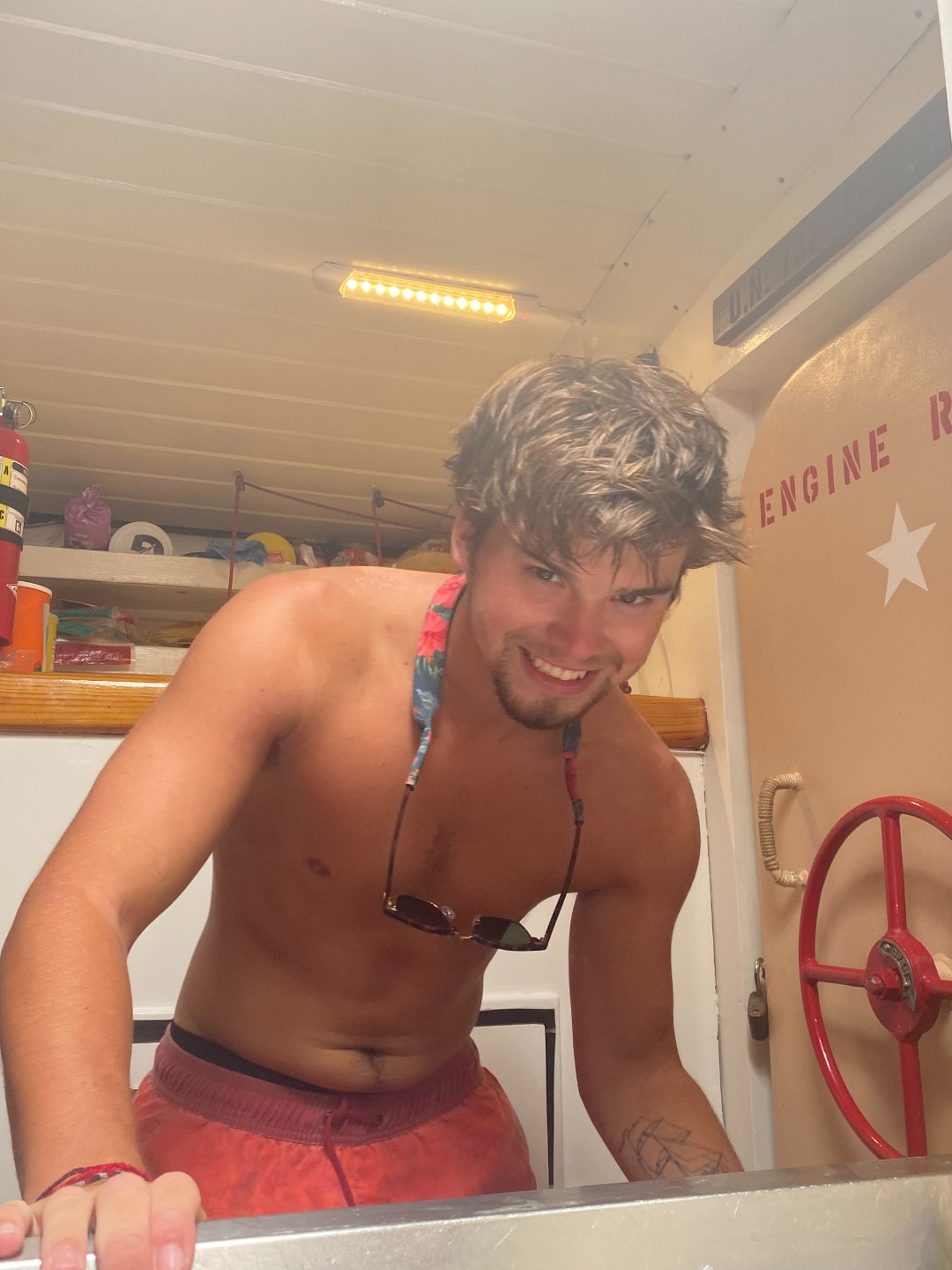 Meg, Katie, and Keaton had a good time swimming around the boat. I wish I knew how to swim. I also wish I had arms and legs and that I wasn’t attached to the deck. Grady and his chef team, Celia and Max, cooked up their famous (Literally no one knows about them) enchiladas. They look really tasty! I would like enchilada night a lot more if ‘Topher didn’t always spill his food. I’m the one that has to clean it up, you know. I am glad that it didn’t land on his turtle shorts; those shorts are sweet. If I could wear pants, I would get a pair for myself.