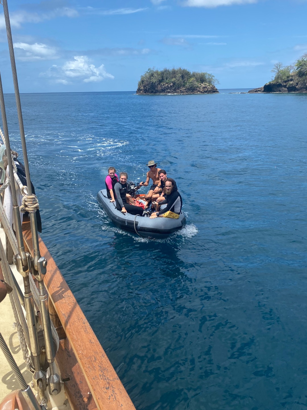 Then they had lunch. I’m not sure why these people eat Sriracha™️; they always end up having to drink so much water to try to cool their mouths down. Weaklings. Then they once again shifted below to talk about god knows what. Liam came up complaining about charts (Brahm won’t let me call them maps (Because they’re not maps)) and how much his head hurt. Johnny said that he would be confused if he knew anything about the charts, to begin with. Dive group two got their gear ready and rode off into the distance in the dinghy. I wonder what they do out there, but they can hold their breath for really long!