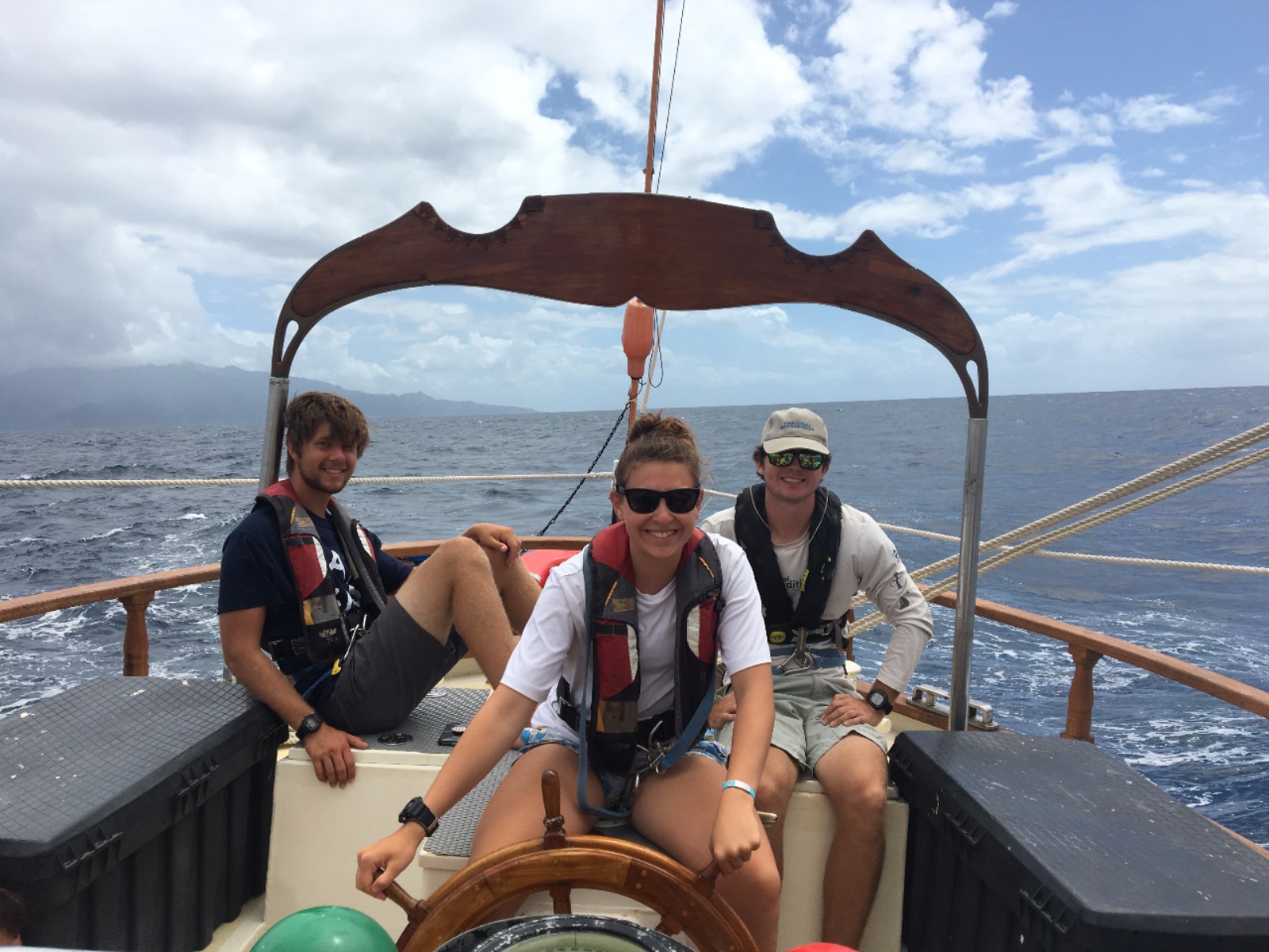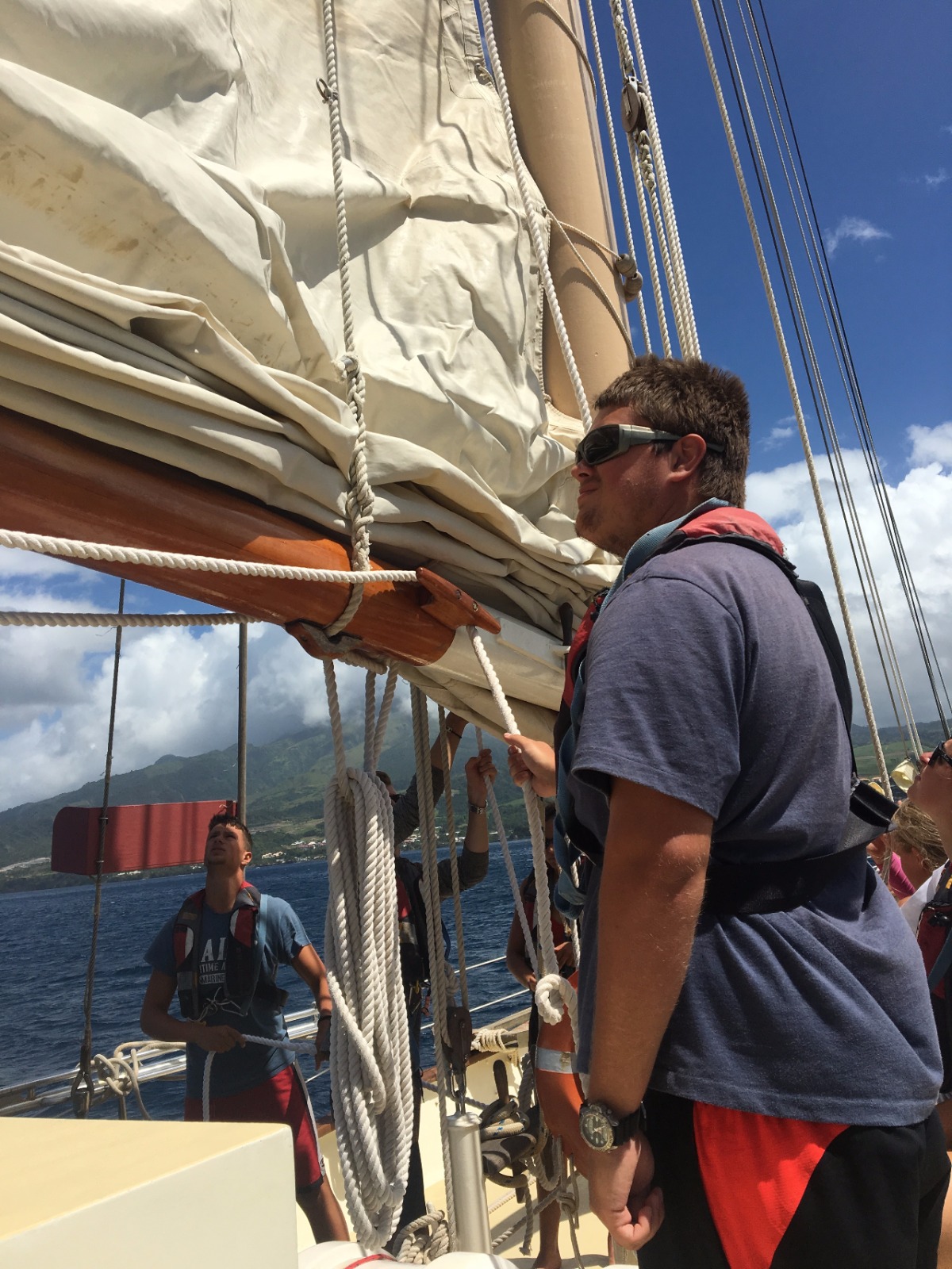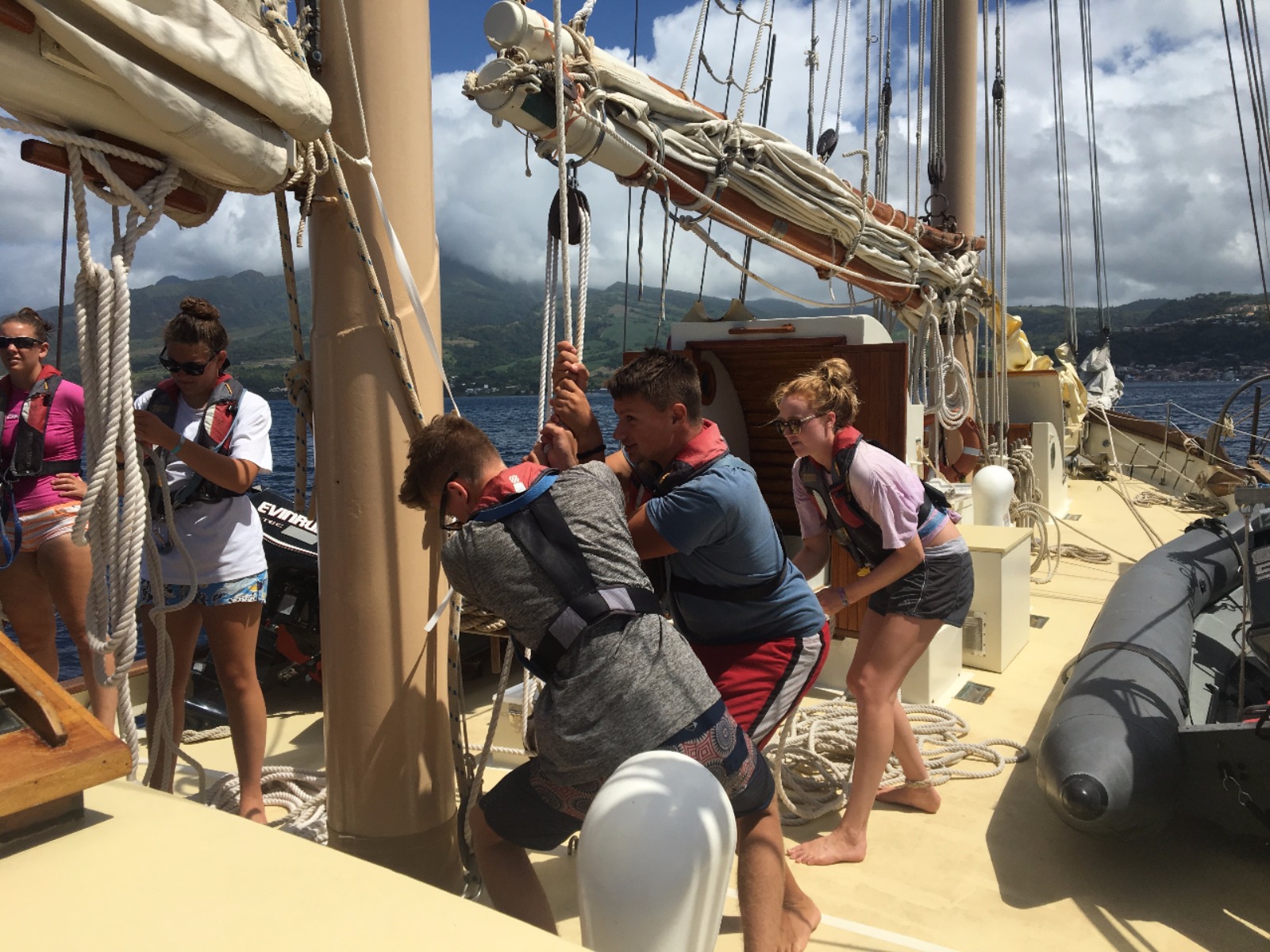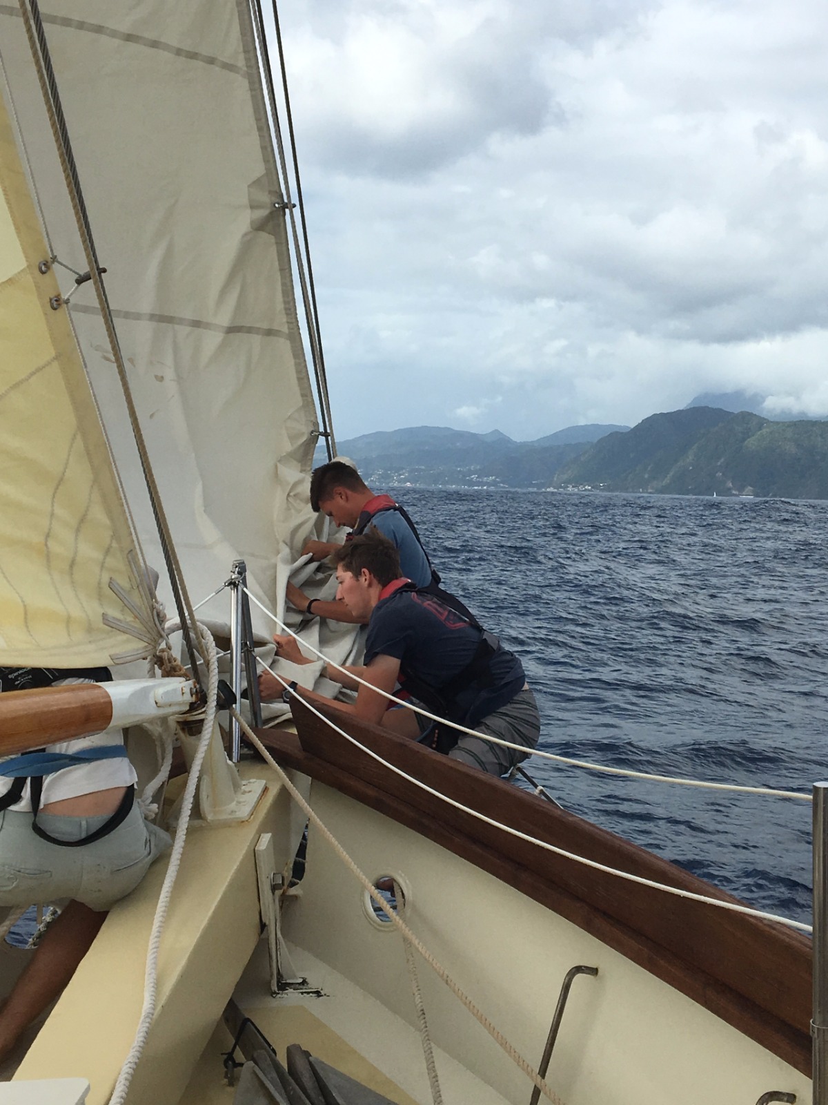 It was a busy day aboard Ocean Star. Unfortunately, all of the hard work moving the vessel in preparation for diving yesterday was wasted. The current shifted in the morning, causing the stern of the vessel to swing away from the dive site, which meant that we had to get the dinghies in the water anyway. It was a fantastic dive, regardless, and it gave us the opportunity to see a great number of sponges, anemones, and other marine life. Some students went on the dive just for fun, but a couple of students needed to gather some data for their research project. Abby and Anastasia set up a transect and surveyed the wreck for marine life. It looked like a really fun project. After we had recovered all of the divers, we threw up our sails in record time and made way for Dominica. We managed to beat the fall crew’s record of 10min 42sec and came in at a whopping 8min and 25sec. Eric and Ian said that they had never seen it done so quickly. We made our way out of the lee of Martinique and entered the Dominica Channel, which officially separates the Windward Islands from the Leeward Islands. The wind condition allowed us to throw up the jib, and we cruised along at a happy 8kts all the way to Dominica. Right as we crossed into the lee of Dominica, the wind died immediately. The tall mountains that abut the coastline make for an impenetrable windshield that becalmed the water almost as fast as the wind. We motored the last little bit of the way to Sea Kat’s mooring, where we tied up for the night. We will be getting a good night’s sleep tonight because tomorrow we hike to the Boiling Lake!