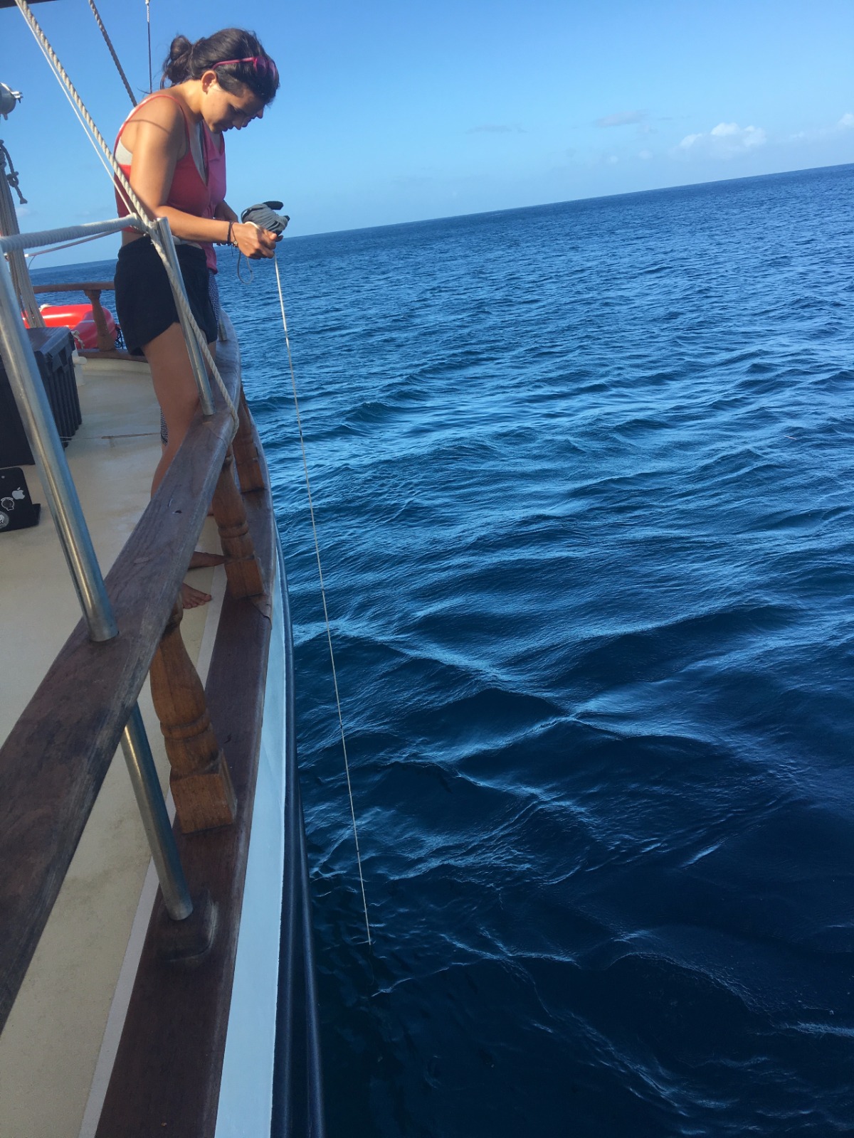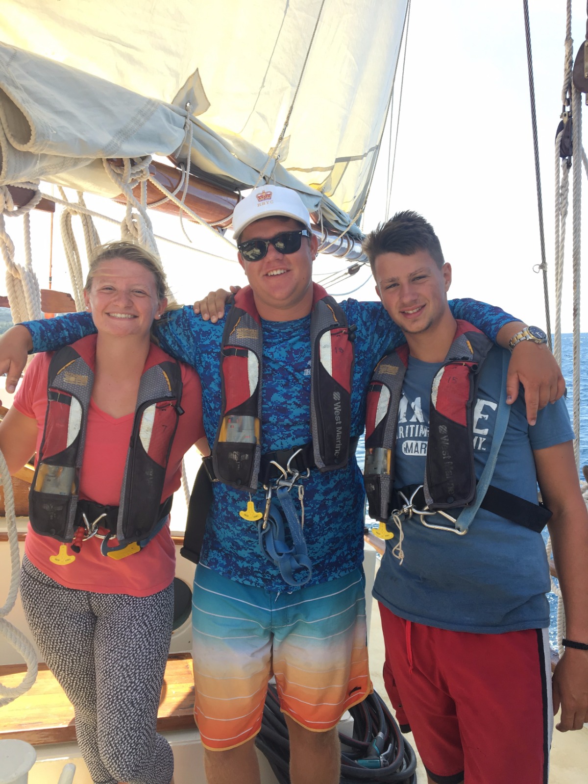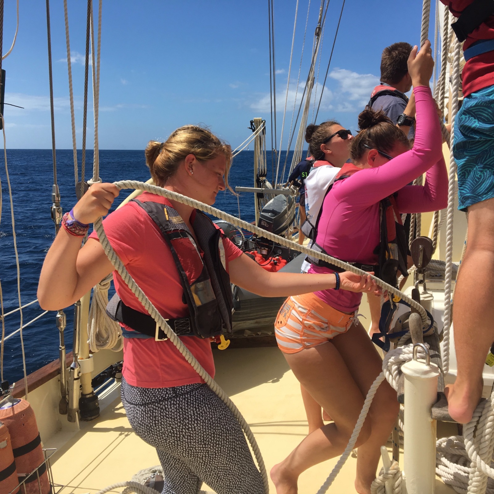 It was a busy day aboard Ocean Star. Unfortunately, all of the hard work moving the vessel in preparation for diving yesterday was wasted. The current shifted in the morning, causing the stern of the vessel to swing away from the dive site, which meant that we had to get the dinghies in the water anyway. It was a fantastic dive, regardless, and it gave us the opportunity to see a great number of sponges, anemones, and other marine life. Some students went on the dive just for fun, but a couple of students needed to gather some data for their research project. Abby and Anastasia set up a transect and surveyed the wreck for marine life. It looked like a really fun project. After we had recovered all of the divers, we threw up our sails in record time and made way for Dominica. We managed to beat the fall crew’s record of 10min 42sec and came in at a whopping 8min and 25sec. Eric and Ian said that they had never seen it done so quickly. We made our way out of the lee of Martinique and entered the Dominica Channel, which officially separates the Windward Islands from the Leeward Islands. The wind condition allowed us to throw up the jib, and we cruised along at a happy 8kts all the way to Dominica. Right as we crossed into the lee of Dominica, the wind died immediately. The tall mountains that abut the coastline make for an impenetrable windshield that becalmed the water almost as fast as the wind. We motored the last little bit of the way to Sea Kat’s mooring, where we tied up for the night. We will be getting a good night’s sleep tonight because tomorrow we hike to the Boiling Lake!