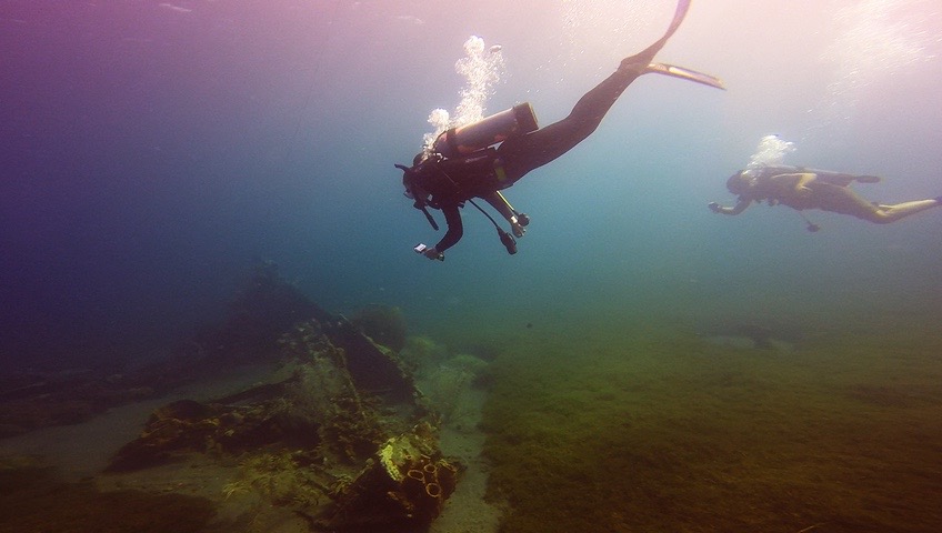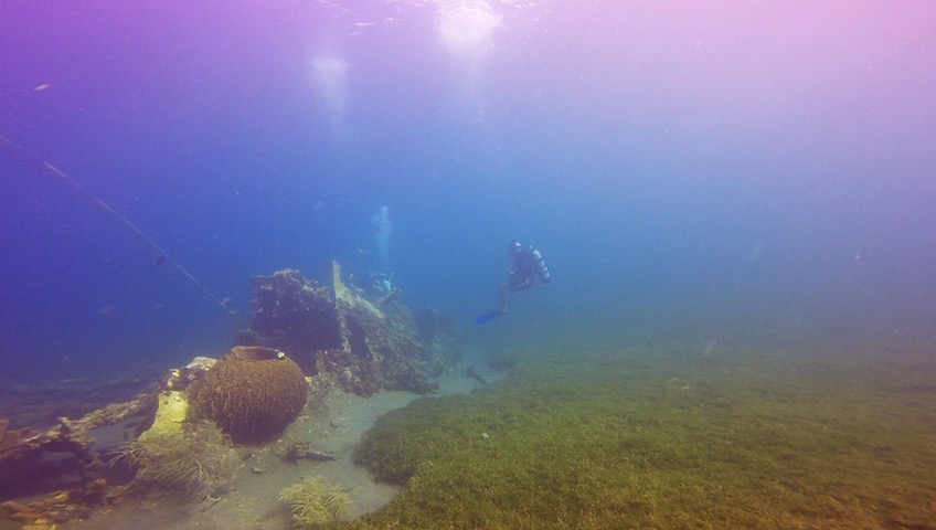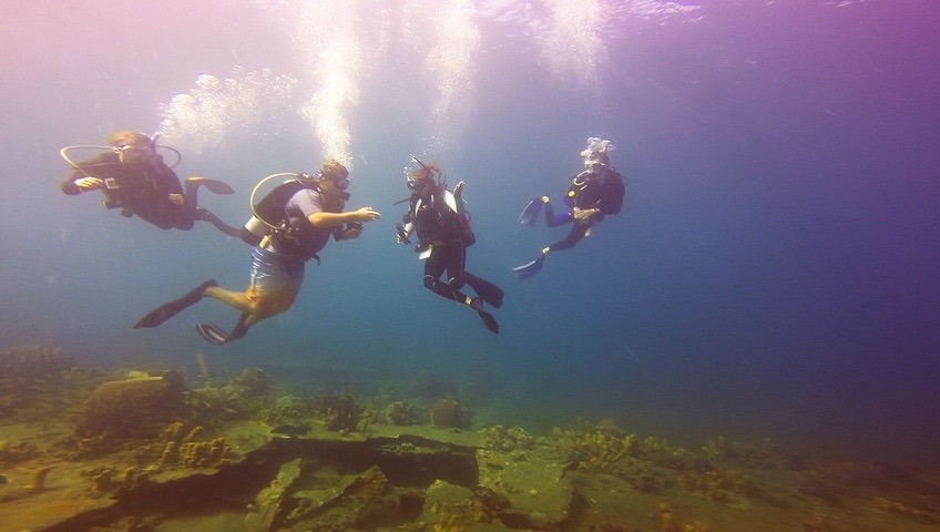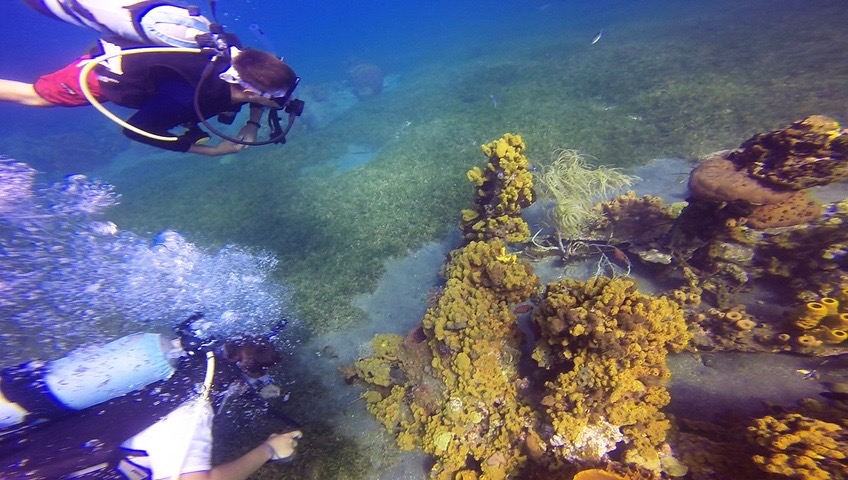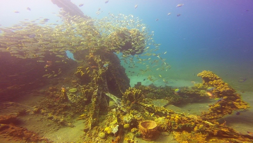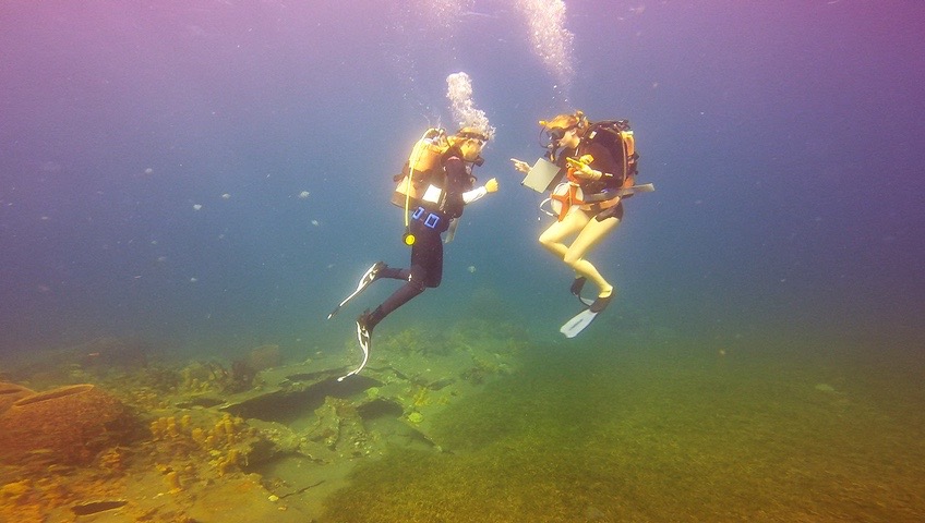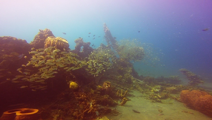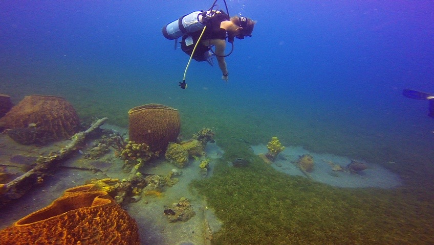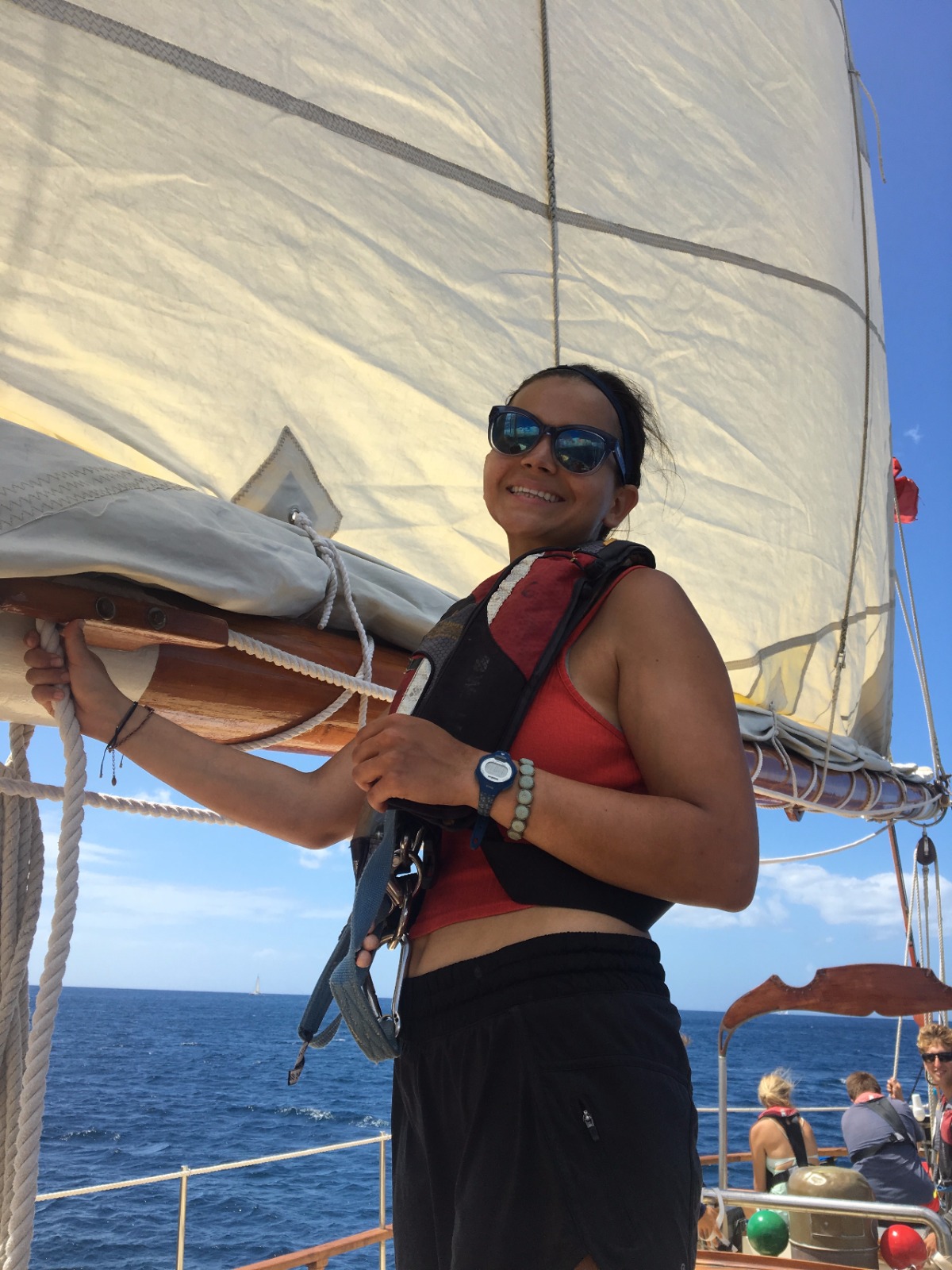 It was a busy day aboard Ocean Star. Unfortunately, all of the hard work moving the vessel in preparation for diving yesterday was wasted. The current shifted in the morning, causing the stern of the vessel to swing away from the dive site, which meant that we had to get the dinghies in the water anyway. It was a fantastic dive, regardless, and it gave us the opportunity to see a great number of sponges, anemones, and other marine life. Some students went on the dive just for fun, but a couple of students needed to gather some data for their research project. Abby and Anastasia set up a transect and surveyed the wreck for marine life. It looked like a really fun project. After we had recovered all of the divers, we threw up our sails in record time and made way for Dominica. We managed to beat the fall crew’s record of 10min 42sec and came in at a whopping 8min and 25sec. Eric and Ian said that they had never seen it done so quickly. We made our way out of the lee of Martinique and entered the Dominica Channel, which officially separates the Windward Islands from the Leeward Islands. The wind condition allowed us to throw up the jib, and we cruised along at a happy 8kts all the way to Dominica. Right as we crossed into the lee of Dominica, the wind died immediately. The tall mountains that abut the coastline make for an impenetrable windshield that becalmed the water almost as fast as the wind. We motored the last little bit of the way to Sea Kat’s mooring, where we tied up for the night. We will be getting a good night’s sleep tonight because tomorrow we hike to the Boiling Lake!