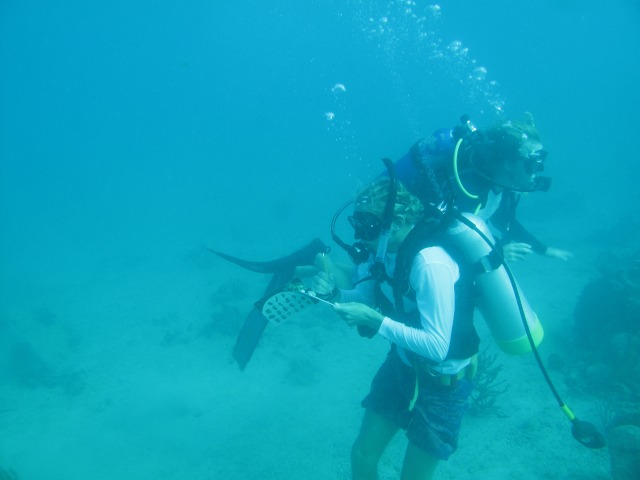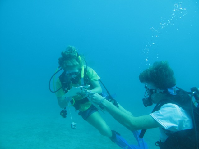 We had an anchor team hauling up to pull the bow into the wind, people reeling in lines from the dock, and Jon and Alex in Exy (our trusty dinghy) helping to push the bow of the boat off the dock. Ocean Star turned in her own boat length. In Tor’s words, we “killed it”!! Once we said goodbye to St. Barths, we came to a strange and somewhat terrifying realization that the dock in Gustavia, St. Barths, is the last dock we will see until we dock in Tortola at the end of the trip, which will, unfortunately, happen in about two weeks. After a 45-minute motor, we arrived at Ile Fourchue. We learned that the island was once populated by goats, but they ate all of the vegetation and eventually died off. Once anchored, we had some lunch and prepared for our first coral surveying dive. The first group saw a shark, which was the first time a shark had been seen on this trip!! Even though sharks are exciting, I saw a parrotfish poop for the first time, something I have been dying to see! (smile). We then had a delicious pasta dinner and some OCE to finish the night.