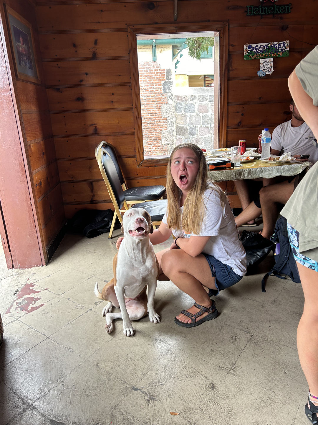 Today, we dove two sites. Both of these are wrecks. The first wreck was a barge and a small fishing boat at around 70ft. We saw a number of Barracuda, turtles, and sting rays. At the second site, there is an old fishing boat. Roughly 300ft in length at a depth of 85 feet. This boat was built in Taiwan and then used in St. Martin. While in St. Martin, it bashed the dock and put it out of commish. The government here in Statia bought the boat for a singular dollar. This was solely for the purpose of sinking it to form an artificial reef. This happened after the marine park was formed, causing the fisherman to lose their grounds and business. The boat was sunk just outside of the park. After diving, the lovely folks in the immigration office demanded to see our faces. Luckily, this turned into an easy process for everyone except for Freddie. The next part of our day took place at the Cool Corner, a Chinese bar and grill… as expected. Most people found themselves eating lunch here. The food was great, and the portions were large, the best of both worlds. At the end of lunch, Maddie cuddled and claimed a stray dog. Most steered clear at the sight of the large oozing tumor near its left hind leg. Not Maddie. After lunch, the group split up; some went to the grocery store, and