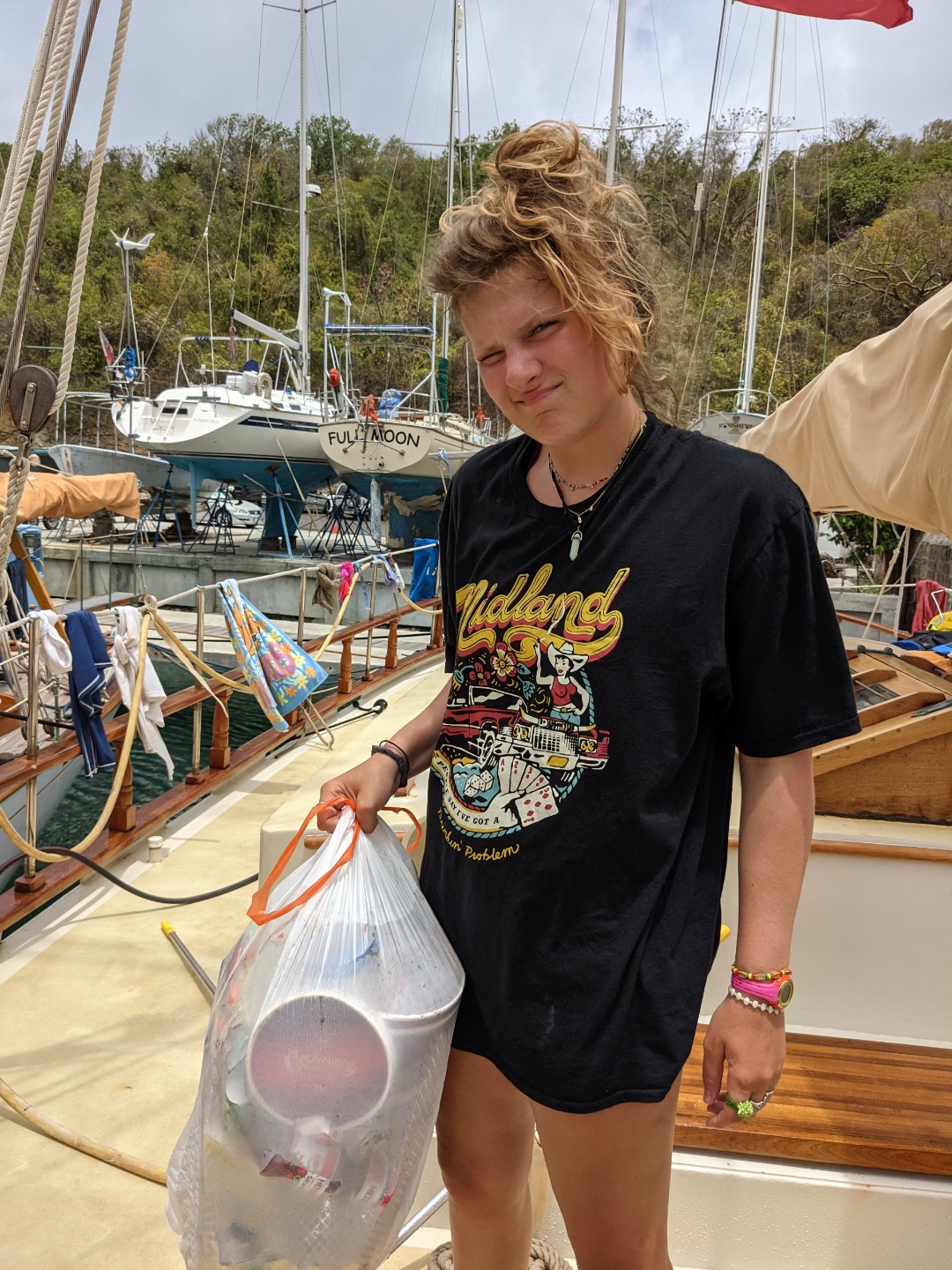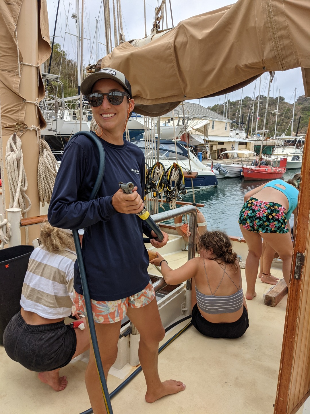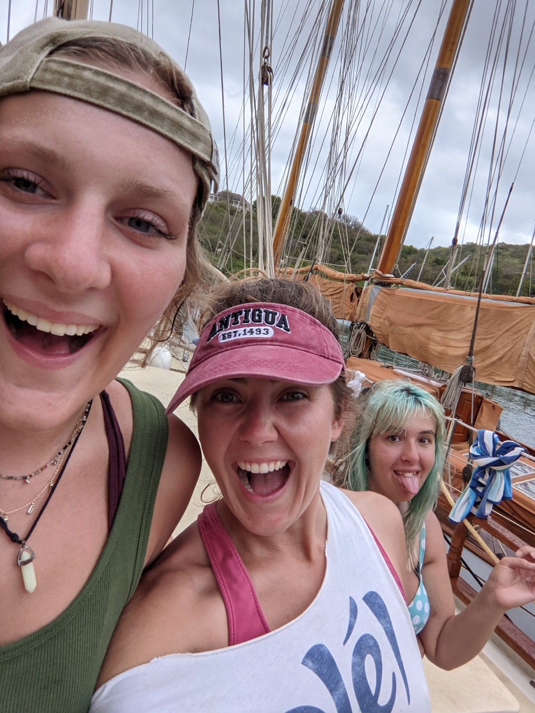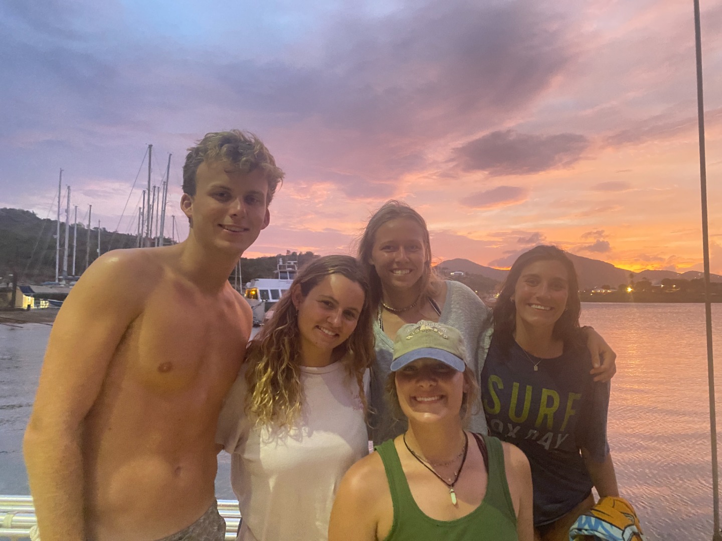 Lunch was shortly after, and as it turned out, not many people were very hungry. Nonetheless, we attempted to eat sandwiches – and let me tell you, the lettuce slices were perfectly sized (none of this shredded business). Though we still did have a lot of lettuce, and food in general blow off our plates and onto literally everything else – people’s faces, the drain, a foot, you name it. It was quite windy today – some might even say it was really whistling. And if it’s whistling in here (we’re tucked into a marina and very protected by a bed of mangroves + a very large hill), we know the wind is ripping outside the harbor, which sadly meant no diving. womp womp. However, that did mean that we could have a “choose your own adventure” afternoon! Seems most people chose the adventure of Nelson’s dockyard. A lot of food was eaten, a papaya was bought and carried around like a baby, a surf shop was scoped (only to find out it was closed), and souvenirs were bought. Just so everyone is updated, Arlo – Ellery’s dog – did get an Antiguan flag bandana so that “he can feel like he went to Antigua too.” AND. A perfect, not quite rusty pink but more of an acid wash maroon visor was purchased for me!!! What a win!!! I am very excited, though Smash and Ash agree that I look like a mom in it. But that’s ok. Moms are super cool.