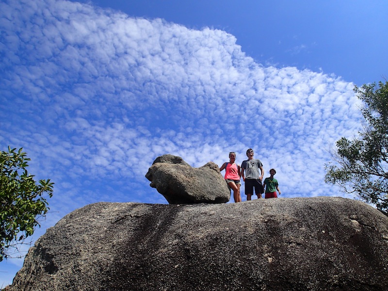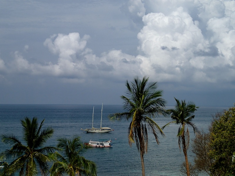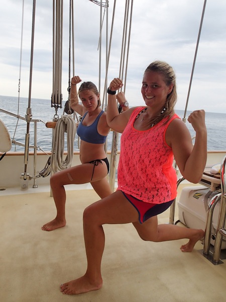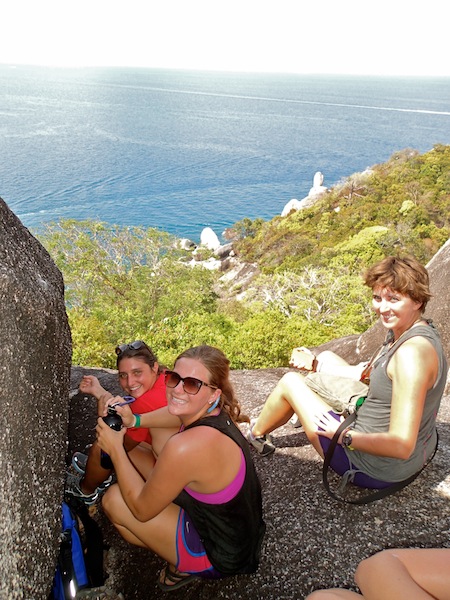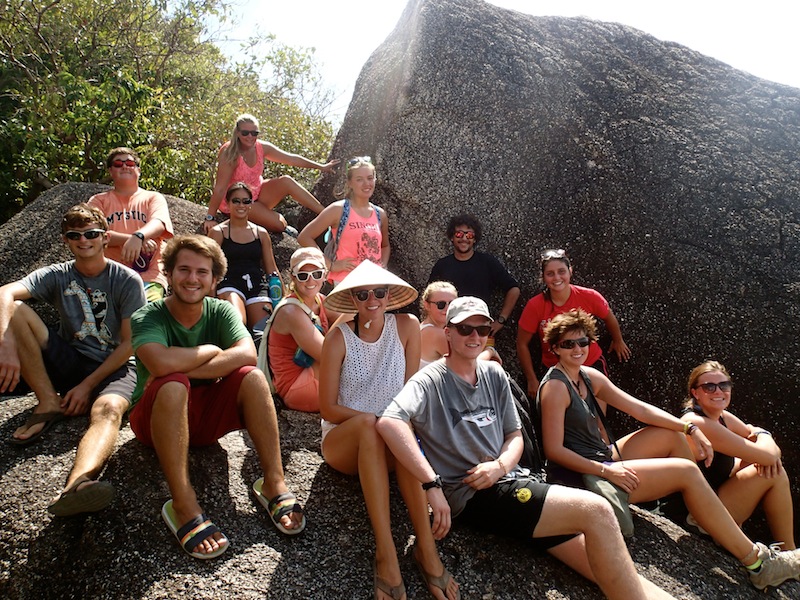 One of the trip’s best views was achieved at the top of a steep hill this morning after a hot and sweaty hike. After battling valiantly through bushes, rocks, and sand, the crew of Argo summited a magnificent rocky overlook that gave us a sweeping view of the bay. After clambering about on the granite, snapping photos, and drinking in the view, we all descended to explore the village in the bay for the remainder of the day. Delicious Thai food and mango shakes were in order for most of us, along with a break from our isolated paradise, to use the free WiFi. We explored the streets of the village, indulging in snacks at the grocery store and, for Morgan and Giulia, Thai massages on the beach. I particularly enjoyed the laughably typo-ed signs that lined the streets, as well as the frequent commuters who had trained their dogs to ride with them on their motorbikes (big dogs, too – I saw a Labrador balanced between the seat and handlebars, hanging on for dear life!). After satisfying our need for shore time, most of us returned to Argo to squeeze in some last-minute studying for our final in Oceanography, which takes place tonight. It seems fitting that as I write this, everyone is rushing through clean-up to get below before a nearby storm catches us. Let’s see who was paying attention to the meteorology section of oceanography and can tell us what the wind is doing! Hopefully, we will all make it to our exam dry, but this crew is no stranger to rain. Either way, it has been a good end to a glorious day of stretching our legs and seeing all there is to see high up on the island. Here’s to another wonderful day tomorrow.