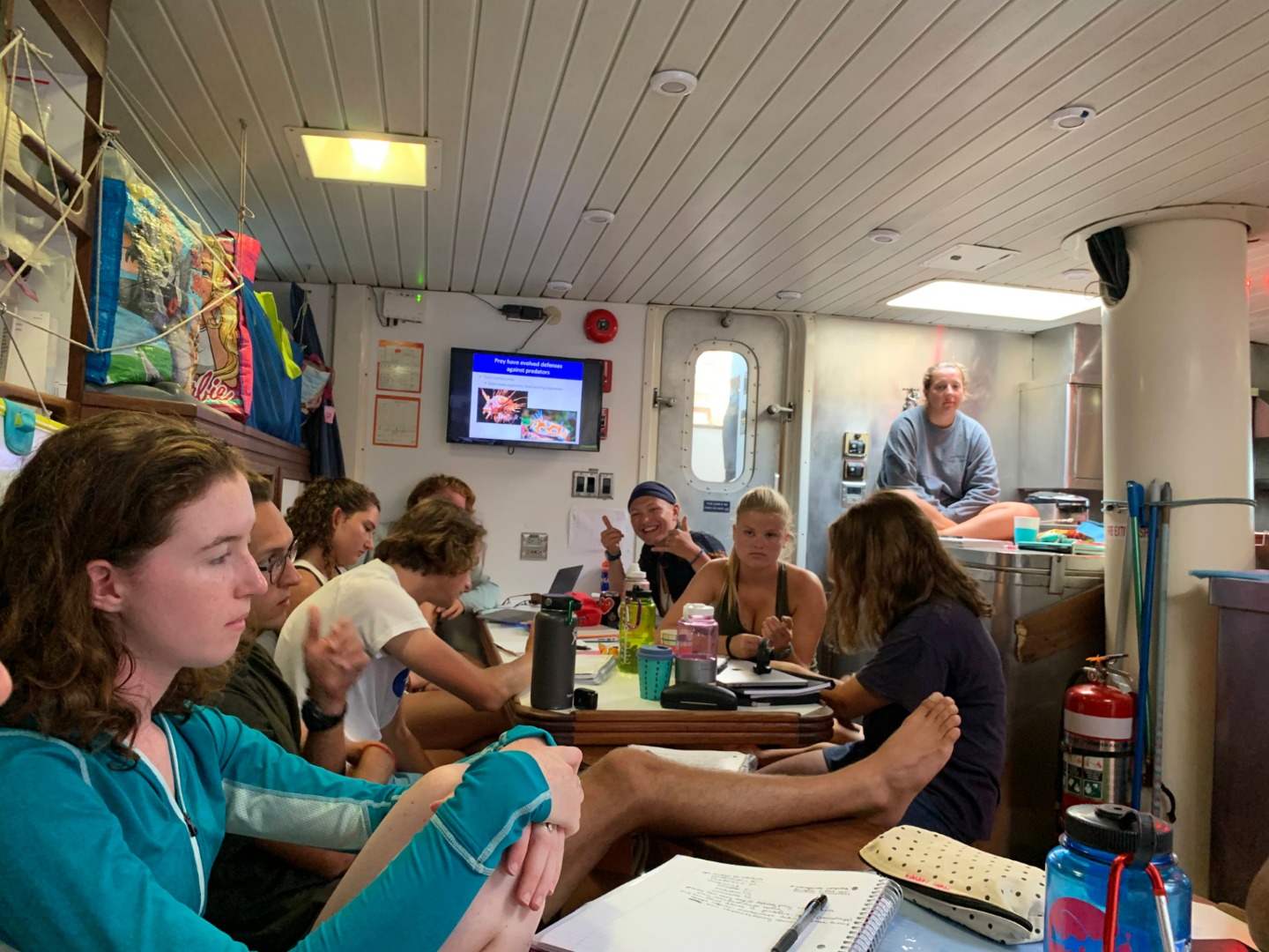 Today, the early morning watch woke up to a beautiful sunrise. Breakfast and early morning was exciting because we got to test out all the fun snacks we had bought in Kupang. All the exciting snacks made the 4 am watch pass by much faster. We spent the day enjoying the calm water and listening to good music. We were super lucky and got to see more dolphins playing in the waves this afternoon. After an amazing lunch, we did our jobs and got ready to go to class. At that point, we had traveled about 150 miles from Kupang, giving us an ETA of about 6:00 am in Komodo. Oceanography and marine biology were fun, and it was exciting to get into more of a routine. After class, we took showers and did homework. Dinner consisted of catfish, broccoli, and noodles, which we ate while watching the sunset. After the sun went down, the water was lit up with bioluminescence. The stars are incredible tonight, and everyone is excited to arrive in Komodo and to get in the water.