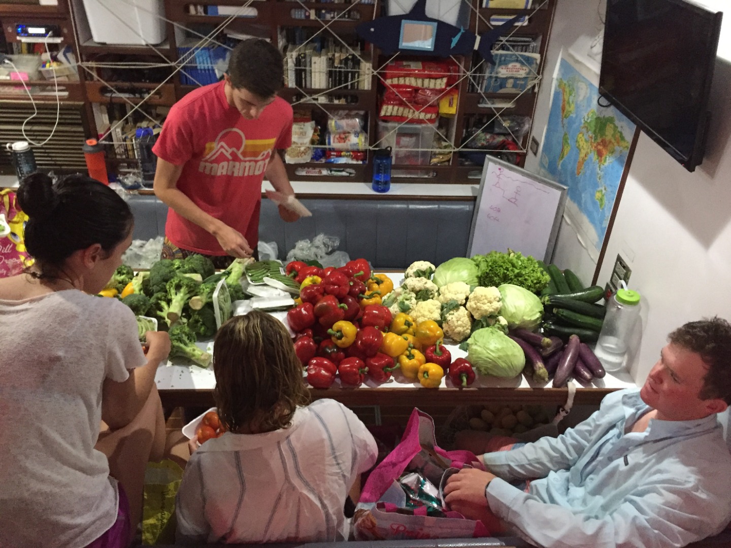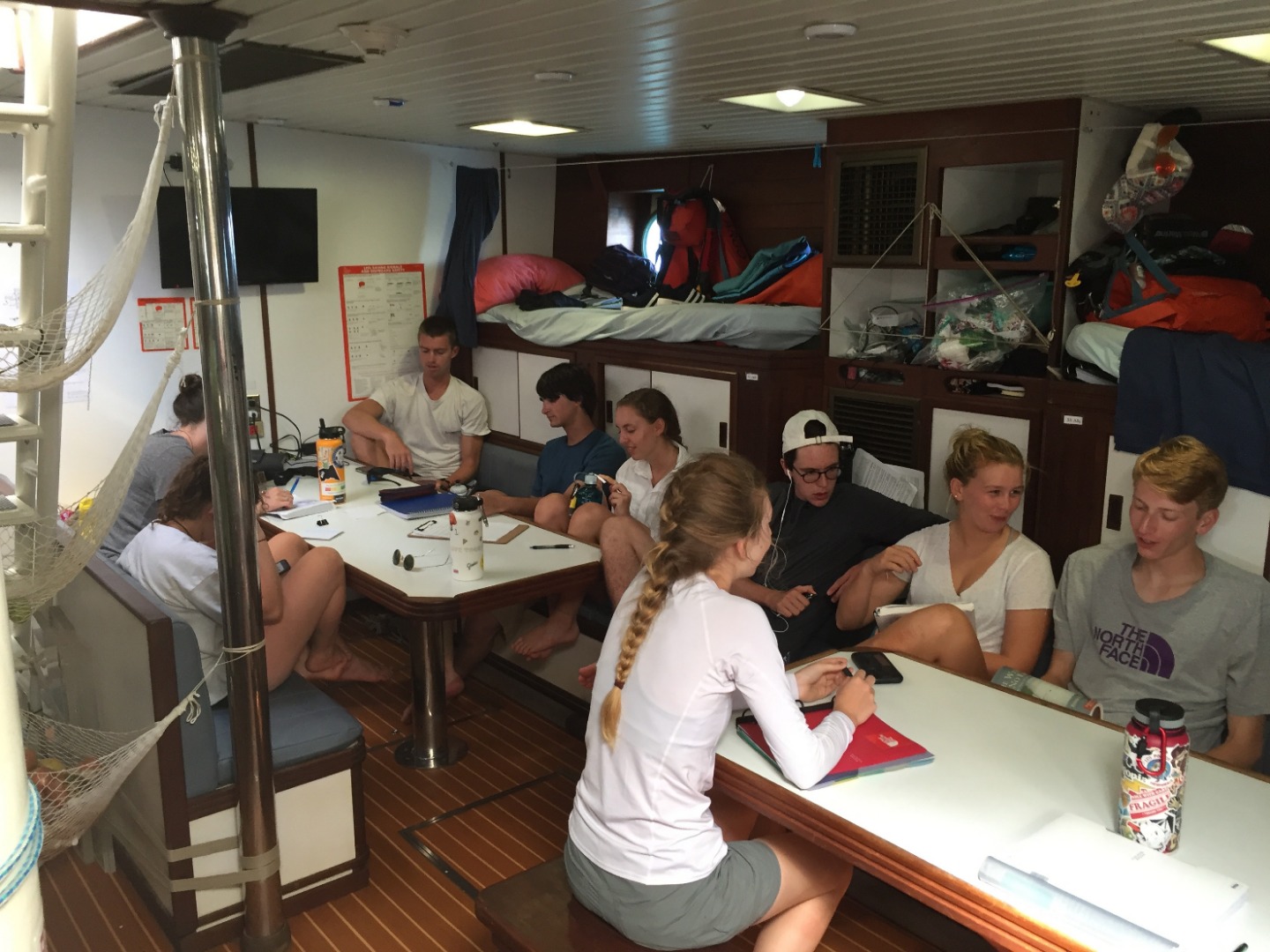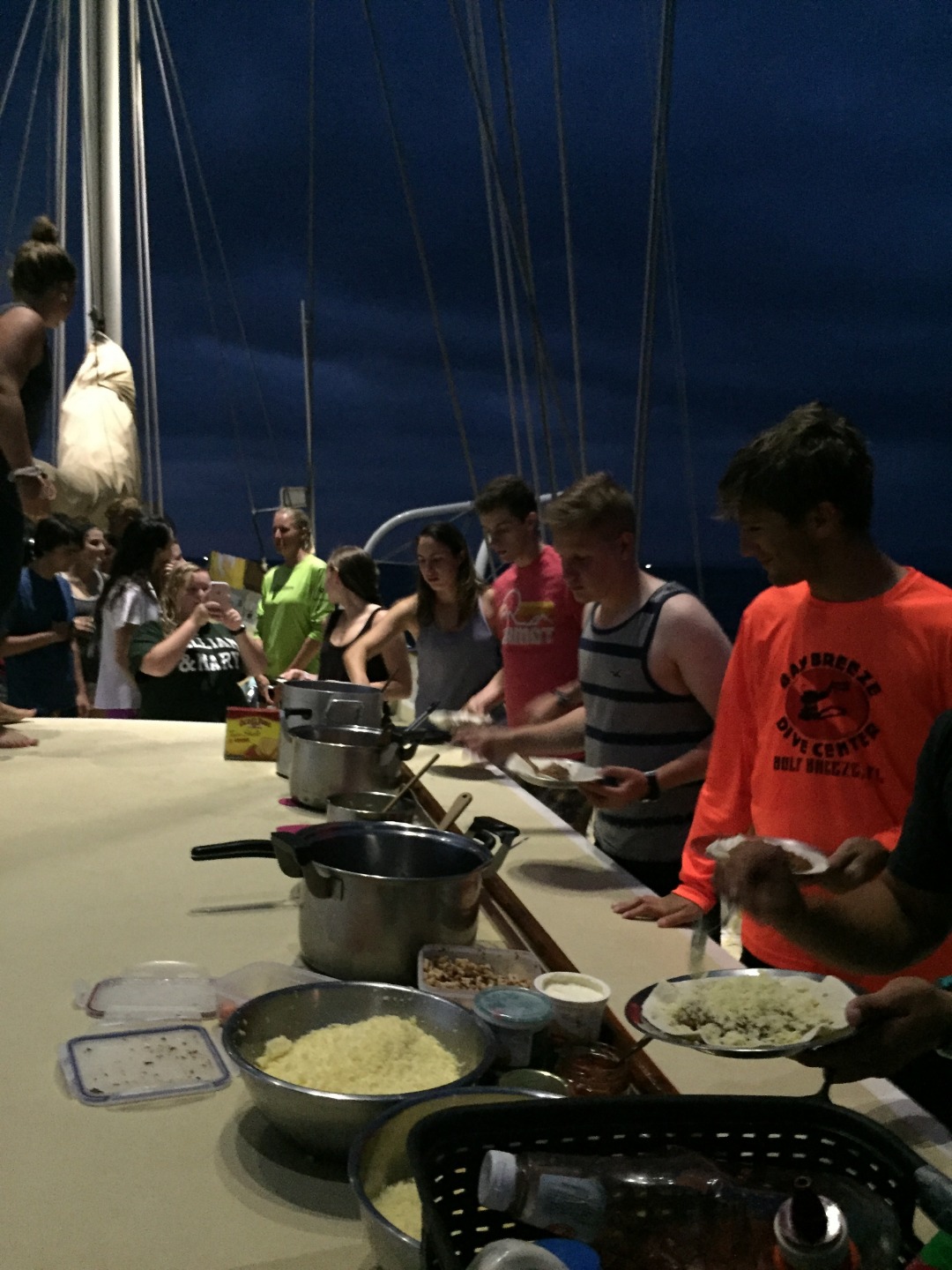 Today in the wee hours of the morning, we dropped anchor in Kupang, Indonesia! We spent the morning doing Boat Appreciation – a deep clean of Argo to keep her looking sparkly and clean. Floors were scrubbed, fridges were cleaned, and LOTS of laundry were folded and put away. Indonesian customs officials came by to clear us into the country, so we also tidied up the boat for them. At lunch, we had three-bean soup with rice. Afterward, we split into groups based on dive skill levels and began watching some diving videos to prep for our first dives on the voyage in a few days! Tina and Steph spent the afternoon buying provisions in Kupang (pretty sure they bought out most of the grocery store), so when they got back, everyone helped to put away groceries in the galley. I’ve never seen so many bell peppers shoved into a fridge at once. After provisions were put away, we had a delicious dinner of Mexican food (thanks to Carolyn, Eric, and today’s chefs!). We have a free evening to start working on some assignments or possibly just get some sleep. Now that we’re anchored, we only run hour-long anchor watches through the night, so hopefully, we’ll all be able to catch some extra z’s.