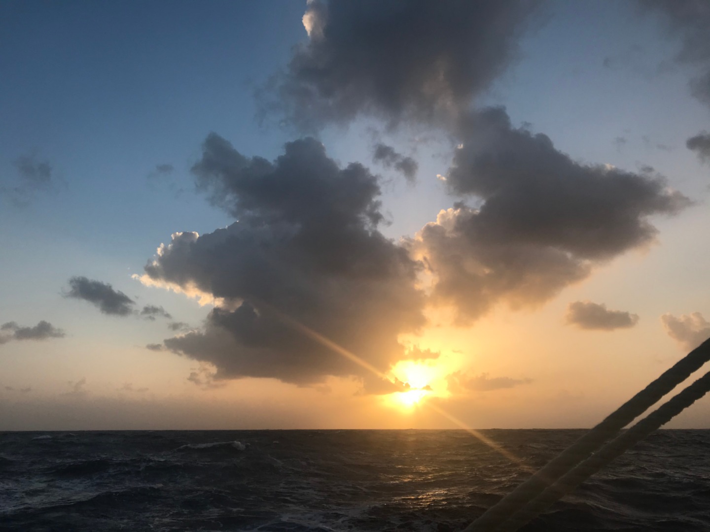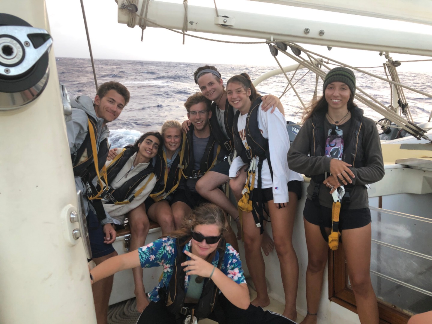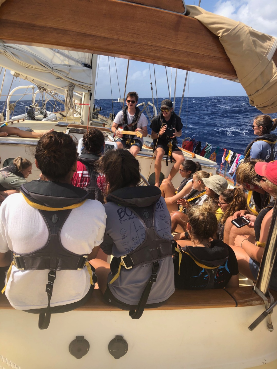 Today was a beautiful and sunny day with quartering seas and a nice wind around 15 to 20 knots. Argo hit a top speed of 11.3 knots while surfing down a wave this morning which is quite fast as we have traveled 151 miles since midnight with an average speed of around 8 knots. This afternoon we had our oceanography class where Jake and Michael presented their research paper presentations. In the lecture, we learned about marine pollution, especially plastic. After oceanography, we had leadership with Tim, where we talked about “being the change.” In the middle of class, Tim decided that we should do some star jumps, which helped wake everyone up. For dinner, we had some wonderful orange chicken cooked by Amanda, Lolo, and Smash. We were also treated to some blondies, which I loved that were cooked up by our bread maker Mella. We also just reached 5,500 miles on our total trip log, which I think is a pretty long way. We are loving our 2nd ocean crossing of the semester, and we are also looking forward to arriving in the Caribbean and getting started with diving.