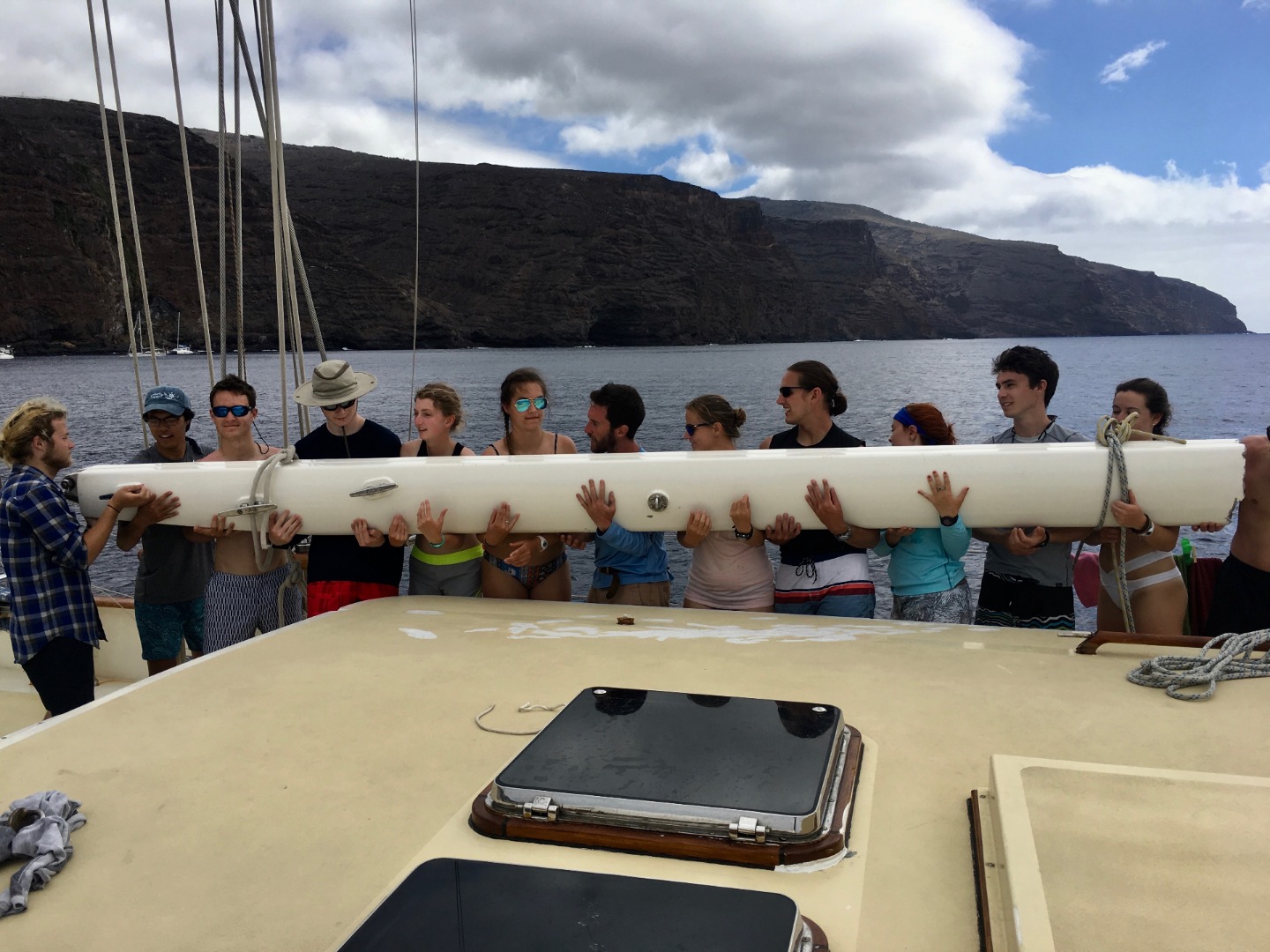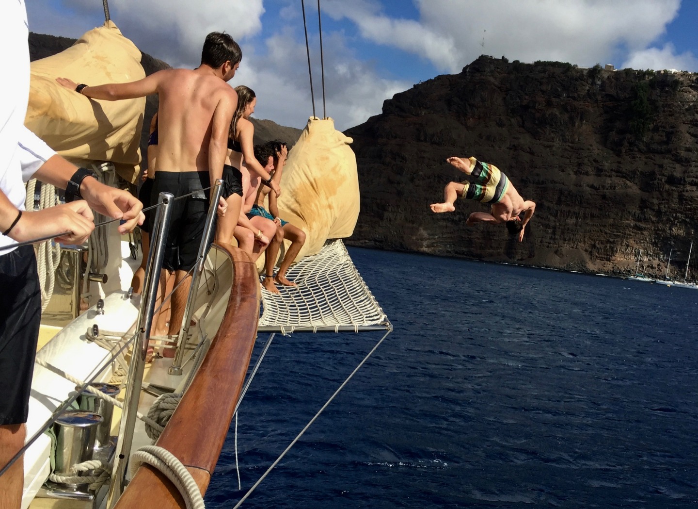 After a lengthy 12-day passage from Cape Town, we finally caught sight of St. Helena and are now anchored just offshore. Early this morning, we were boarded by customs and immigration, after which we took some time to give Argo some love with a deep clean, aptly called a Boat Appreciation. Right before lunch, we spotted a huge pod of dolphins just a few meters from the boat the perfect excuse for a first jump overboard! Later in the day, after taking down the other half of our broken boom, everyone completed the swim test of three laps around the boat, followed by a 10-minute tread. With the rest of the afternoon relatively free, everyone enjoyed a much-needed relaxing afternoon of no classes and doing various tricks off the side of the boat. As the sun started to set, everyone participated in refreshing ocean showers before enjoying a delicious dinner of rolls and beef stroganoff. It’s been a long day, and after Tina’s destination presentation, we all perused the many pamphlets on the island Lindsay brought back for us. Everyone is exhausted, to say the least, but stoked for tomorrow’s snorkel with whale sharks and finally getting to set foot on land again.